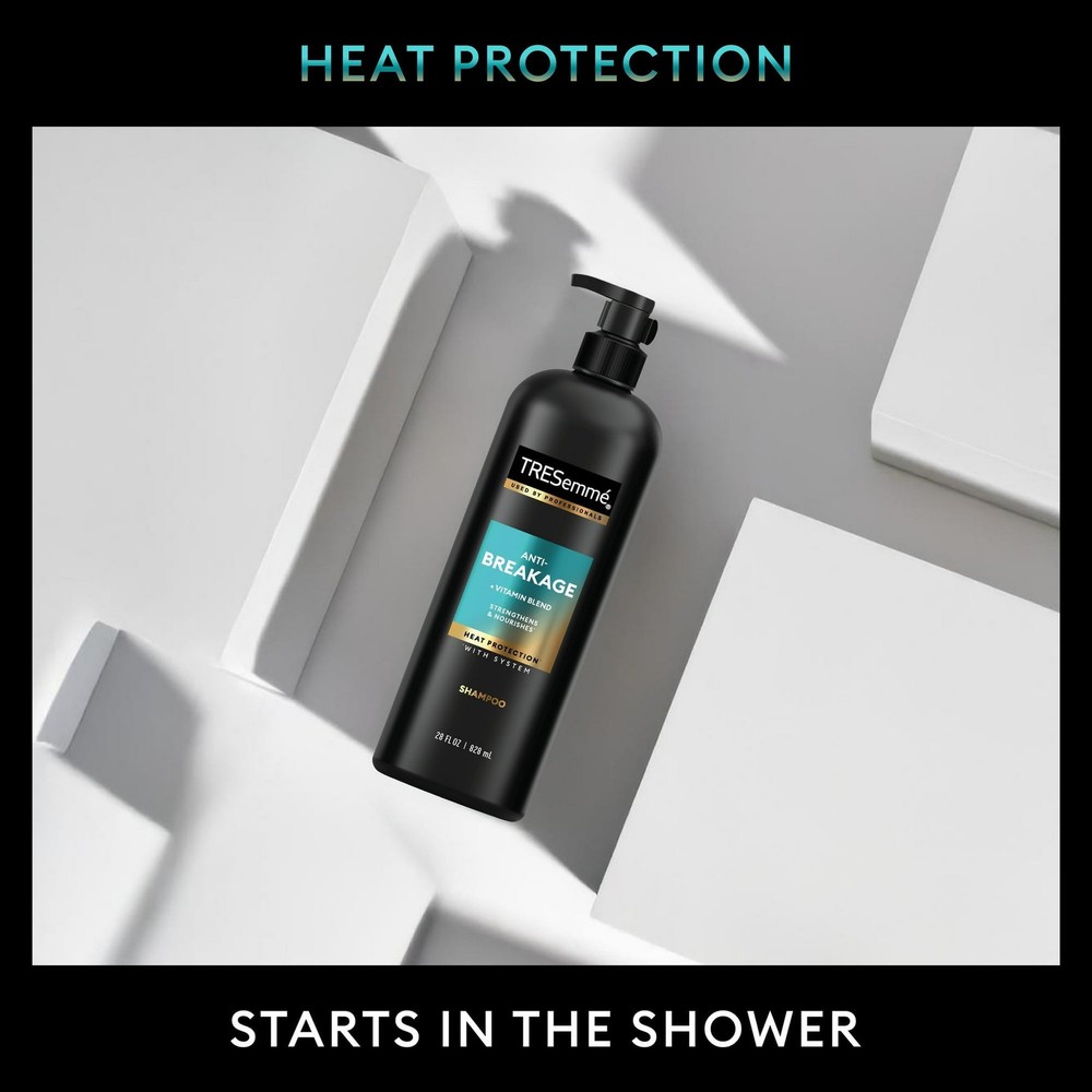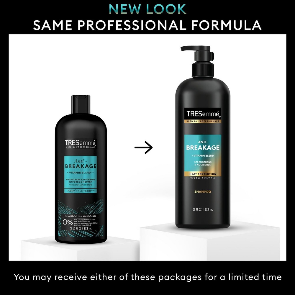 Tresemme Anti-Breakage Vitamin Blend Shampoo Unisex 28oz (2 Pack) TRESemme Anti-Breakage hair shampoo strengthens and nourishes damaged strands, leaving hair healthy-looking and strong. Brushing. Combing. Styling. No matter how gentle you are, all these can cause breakage. Say goodbye to breakage. About this item Infused with a vitamin blend, our Anti-Breakage strengthens hair to protect it from breakage and visibly repairs to leave it looking healthy and ready for any style. This Shampoo is formulated 0% parabens, mineral oil, and DMDM hydantoin and is Certified Cruelty-Free by PETA. Get heat protection that starts in the shower with Anti-Breakage Shampoo & Conditioner. For a limited time, you may receive products with our new or previous packaging design. After washing with Anti-Breakage Shampoo and Conditioner, follow with Protecting Heat Styling Spray for heat protection before styling, and lock in your style with Extra Hold Hairspray. You can count on TRESemmé for trend-inspired, professional-grade products designed to maximize ooh la la in the everyday. We’ll be here to help you style your hair Adult Use Ingredients Water (Eau), Sodium C12-13 Pareth Sulfate, Cocamidopropyl Betaine, Sodium Chloride, Cyanocobalamin, Panthenol, Ascorbic Acid, Tocopheryl Acetate, Niacinamide, Biotin, Dimethiconol, Fragrance Parfum), Citric Acid, Glycerin, Sodium Benzoate, Glycol Distearate, Carbomer, Sodium Laureth Sulfate, Tea-Dodecylbenzenesulfonate, Cocamide Mea, Guar Hydroxypropyltrimonium Chloride, Disodium Edta, Peg-45m, Ppg-9, Amyl Cinnamal, Benzyl Alcohol, Limonene, Linalool, Mica (Ci 77019), Titanium Dioxide (Ci 77891)