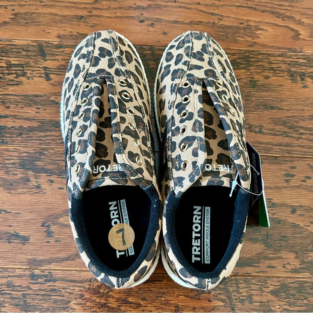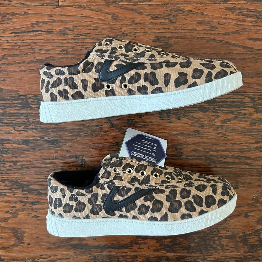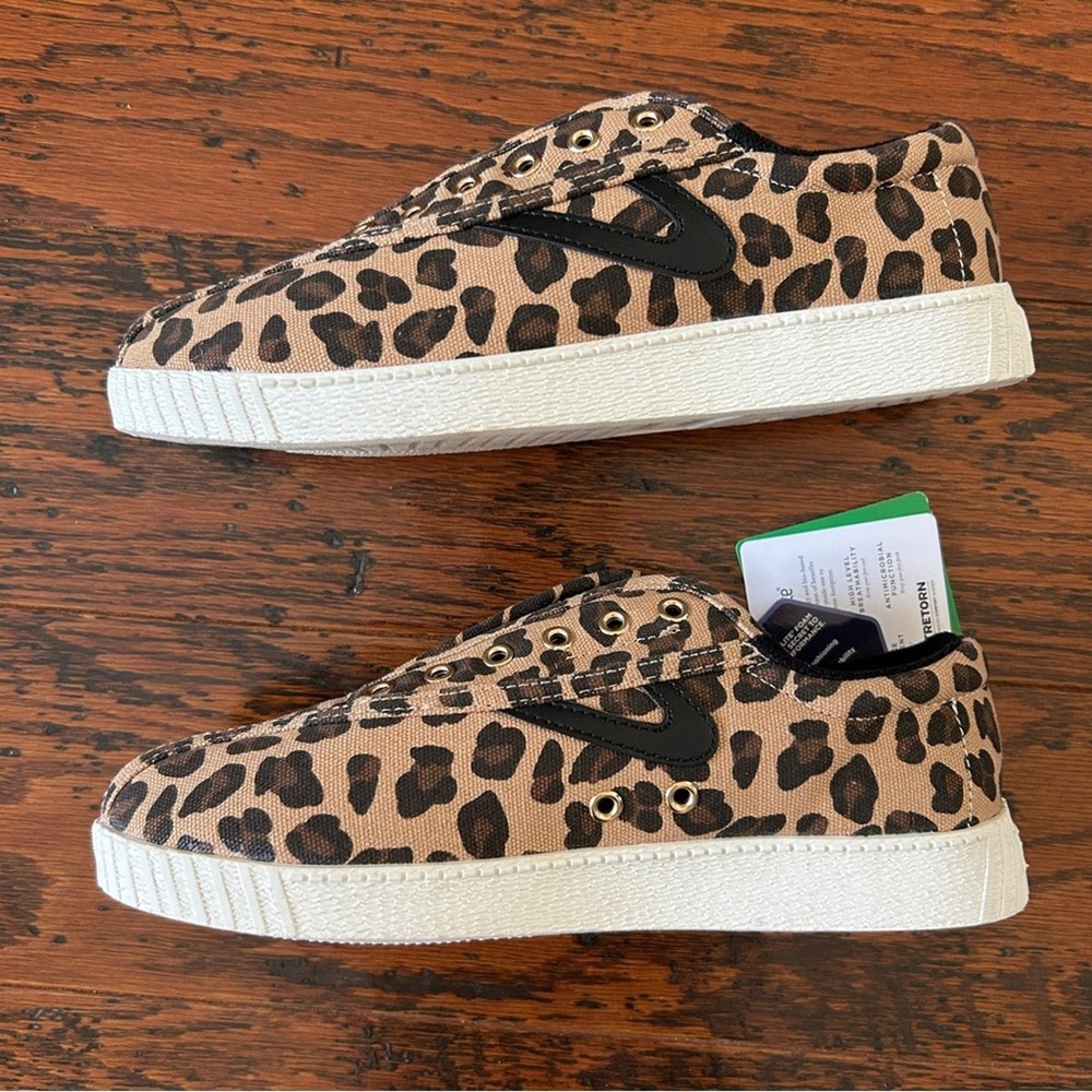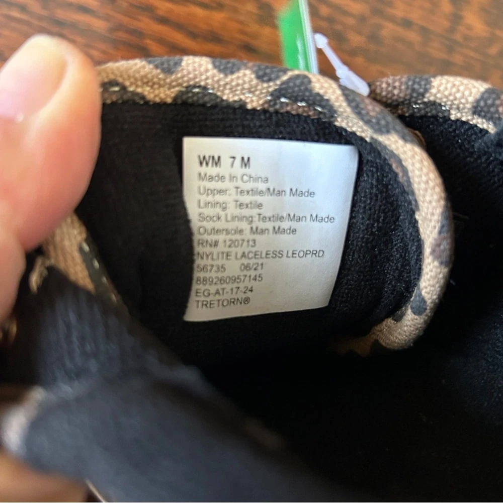 Tretorn No Lace Leopard Print Sneakers Brown/black - Size US 7 NEW with original tags - $65 Retail With a padded collar, this slip-on sneaker keeps you effortlessly comfortable all day on a cushioned footbed. Lightweight with high level breathability 5% recycled rubber content Antimicrobial Textile upper/synthetic lining/rubber sole Imported Tretorn Leopard Print No Lace Slip-on Sneakers Size US 7 NWT