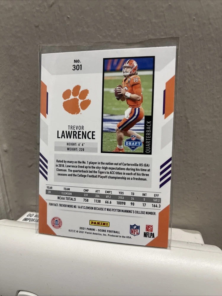 This Trevor Lawrence 2021 Panini Score Football Rookie RC #301 Clemson LD20 trading card is a must-have for any avid collector. Featuring a standout rookie player from the Clemson Tigers, this card is sure to be a valuable addition to your collection. With its sleek design and high-quality manufacturing by Panini, this card is a top-of-the-line sports trading card. It is perfect for fans of football and collectors alike who are looking for a valuable piece to add to their collection. Don't miss out on the chance to own this exceptional card.