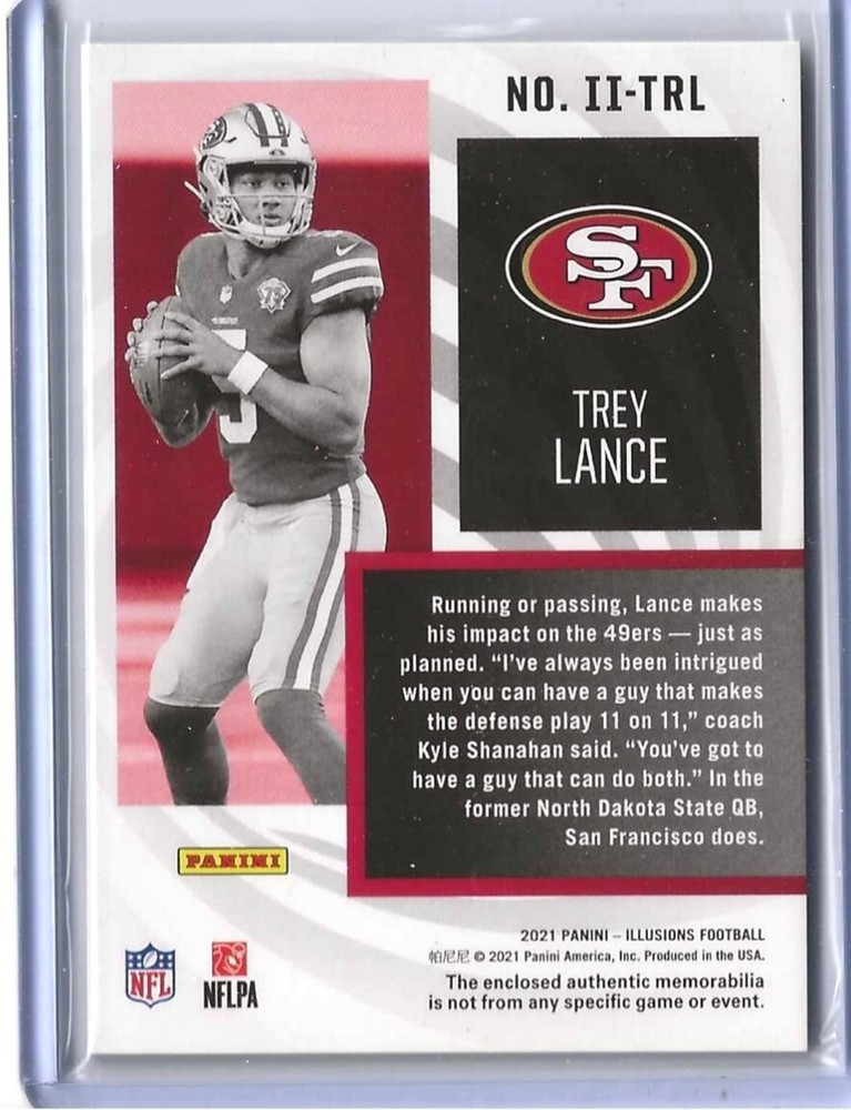 Here's a 2021 Panini Illusions Trey Lance Instant Impact Rookie Patch from pack to top load holder (Ex-Mt+). This great high $$+ bv card will make a great addition to any collection. Buyer to pay upon purchase to include $1.49 s/h. I don't accept returns so check the scans and ask questions before bidding. Check out all my other items.