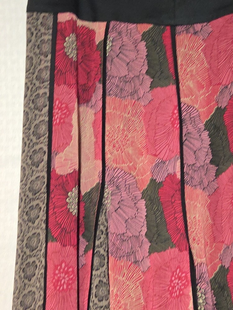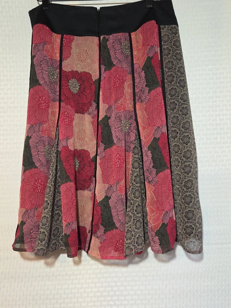 The Tribal Women's Size 6 Small S Multi Fabric Swing Skirt with a Black Waistband is a versatile and stylish piece perfect for various occasions. This knee-length skirt features a floral pattern in multiple colors, with a zip closure and pleated accents. Made from polyester, it offers a flare style that is ideal for summer, fall, and spring seasons. Whether for travel, weddings, parties, or workwear, this skirt from the Tribal brand is sure to make a statement with its bohemian, retro, and festival-inspired theme. Floral color Skirt Fairy Goth Swing Purple Black Lined There are belt loops on the front and back but there isn't a belt Colorful Unique Artsy