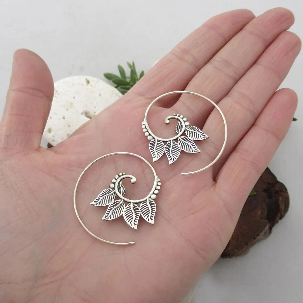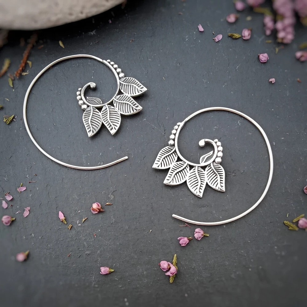 Leaf round spiral threader earrings in sterling silver. Nickel FREE These hand crafted spiral earrings are inspired by a Tribal Indian design. They are a beautiful ornate pair of earrings with a stunning Leaves design, intricate pattern for all nature Lovers! These light weight earrings are easy and comfortable to wear, remind us Fantasy and Elf stories. They are the perfect Spiral earrings for Festivals and Parties in the Nature. Don't miss them! Dimensions: Spiral Diameter: 3.5 cm Weight: 4.7 grams per pair SOLD ONLY IN PAIRS! Delivery Information All items dispatched from the UK. Item will be carefully packaged in eco-packaging to safeguard it during delivery and with our branded satin pouch ready as a gift. Standard Tracked 48 Shipping with Royal Mail or Yodel included FREE . Tracking number details will be sent after dispatch (which is usually within 1 working day of purchase. Weekends/festivities excluded). Faster shipping options also available for the UK. Worldwide shipping available with Royal Mail Tracked & Signed. Returns accepted within 14 days of receipt. At customers’ expense.