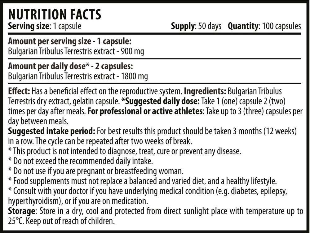 Tribulus Terrestris 3 x 100 capsules 900mg Bulgarian Tribestan DRY Extract NEW IMPROVED FORMULA GMP Certified Tribulus terrestris is a flowering plant that belongs to the Zygophyllaceae family that thrives in warm temperate and tropical climates in southern Europe, southern Asia, throughout Africa, and Australia. It grows in places with dry, arid climates and poor soil. It is also commonly burra gokharu, puncturevine, caltrop, cathead, yellow vine, goathead, and bindii. What are the benefits of Tribulus Terrestris? 1. It may improve muscle growth When it comes to boosting muscle growth, according to various research health experts ventured that by boosting the level of testosterone in the body, it could help gradually increase muscle mass. 2. It may boost libido Natural libido enhancers such as Tribulus has created a huge appeal simply because unlike libido enhancers in the market, it doesn't pose any serious side effects unless some of the ingredients in the supplement are contraindicated to one's current health condition. Tribulus Terrestris ' popularity is well known across the health and wellness community. Consquently, it is one of the best-selling natural testosterone boosting supplements today. Benefits of Tribulus Max Increases testosterone levels into the physiological range Improves strength and endurance in a natural way Helps to gain muscle mass faster and naturally accelerates fat burning Improves blood circulation Helps to lower the level of cholesterol in your blood Suitable for professional athletes who seek faster recovery Suitable for combination with other nutritional supplements and extracts Intake of Tribulus Max Nutrition Facts Serving size: 1 capsule (900 mg) Per container : 100 capsules Supply: 50 days per container Suggested daily dose : Take 1 (one) capsule 2 (two) times a day after meals. For active athletes : Take up to 3 (three) capsules a day between meals. Suggested intake period : For best results, this product should be taken 3 months (12 weeks) in a row. The cycle can be repeated after two weeks of break. Ingredients : Bulgarian Tribulus Terrestris herb, gelatin capsule. Storage : Store in a dry, cool, and protected from a direct sunlight place. Keep out of reach of children! Payment Methods - ebay managed payments Delivery methods: Economy services - 7-14 working days Expedited delivery by DHL express worldwide - 3-5 working days (it depends the customer`s location)