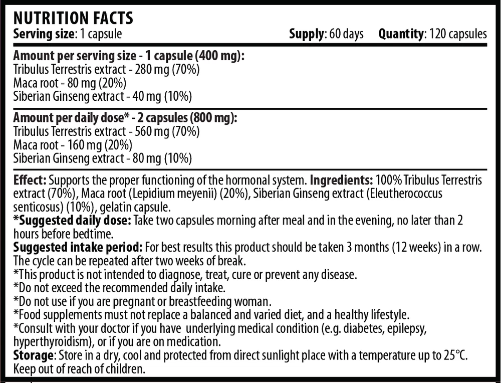 Tribulus for Women 120 capsules • • • FOOD SUPPLEMENT • • • Benefits of Tribulus for Women Helps the proper functioning of the hormonal system Helps to normalize and increase estrogen levels Increases fertility Regulates metabolism Helps to lose excess weight Provides vitality and energy Normalizes blood pressure Intake of Tribulus for Women Nutrition Facts Serving size: 2 capsules Per container : 120 capsules Supply: 60 days Suggested daily dose : Take 1 capsule Tribulus for Women in the morning after meal and take 1 capsule in the evening, no later than 2 hours before bedtime. Suggested intake period : For best results this product should be taken 3 months (12 weeks) in a row. The cycle can be repeated after two weeks of break. Ingredients : 100% Tribulus Terrestris extract (70%), Maca root (Lepidium meyenii) (20%), Siberian Ginseng extract (Eleutherococcus senticosus) (10%), gelatin capsule. Storage : Store in a dry, cool and protected from a direct sunlight place. Keep out of reach of children! Payment Methods - PayPal Delivery methods: Economy services - 7-14 working days Expedited delivery by DHL express worldwide - 3-5 working days (it depends the customer`s location)