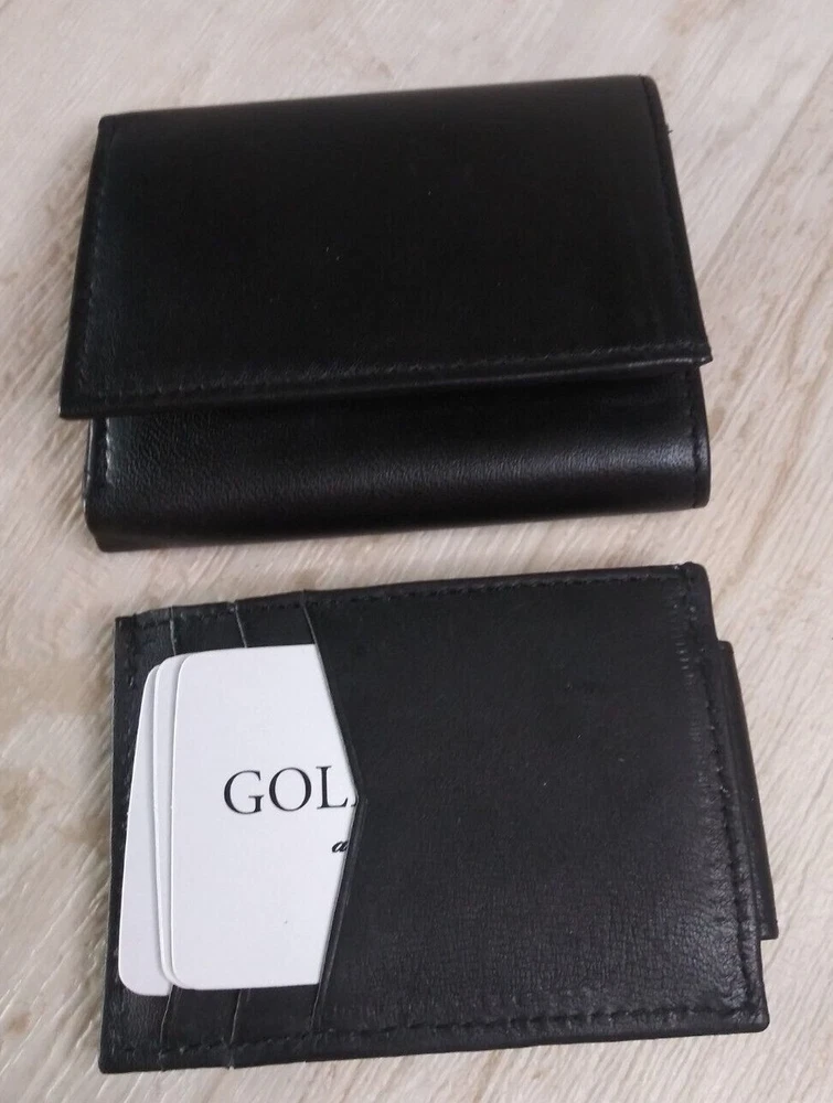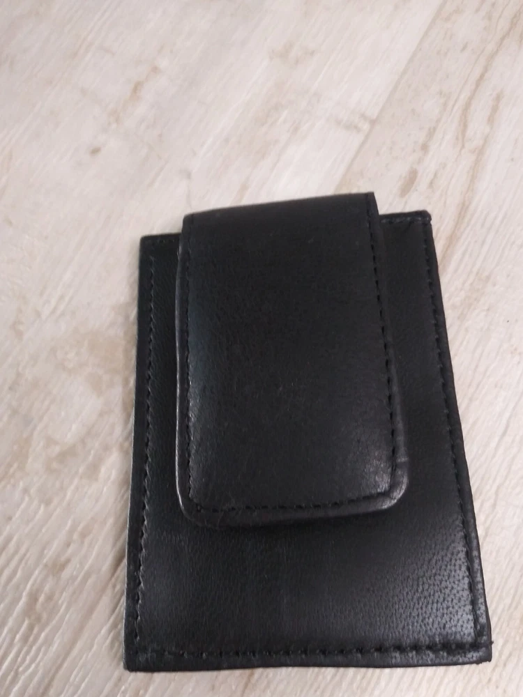 New Black Leather Trifold men's wallet and money/card magnetic clip. There is a little worn spot (defect) see photos but not noticeable if folded with the defect on the inside. Has original package.
