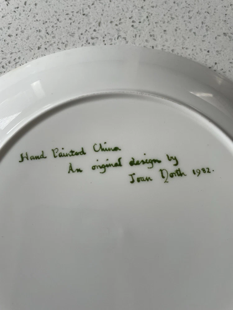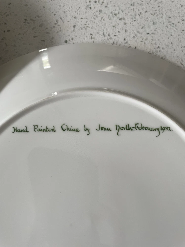 A set of 3 hand painted signed decorative wall plates. Hand painted by Joan North. 1982. Perfect condition. 2 are exactly the same size at 10.5 inches, the third is slightly smaller and shallower at 10.3 inches and is unsigned but bought at the same time as the other plates.