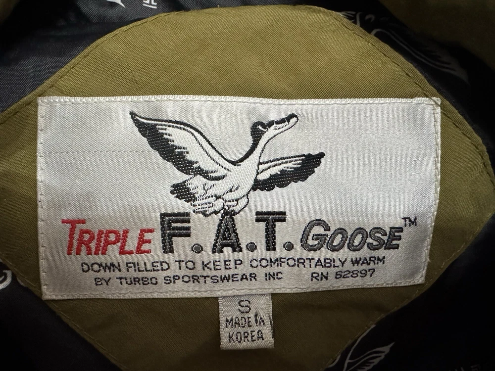 Stay warm and stylish this season with this vintage Triple F.A.T. Goose puffer jacket. The solid green color and hooded design make it a trendy addition to your wardrobe. The jacket is made of durable polyester and features a quilted and insulated design, perfect for fall, winter, and spring. This mid-length jacket has a regular fit and long sleeves, making it comfortable for everyday wear. The jacket is perfect for casual occasions and features a zip closure for added convenience. The Triple F.A.T. Goose brand is known for its quality and this jacket is no exception. Stay warm and fashionable with this must-have jacket.