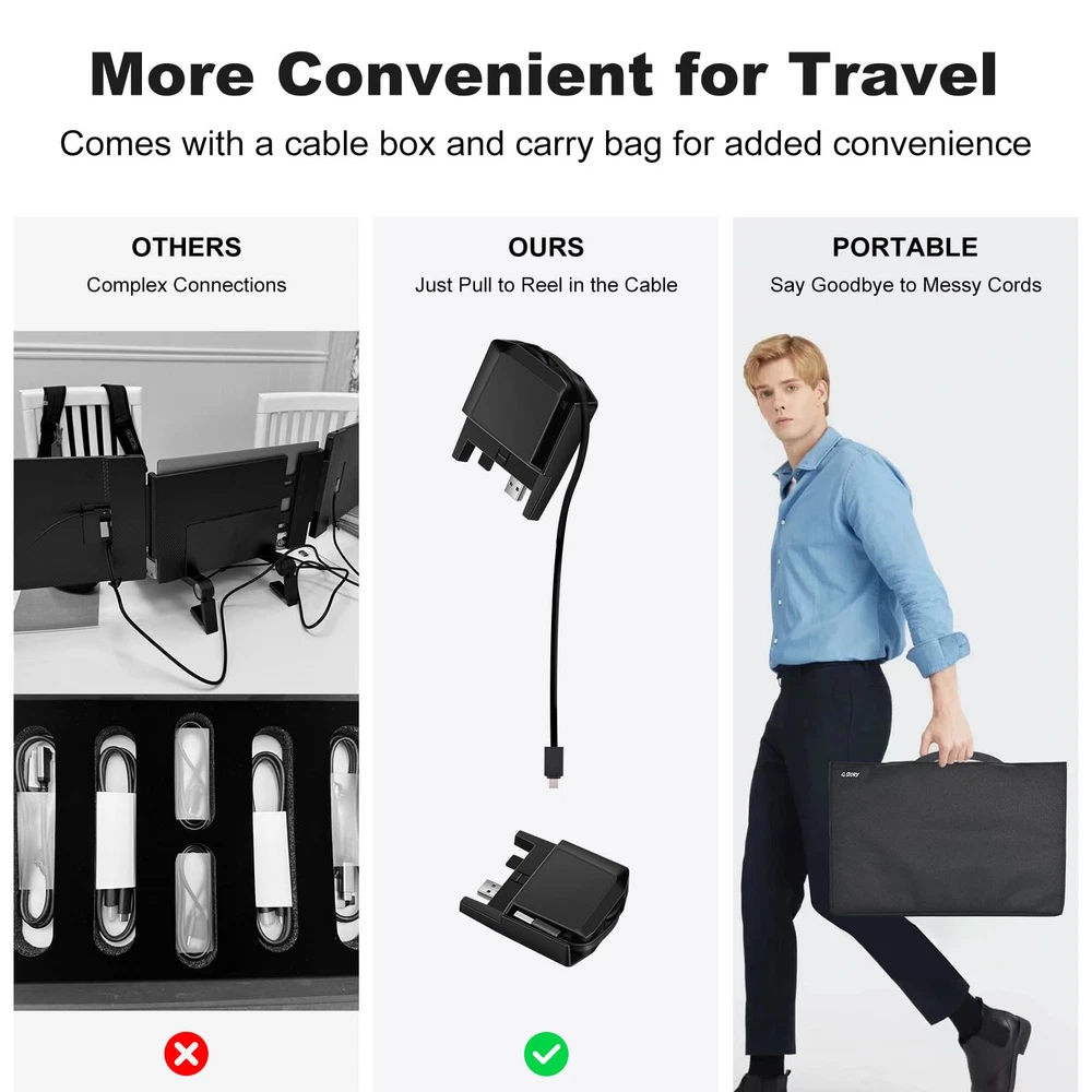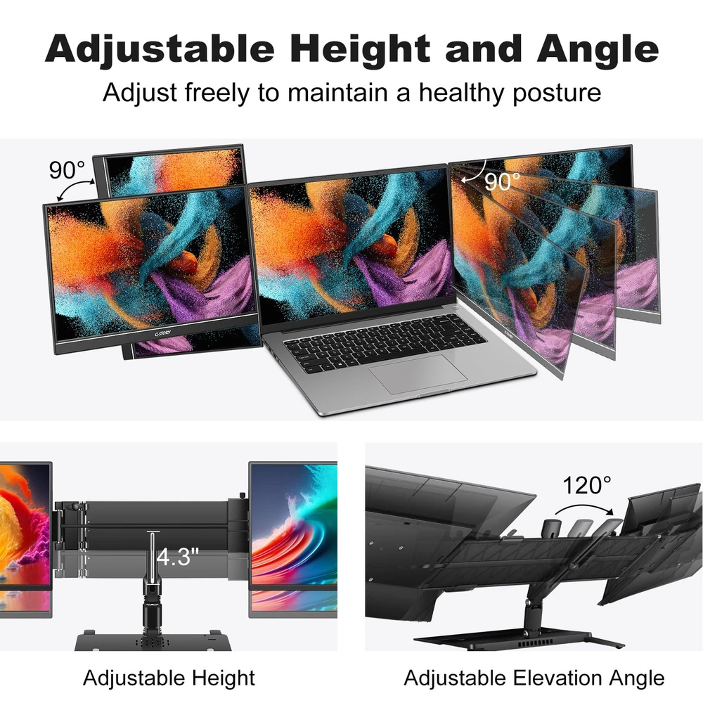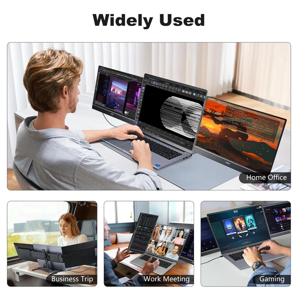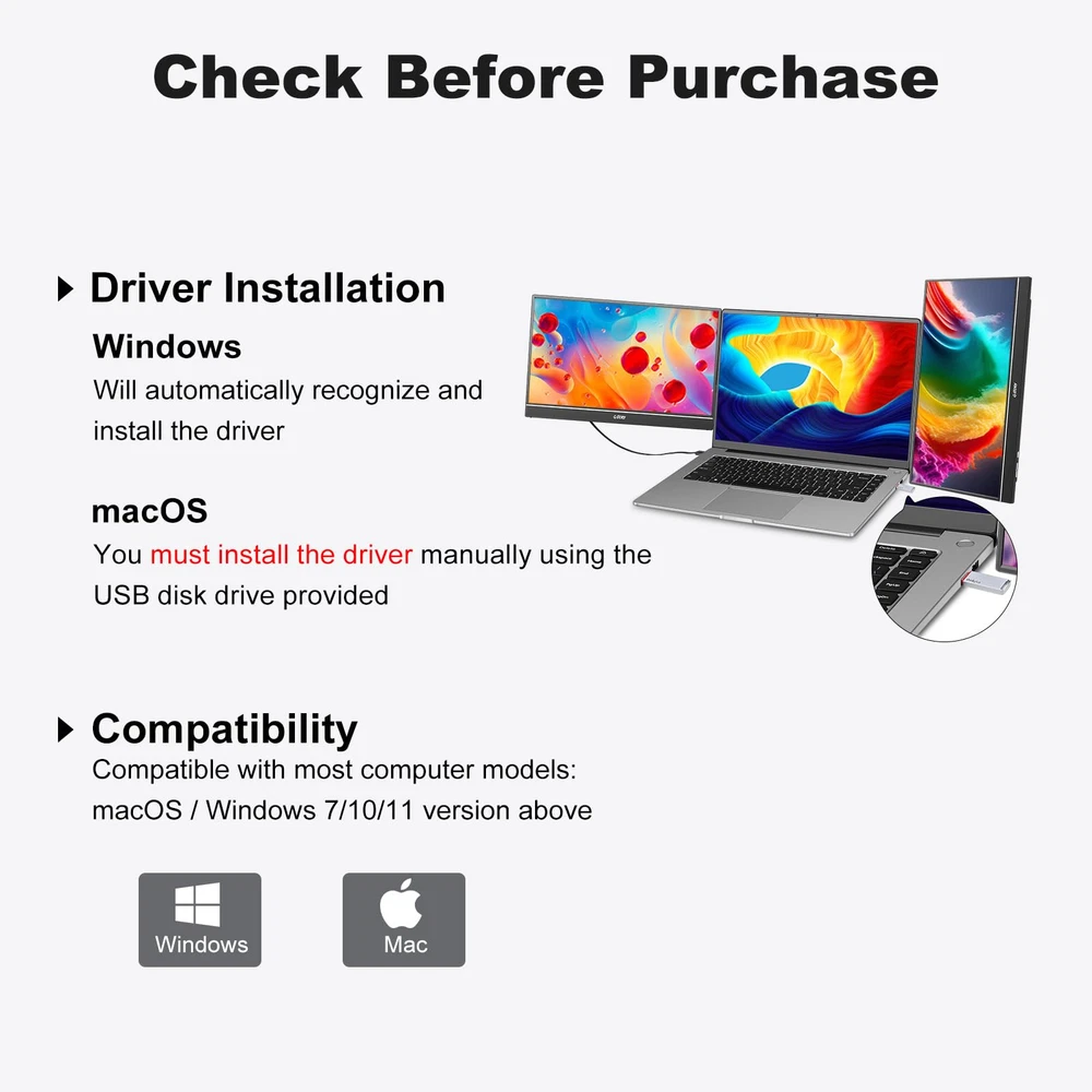 [14-inch Dual Screen for Laptop] laptop screen extender offers a 1920x1080 resolution and 72% NTSC color gamut, providing a bright and high-quality viewing experience. This monitor extender allows for independent backlight brightness adjustment, ensuring friendly eye protection and reducing fatigue. [Widely Compatible] The triple laptop screen extender fits 13"-17.3" laptops. Compatible with Windows (support 7/10 v1607 and above/11), Mac ( support M1/M2 chips, need to install the driver). If you are not sure whether your laptop is compatible, you can get in touch with us to provide you with a solution and we will reply within 24 hours. [Triple Screen Laptop Monitor Extender] This portable laptop screen extender helps you multitask effectively by opening multiple applications simultaneously. It is perfect for home offices, remote workers, frequent travelers, online meetings, IT professionals, gamers, and more. By attaching dual extended screens to your laptop, you can enhance your productivity by up to 300%. [Perfect for Travel] Upgraded travel monitor for laptop 2 screens comes with a foldable stand and portable bag. Use the adjustable kickstand to find your favorite angle for working, playing games, or watching movies. With a single cable connection, you can say goodbye to multiple data cables and messy workstations. [Important Information Before Purchase] 1. For macOS, please use the provided USB disk drive to install the driver. Windows systems typically install the driver automatically. 2. If you experience issues such as only one screen displaying, screen flickering, or a black screen, it may be due to insufficient power from the laptop. Please connect an additional power source for the screen.