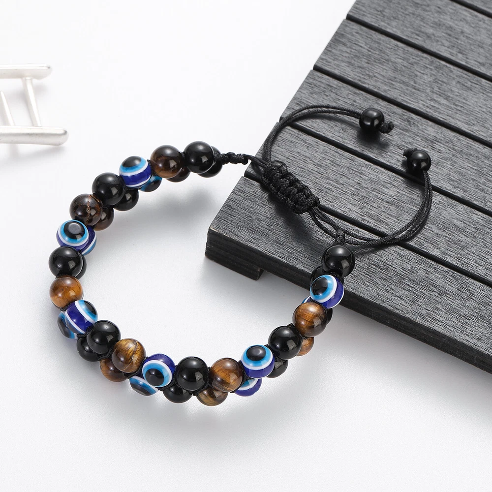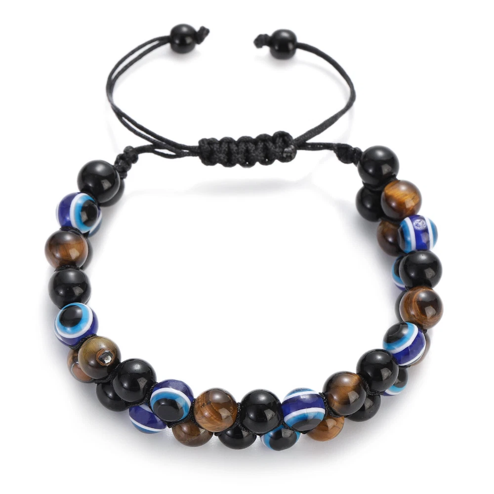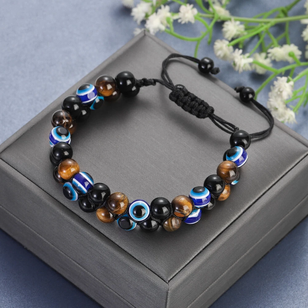 【Piritual Energy Healing Stone Bracelet】This healing crystal stones are known for their great energy.Black Obsidian have strong healing properties that provide power to face fears, absorb negative energy and transform stress into positivity. The brown tiger eye is noble and domineering,attracts wealth,brings strengthens belief and brave. The Devil's Eye is also called the Guardian's Eye. Not only can it protect the health of friends, loved ones,and family,but it can also bring luck to them. 【Exquisite Handmade Bracelet】Each healing stone has a natural texture, which has been polished by professional artisan to ensure that the stones are delicate.None of them is repeated. Every single piece looks similar but unique.We carefully select and craft each handmade bracelet,use the wave weaving method to weave three different healing stones together, which is very stable. The high quality beaded bracelets are durable and imply auspiciousness. 【Stretch Adjustable Design】This protection bracelet comes in stretch adjustable size design and is designed for people with wrist 6.7” - 8.3”. You can easily adjust to fit your hand circumference,and pair them with your other jewelry. This 8mm natural stones protection bracelet is good for men and women,no need to take it off when take shower or swimming.Whatever the occasion, this triple protection bracelet will look fantastic. 【Ideal Gift with Good Wishes】This triple protection bracelet can be a wonderful gift for your lover, mom, dad, kids, best friends and anyone who is important to you. It is a meaningful gift to bringing luck and prosperity and happiness.This is a good wishes for Christmas,Birthday, Mother's Day, Father’s Day, Anniversary, Graduation, Thanksgiving,Valentine's Day