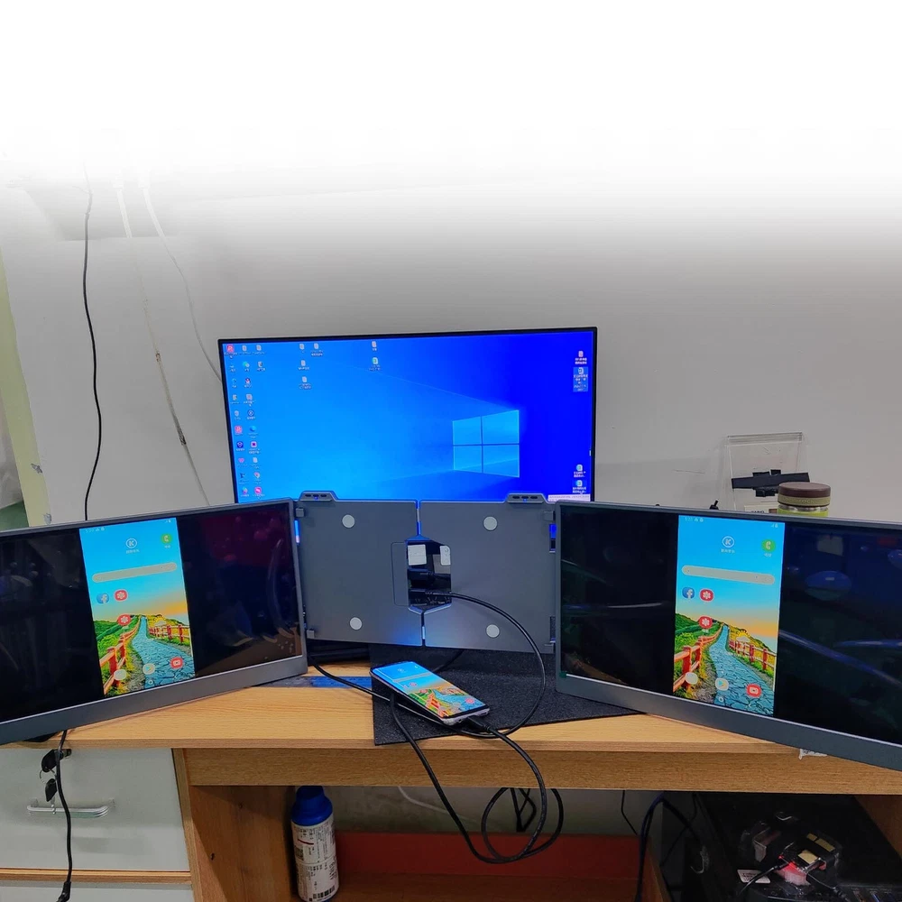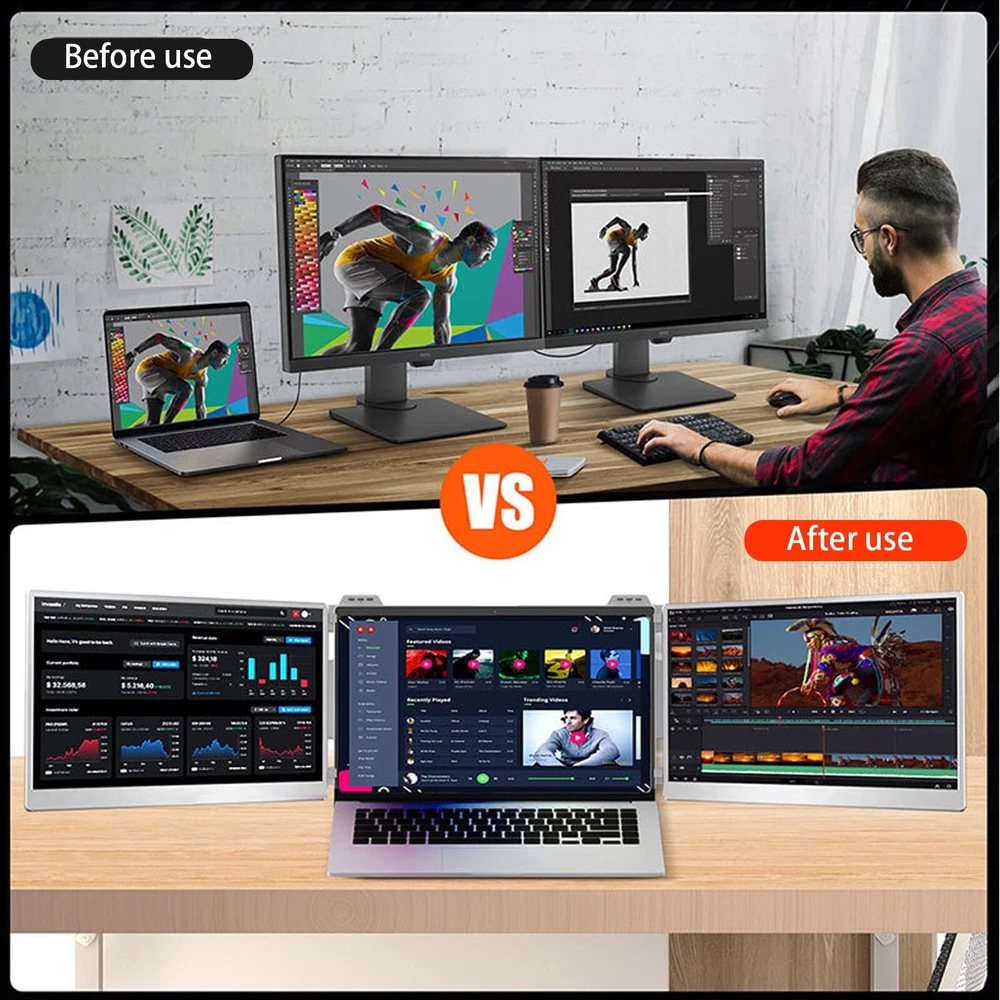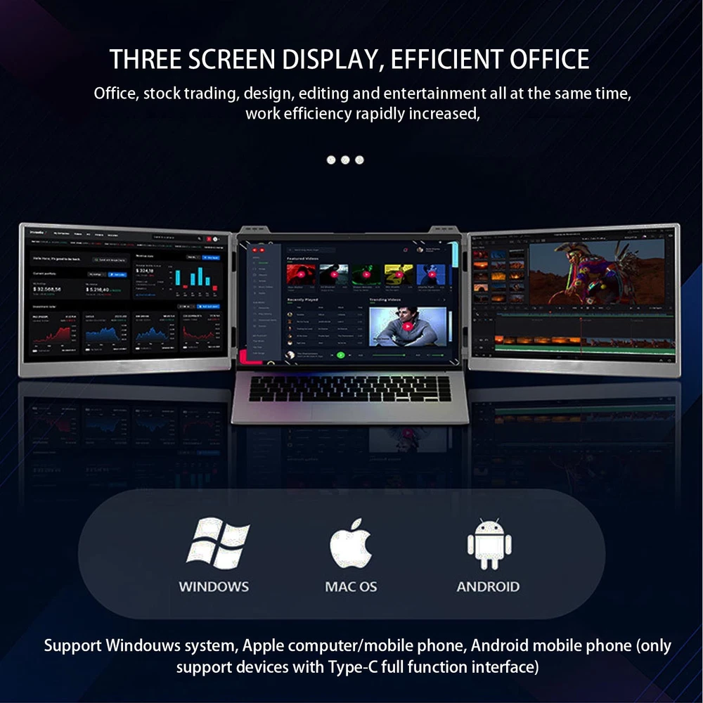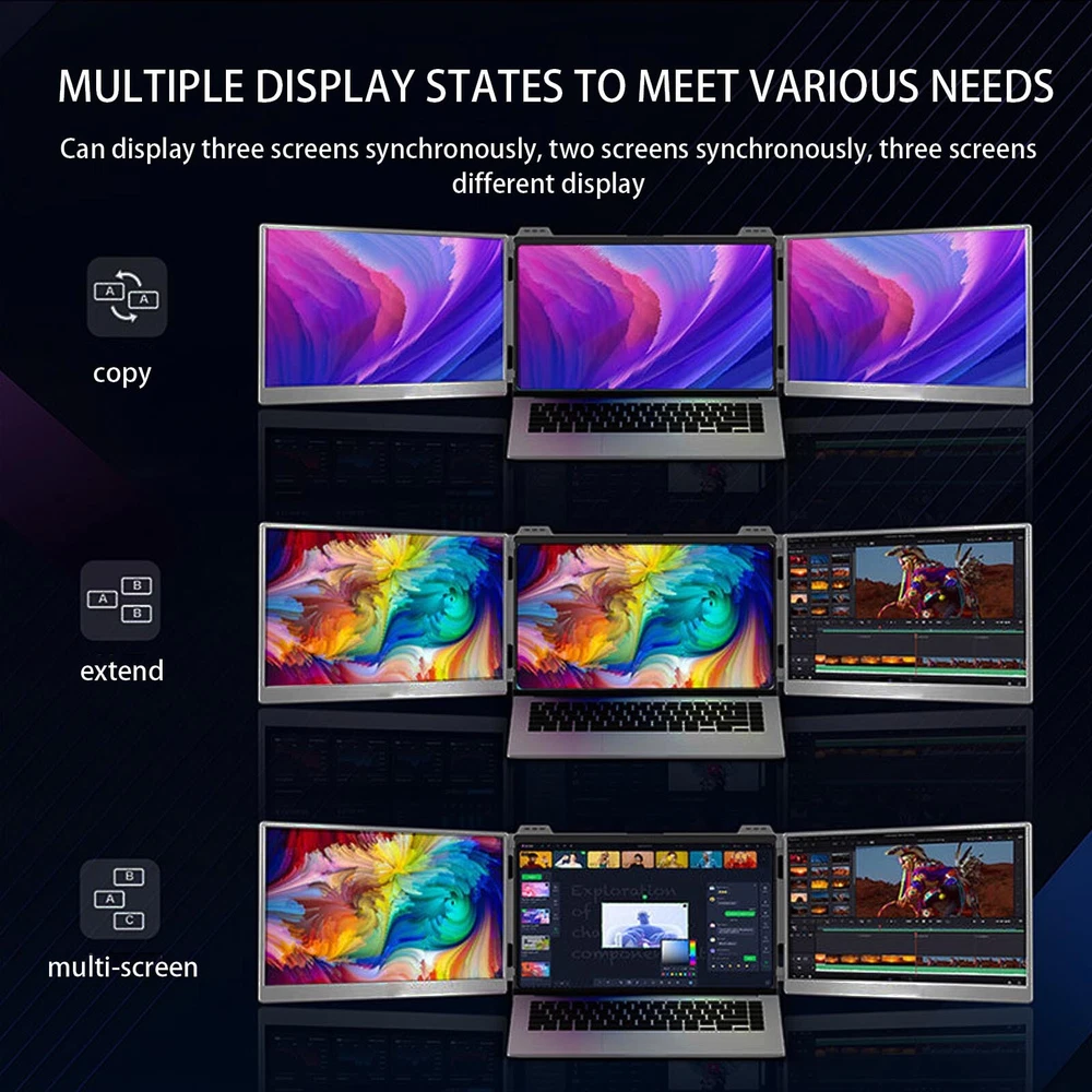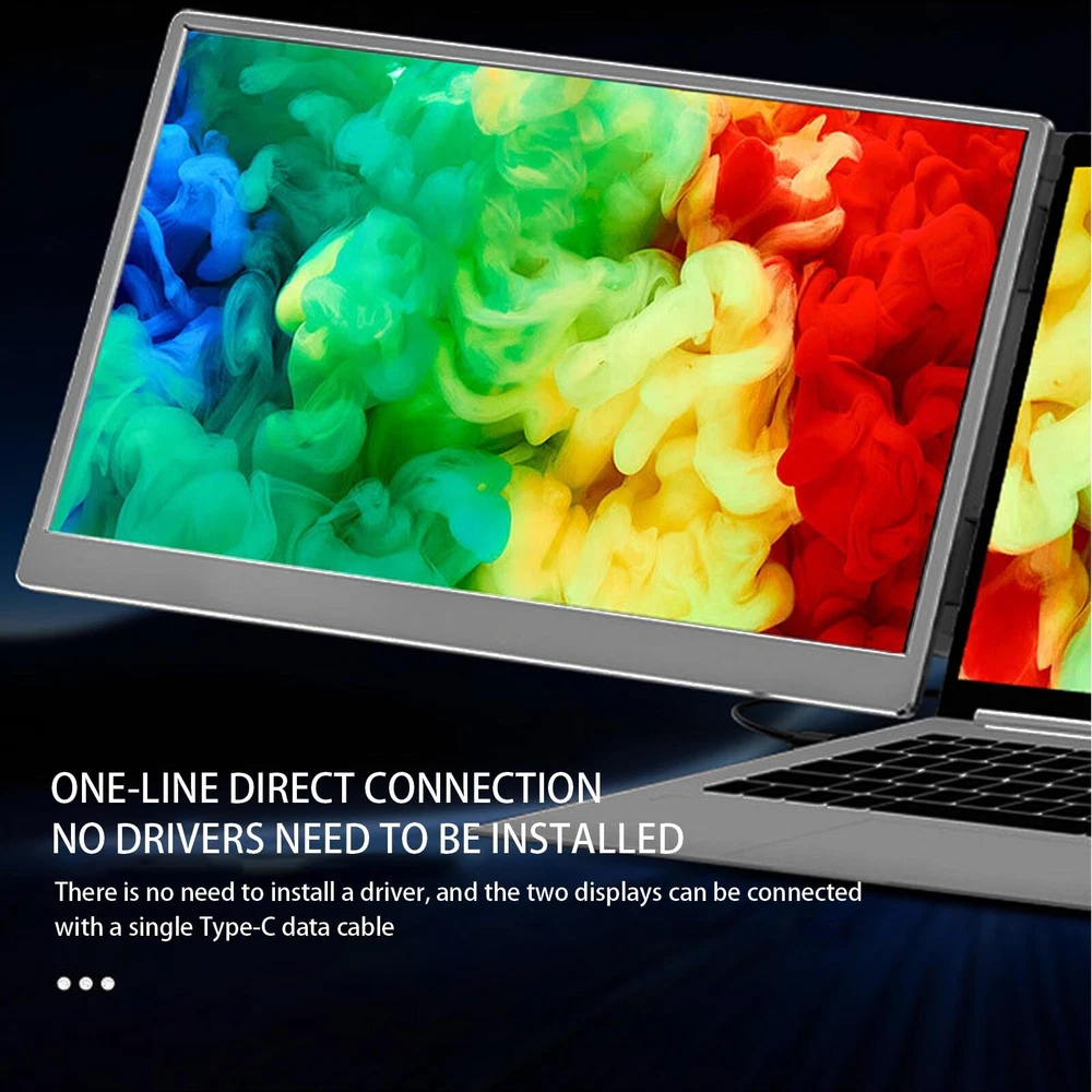 15.6-inch portable triple-screen display 1080P laptop dual display extender titanium color Three-screen display, efficient office: office, design, editing and entertainment are carried out at the same time, and work efficiency is rapidly improved. One-line direct connection: No need to install drivers, two displays can be connected with only one Type-C data cable. Rotatable bracket, angle can be adjusted The screen can be rotated at multiple angles, left: 0-210°, right: 0-210° Ultra-narrow frame and ultra-thin design High-end and fashionable appearance, simple and atmospheric, travel on business, put it in the bag and carry it with you Ultra-narrow frame 100% SRGB color gamut HDR high dynamic contrast 15.6 inches: recommended laptop size: 15.6”-16.1” Length (left to right): 310-375mm Width (top to bottom)>165mm Computer display thickness<8mm Payment: The buyer is responsible for any applicable import duties and local taxes. Usually there's not any charges for small parcel. But please verify with your customs before making your purchase. Return: If you are not completely satisfied with your purchase, simply return the item to us in its original condition within 14 days of receipt. We will issue a full refund on receipt, excluding the return delivery charge. About US: We are a professional foreign trade e-commerce company, mainly engaged in foreign trade B2C platform business. Our foucs includes instrument meters and accessories, household items, car accessories, Led lighting etc. Our company is energetic and creative and wish to bring you great service and amazing experience.