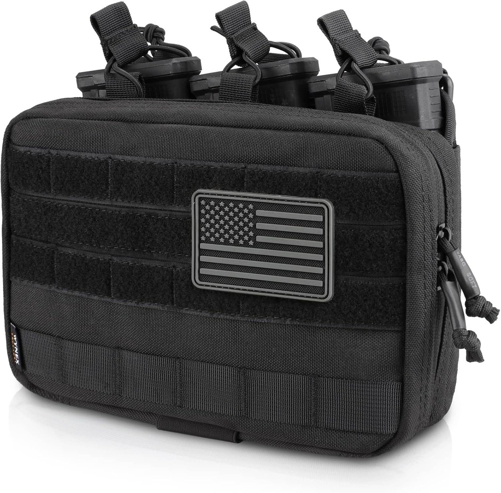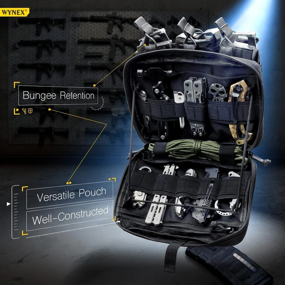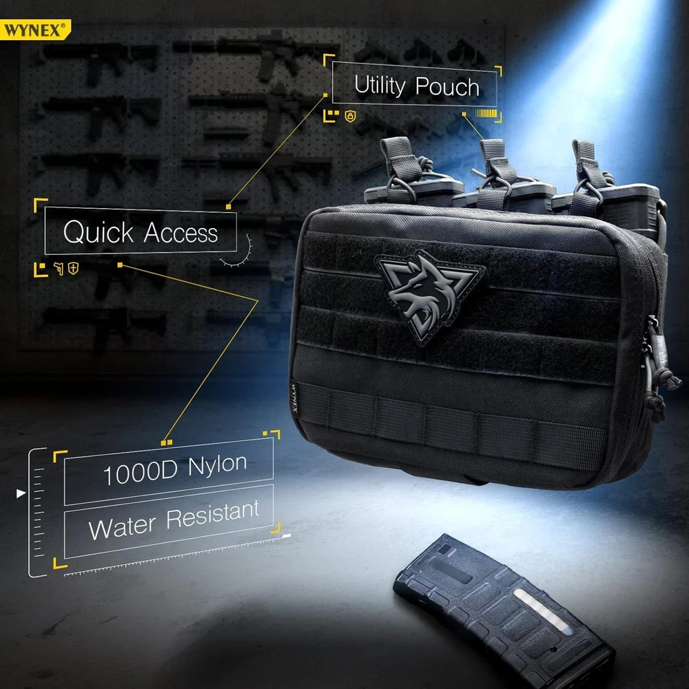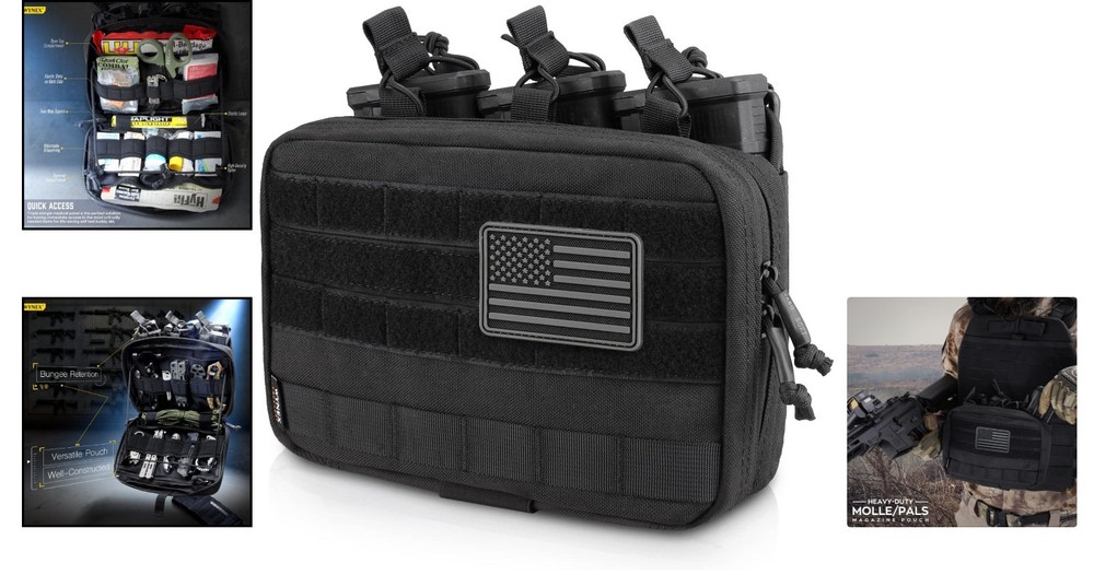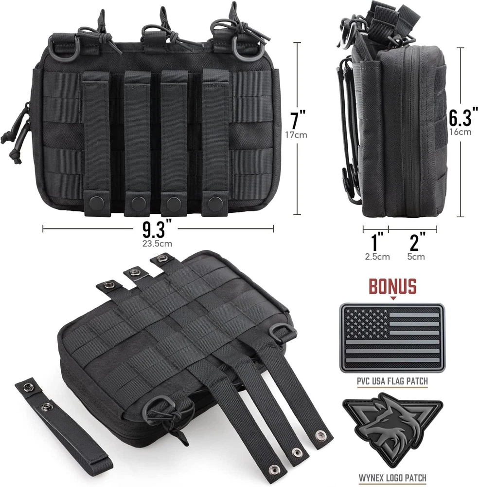 Product Dimensions: 9.3"l X 3"w X 7"h Item Weight: 9.52 ounces Item Height: 7 Inches Hidden Compartment: Material Type: Nylon Item Dimensions L X W X H: 9.3"l X 3"w X 7"h Event Type: Tactical Pouch Sport/Activity: Medical gtin13: Does not apply Closure: Zip Pocket Type: Utility Pocket Brand: Unbranded Item Depth: 3 inches Pocket Description: Utility Pocket Features: Adjustable Bungee Retention, Opens Flat, Molle Straps, Dual-Zip Closure, Heat Shrink Cover, Elastic-Banded Slots, Free Replacement Service Color: Black Closure Type: Zipper Signed: No Type: Molle Utility Tool Pouch Included Components: Pvc Rubber America Flag Patch, Wynex Logo Patch Size: One Size Position: Chest-mounted or open flat UPC: Does not apply Number of Pockets: 3 Material: Nylon, 1000D Nylon