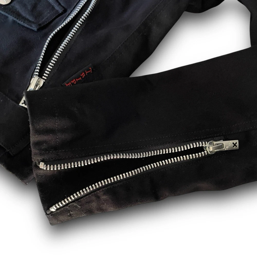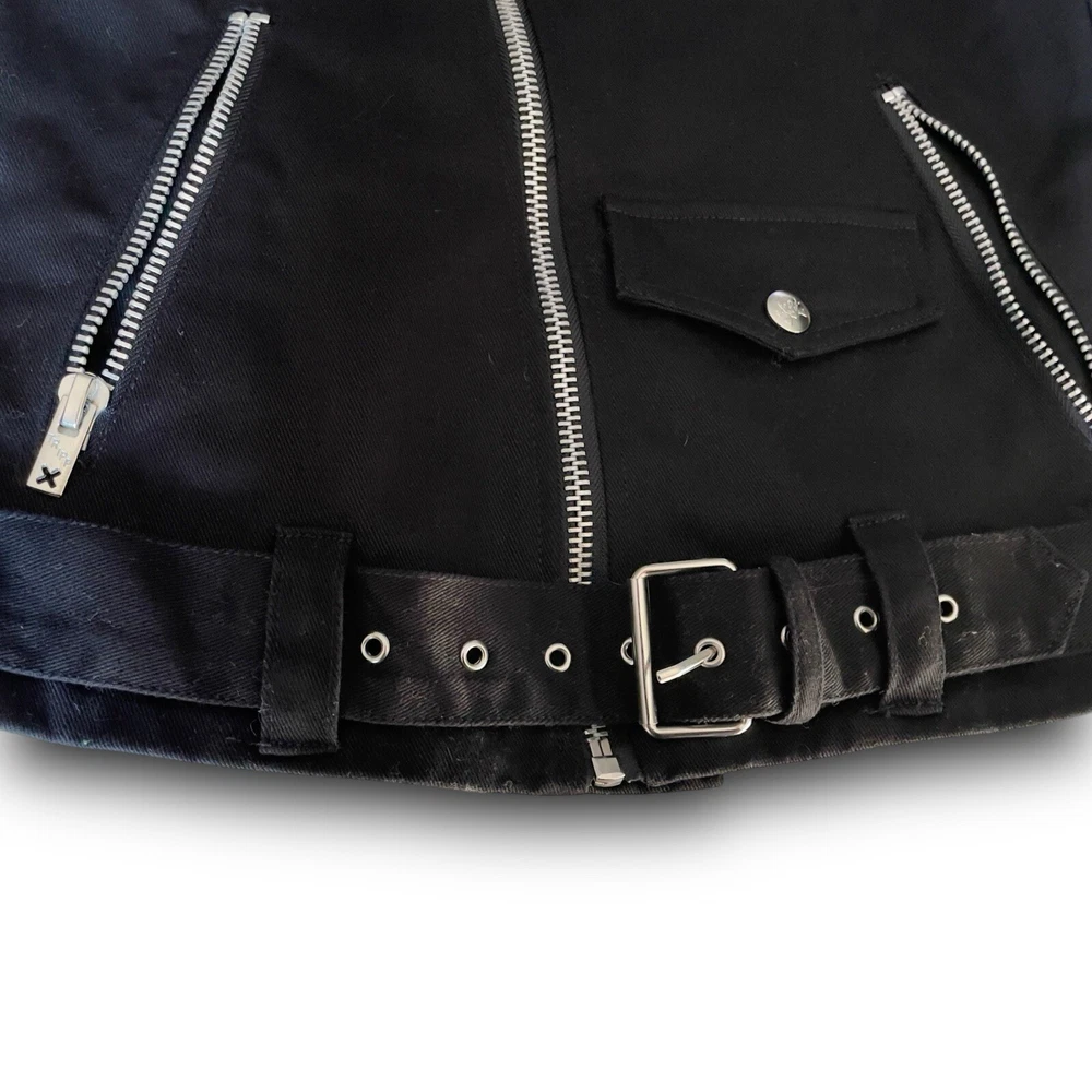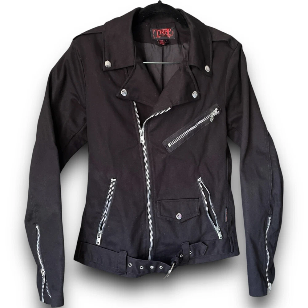 vintage y2k tripp nyc moto zipper jacket silver hardware belt ~ small 100% cotton daang goodman tripp nyc unisex black cotton twill moto biker jacket featuring sick silver hardware, rad skull engraved buttons, full front zip closure, adjustable belt, multi pocket zippers on front & sleeves in size men’s small. this punk rock coat is sure to make anyone feel like a total bad ass with the style of a leather jacket, except made from sturdy quality cotton. excellent pre owned condition. laid flat: chest 20” length 25” sleeves 26” trippnyc daang goodman grunge punk emo goth alt style