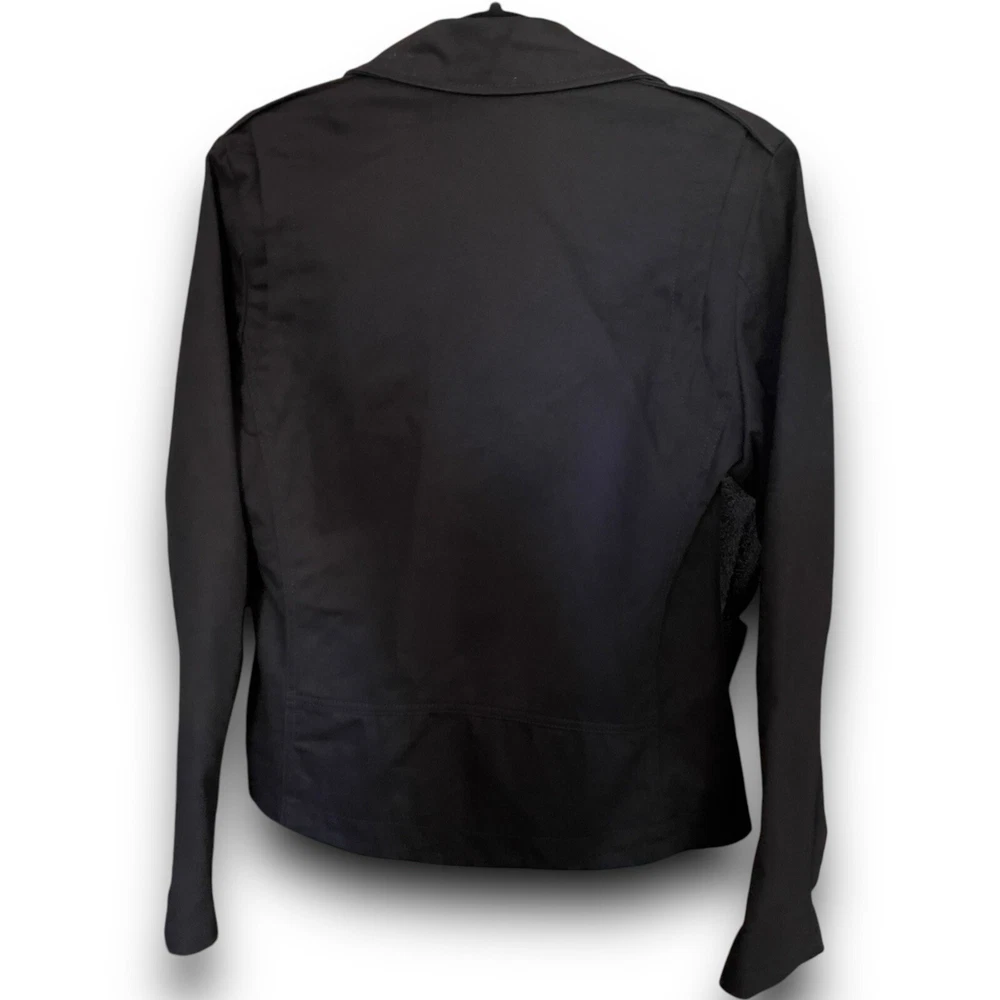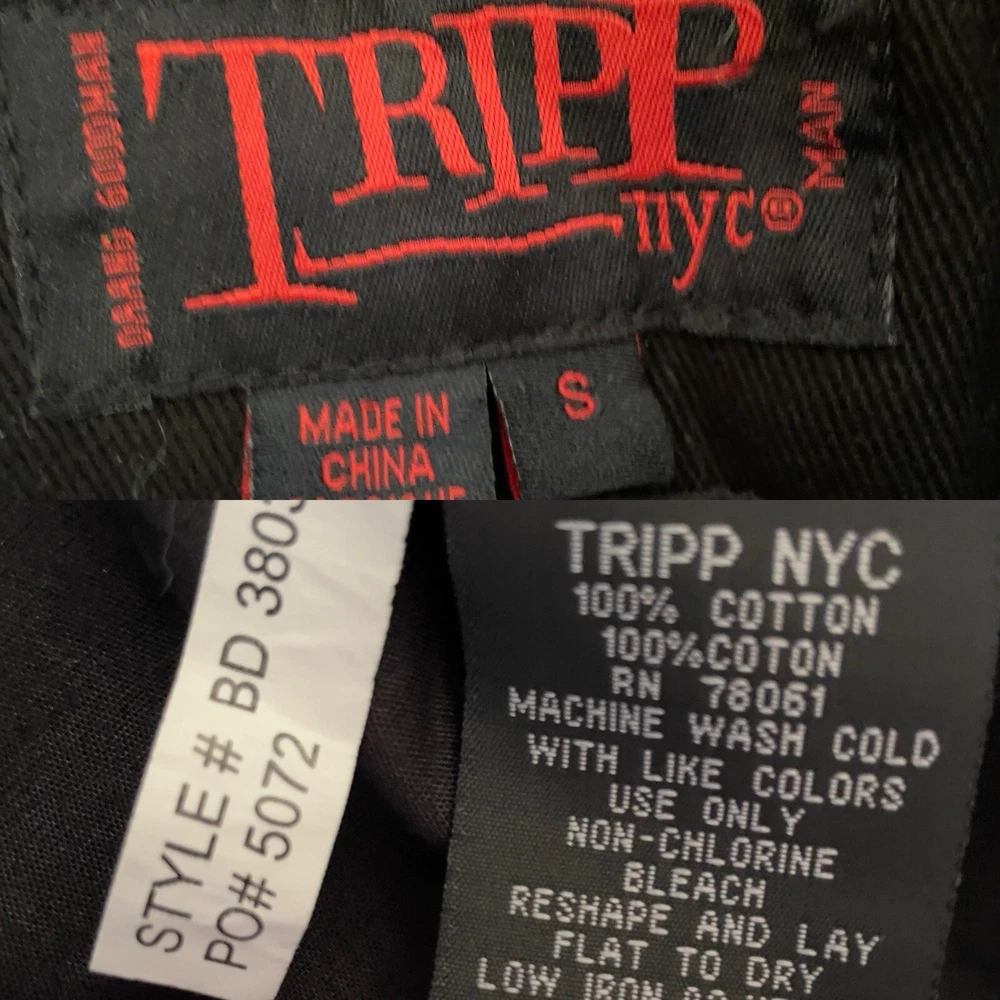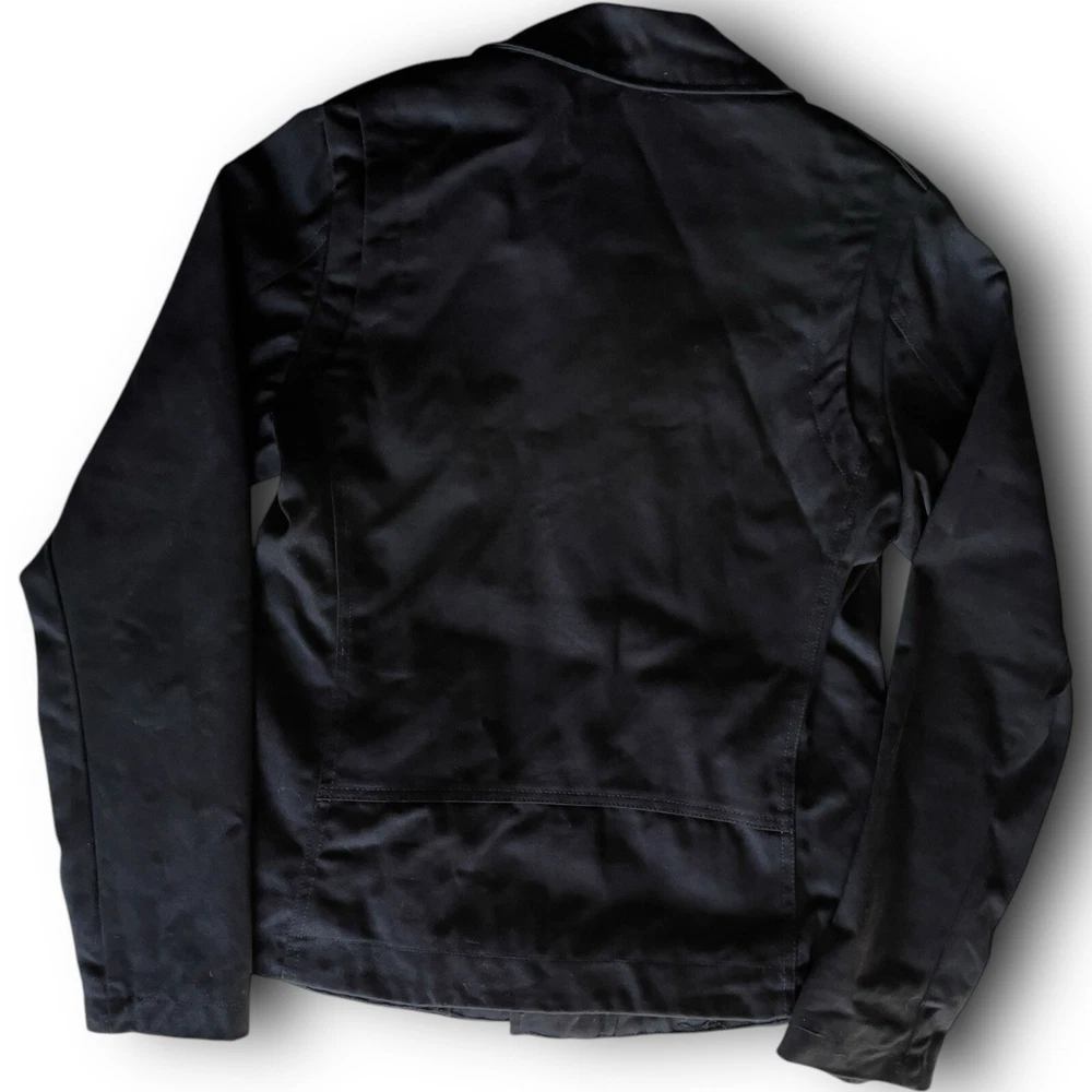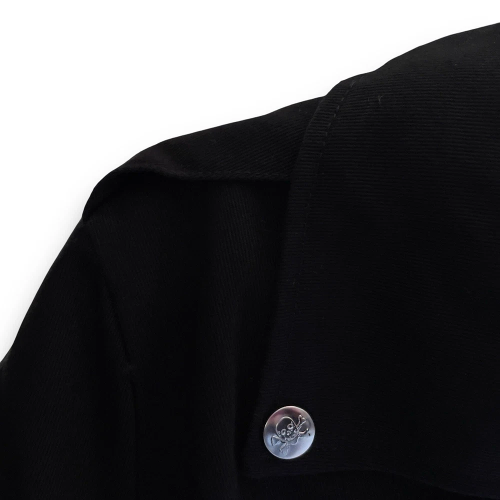 vintage y2k tripp nyc moto zipper jacket silver hardware belt ~ small 100% cotton daang goodman tripp nyc unisex black cotton twill moto biker jacket featuring sick silver hardware, rad skull engraved buttons, full front zip closure, adjustable belt, multi pocket zippers on front & sleeves in size men’s small. this punk rock coat is sure to make anyone feel like a total bad ass with the style of a leather jacket, except made from sturdy quality cotton. excellent pre owned condition. laid flat: chest 20” length 25” sleeves 26” trippnyc daang goodman grunge punk emo goth alt style