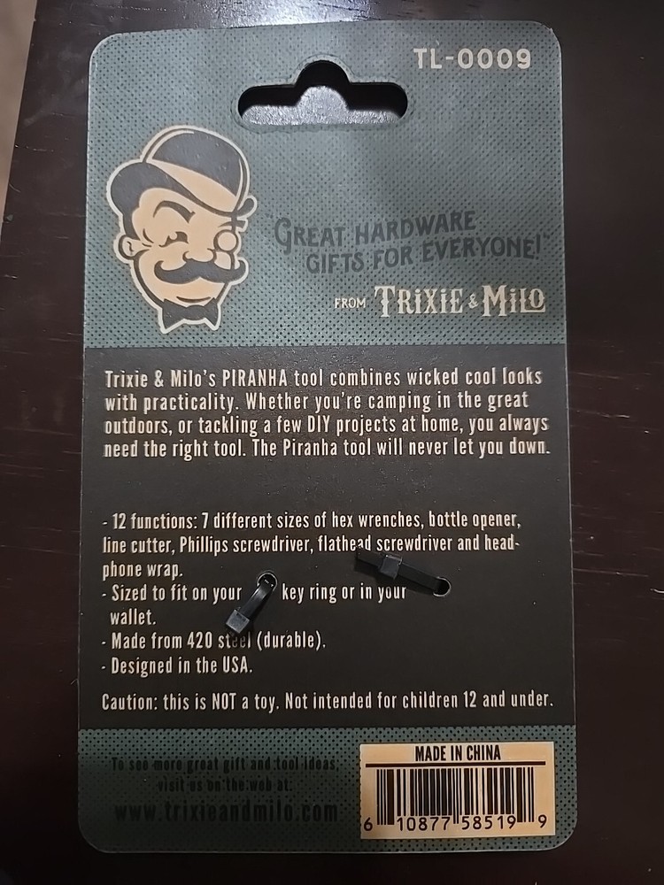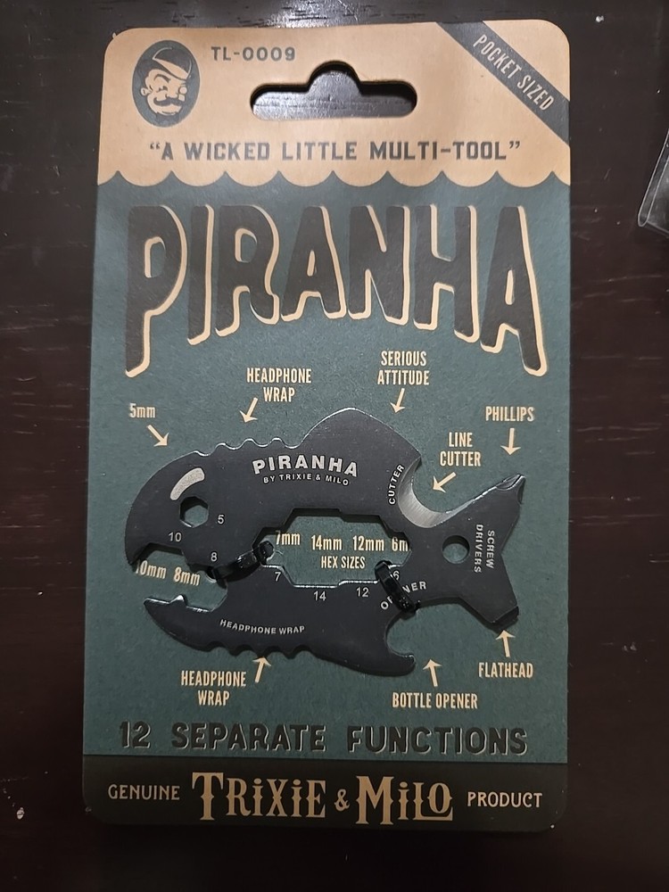 The Trixie and Milo Piranha Multi-Tool is a versatile 12-in-1 tool made of metal. It includes tools such as a line cutter, bottle opener, small screwdriver, hex wrench, and headphone wrap. It is a practical tool for outdoor activities, camping, and hiking.