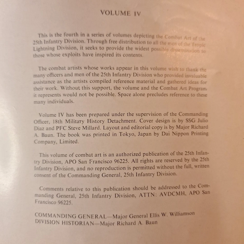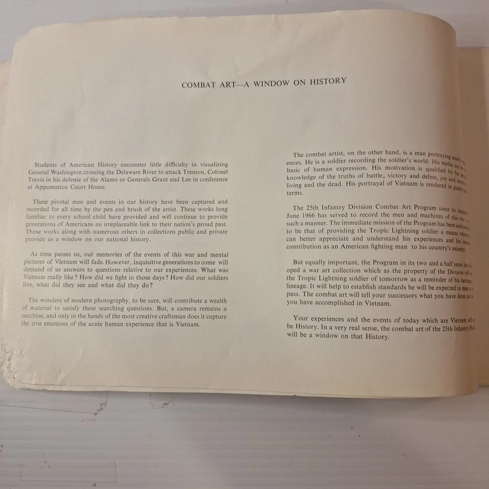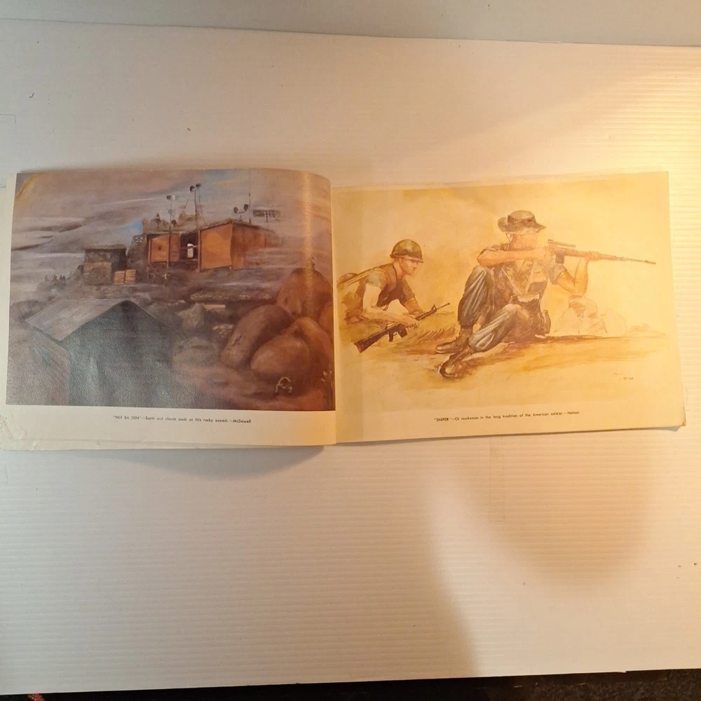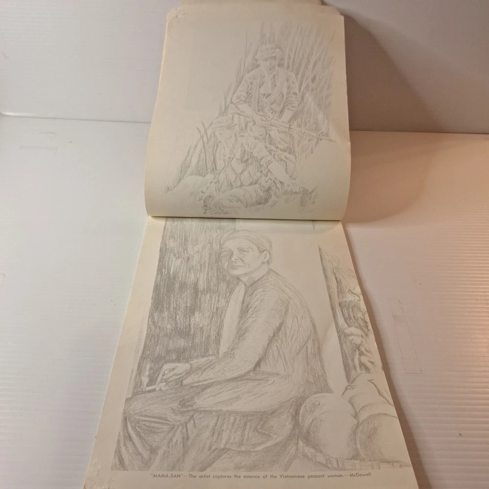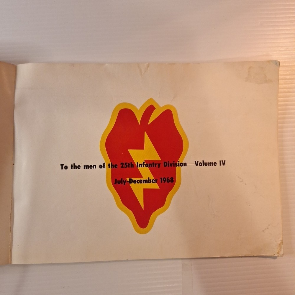 The Tropic Lightning Combat Art Vol. IV Vietnam War U.S. Army Book, Jul - Dec 1968 is a rare and collectible piece from the Vietnam War era. This first edition softcover book, written in English and based out Vietnam, provides a unique insight into the military strategies and tactics used by the U.S. Army during this tumultuous period. The book's focus on the Vietnam War makes it a valuable addition to any collection focused on military history, offering a glimpse into the struggles and triumphs of the era. *This book was illustrated by combat artists of that time. * front cover has top right and lower right corners missing. The first few pages have some damages on the corner of the pages where small pieces may be missing. The rest of the pages are in very good condition with slight wear. The back of the book is in good shape with a little bit of wear on the corners. Front cover also has a bend in it. * This is a very rare book, as it was distributed to all of the men of the Tropic lightning division during this time period.