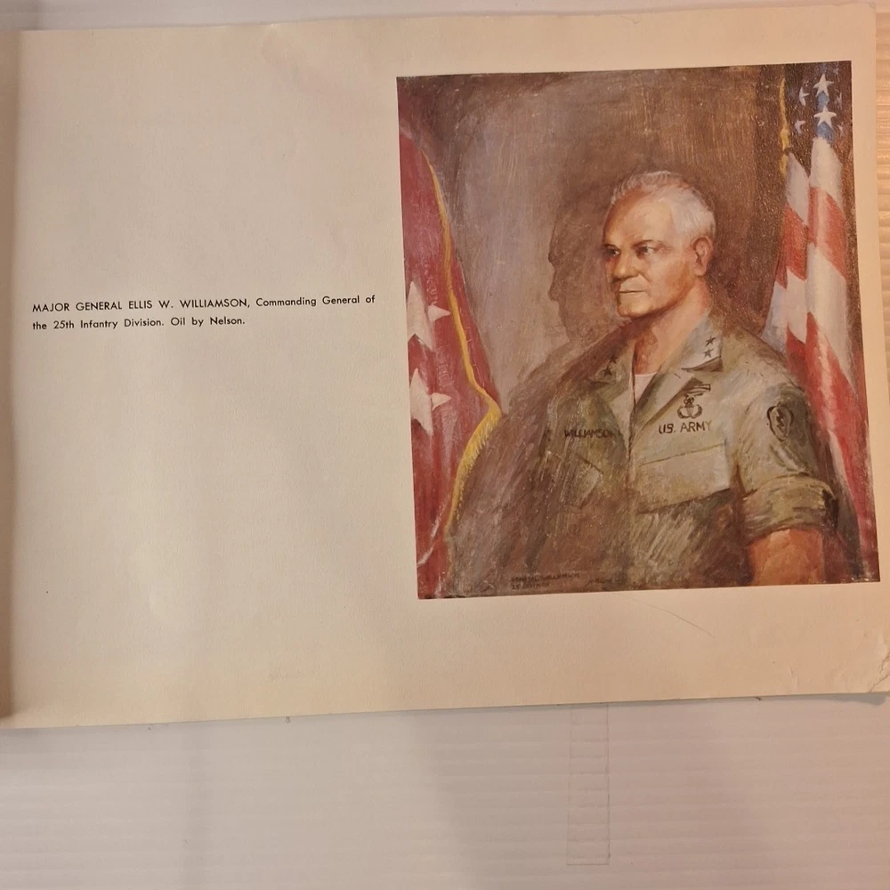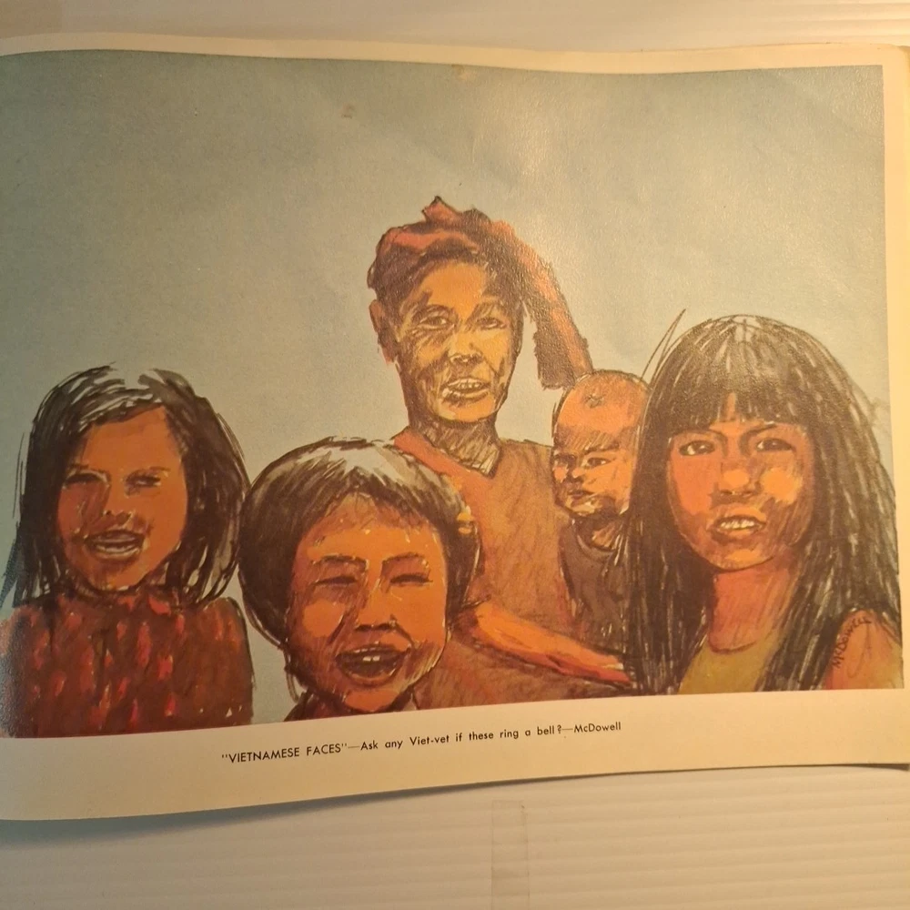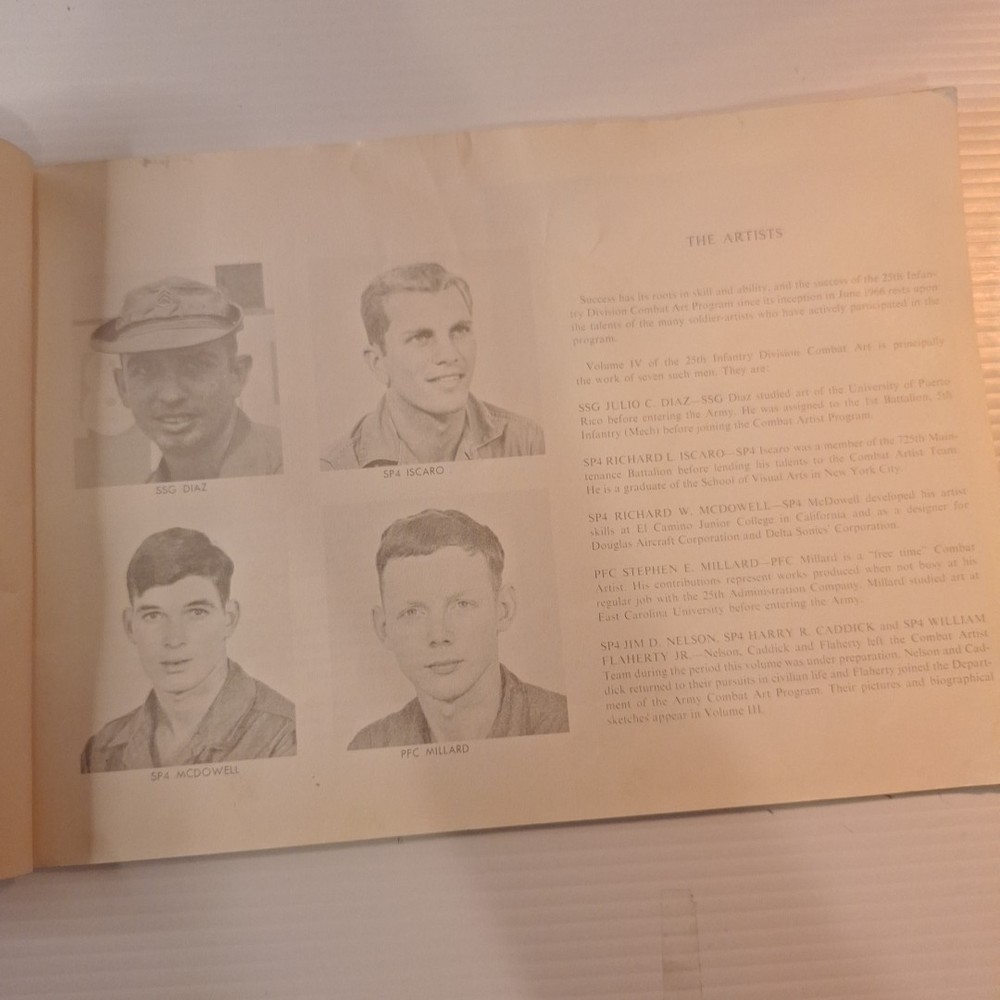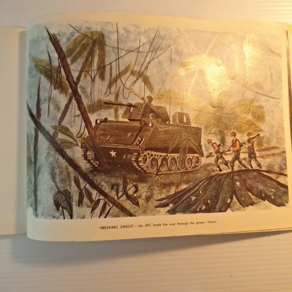The Tropic Lightning Combat Art Vol. IV Vietnam War U.S. Army Book, Jul - Dec 1968 is a rare and collectible piece from the Vietnam War era. This first edition softcover book, written in English and based out Vietnam, provides a unique insight into the military strategies and tactics used by the U.S. Army during this tumultuous period. The book's focus on the Vietnam War makes it a valuable addition to any collection focused on military history, offering a glimpse into the struggles and triumphs of the era. *This book was illustrated by combat artists of that time. * front cover has top right and lower right corners missing. The first few pages have some damages on the corner of the pages where small pieces may be missing. The rest of the pages are in very good condition with slight wear. The back of the book is in good shape with a little bit of wear on the corners. Front cover also has a bend in it. * This is a very rare book, as it was distributed to all of the men of the Tropic lightning division during this time period.