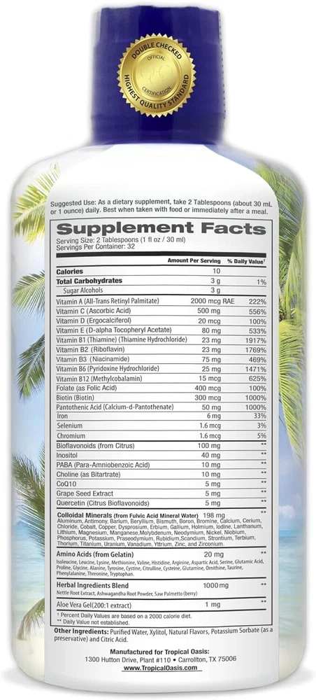 Premium Liquid Multivitamin for Men | Sugar Free Men’s Multi-Vitamin | 100+ Vitamins, Minerals & Amino Acids to Support Muscle, Heart, Brain Health & Energy | 98% Absorption Rate | Non-GMO | 32 Serv Brand Tropical Oasis Flavor Unflavored Primary Supplement Type Vitamin A, C, D3, E, B1, B2, B3, B6, B12, Folate, Biotin, Iron, PABA, Choline, CoQ10, Grape Seed Extract, Quercetin, Colloidal Minerals Vitamin A, C, D3, E, B1, B2, B3, B6, B12, Folate, Biotin, Iron, PABA, Choline, CoQ10, Grape Seed Extract, Quercetin, Colloidal Minerals Unit Count 32 Fl Oz Item Form Liquid Item Weight 32 Ounces Item dimensions L x W x H 3 x 3 x 8 inches Special Ingredients Vitamin A, C, D3, E, B1, B2, B3, B6, B12, Folate, Biotin, Iron, PABA, Choline, CoQ10, Grape Seed Extract, Quercetin, Colloidal Minerals Vitamin A, C, D3, E, B1, B2, B3, B6, B12, Folate, Biotin, Iron, PABA, Choline, CoQ10, Grape Seed Extract, Quercetin, Colloidal Minerals Diet Type Gluten Free Product Benefits Anti-Aging About this item ✅ Tropical Oasis New Men's Mega Liquid Multivitamin is specially formulated for Men with premium vitamins, minerals, herbs, amino acids, and nutrients that will keep you feeling young and living an active lifestyle ✅ Additional 1000mg herbal blend of Nettle Root, Ashwagandha Root and Saw Palmetto for optimal prosate health ✅ CoQ10 is a vital nutrient manufactured by your body that helps cells produce energy. As we age, our body loses its stores of CoQ10, particularly in the heart. Taking CoQ10 helps maintain your healthy CoQ10 levels and is also recommended for those suffering from high blood pressure ✅ Contains Double the Daily Recommended Value of Vitamin D for men! ✅ Liquid Vitamins are absorbed up to 98% by the body compared to 3-18% for pills/capsules - No artificial colors or flavoring.