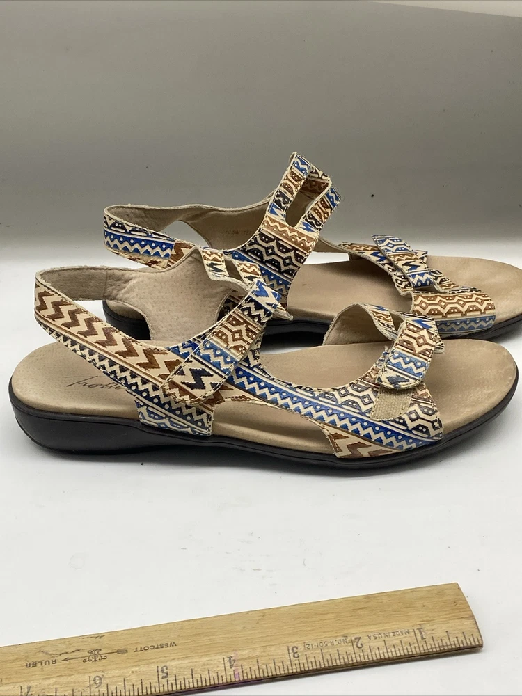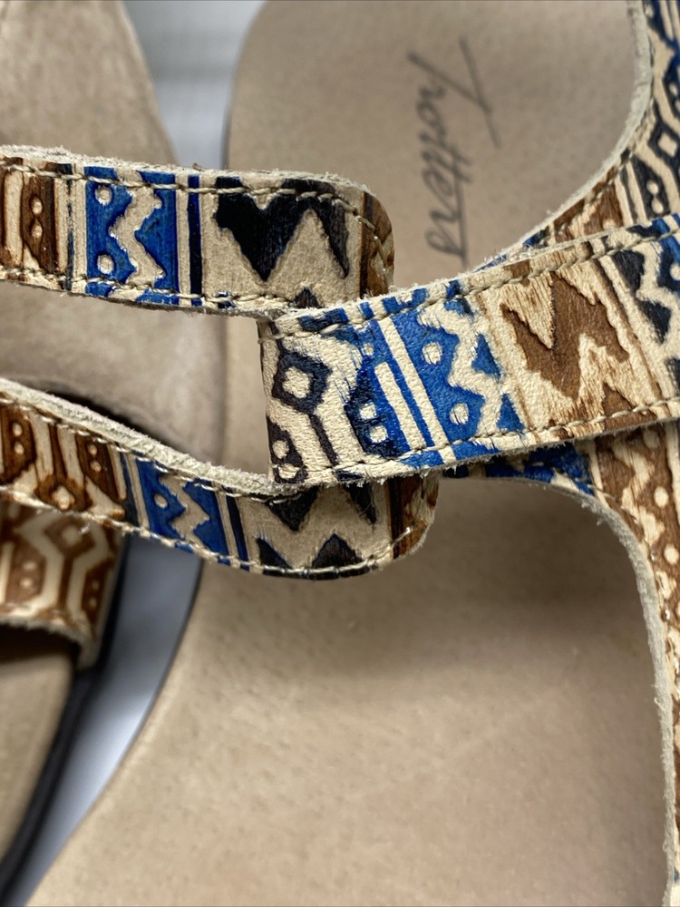 The Trotters Women's Sandals in Beige Aztec pattern offer both style and comfort for casual occasions. Featuring a slip-on closure and low wedge heel, these sandals are easy to wear and provide arch support. Made with leather uppers and breathable synthetic lining, they are lightweight and perfect for summer, fall, and spring. The Aztec theme adds a unique touch to the design, making these sandals a versatile choice for any woman's wardrobe. crafted with quality materials and a comfortable fit, these sandals from Trotters are sure to be a favorite for everyday wear.