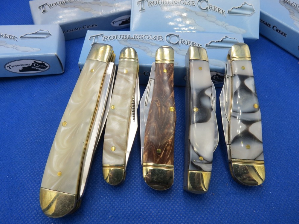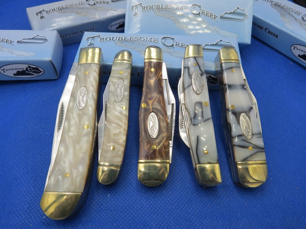 The TROUBLESOME CREEK 5 KNIVE COLLECTION features a variety of pocket knives with beautiful celluloid handles in white, brown, and gray colors. The knives in this assortment have drop point blades, slipjoint lock mechanisms, and are manually opened. The collection includes knives with 2, 3, or 4 blades, all made with stainless steel handles. Each knife is part of the modern folding knives category and is a collectible item that showcases different assorted patterns. KNIVES ARE ALL BRAND NEW WITH BOXES AND YOU WILL RECIEVE THE ACTUAL KNIVES PICTURED WE KNOW YOU HAVE A CHOICE WHERE YOU SHOP… THANKS FOR SHOPPING WITH US AT NO PRESSURE SALES,LLC PLEASE BE SURE AND VISIT OUR OTHER ITEMS Thanks for looking YOU WILL RECEIVE THE ITEM PICTURED UNLESS IT IS A MULTIPLE LISTING OR OTHERWISE STATED.ALL BONE KNIVES COME FROM BOVINE (COW) BONE UNLESS OTHERWISE STATED !!