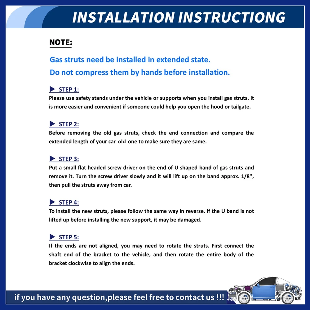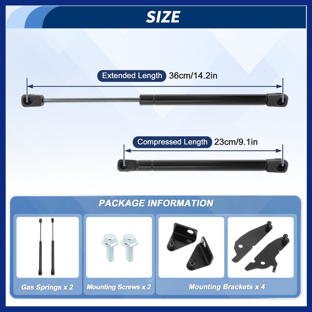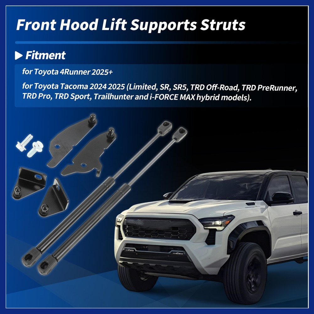 Document Compatible With:for Toyota Tacoma 2024 2025 (Limited, SR, SR5, TRD Off-Road, TRD PreRunner, TRD Pro, TRD Sport, Trailhunter and i-FORCE MAX hybrid models)for Toyota 4Runner 2025+Features:Gas Springs printed a waterproof material on the surface, dustproof, easy to clean.Lift Support Strut is made of durable carbon steel material, strong and durable to support vehicle lid.Easy to install, measure distance for install, fix mounting brackets, and then press on the new gas spring on the installation position.If the temperature is lower than minus 20 degrees, the oil density of the gas spring turns high (frozen) and it is difficult to press down.This is a non-OEM product, accessory only!Details:Place on vehicle: Front HoodExtended Length: 36cm/14.2inCompressed Length: 23cm/9.1inMaterial: Carbon SteelColor: BlackInstallationSTEP 1: Please use safety stands under the vehicle or supports when you install gas struts. It is more easier and convenient if someone could help you open the hood or tailgate.STEP 2: Before removing the old gas struts, check the end connection and compare the extended length of your car Old one to make sure they are same.STEP 3: Put a small flat headed screw driver on the end of U shaped band of gas struts and remove it. Turn the screw driver slowly and it will lift up on the band approx. 1/8'', then pull the struts away from car.STEP 4: To install the new gas struts, please follow the same way in reverse. If the U band is not lifted up before installing the new support, it may be damaged.STEP 5: If the ends are not aligned, you may need to rotate the struts. First connect the shaft end of the bracket to the vehicle, and then rotate the entire body of the bracket clockwise to align the ends. Note: If the temperature is lower than minus 20 degrees, the oil density of the gas spring turns high (frozen) and it is difficult to press down.Package Includes:2 Pcs Front Hood Lift Support Struts Truck Front Hood Lift Support Struts for Toyota Tacoma 2024 2025 4Runner Compatible With: for Toyota Tacoma 2024 2025 (Limited, SR, SR5, TRD Off-Road, TRD PreRunner, TRD Pro, TRD Sport, Trailhunter and i-FORCE MAX hybrid models) for Toyota 4Runner 2025+ Features: Gas Springs printed a waterproof material on the surface, dustproof, easy to clean. Lift Support Strut is made of durable carbon steel material, strong and durable to support vehicle lid. Easy to install, measure distance for install, fix mounting brackets, and then press on the new gas spring on the installation position. If the temperature is lower than minus 20 degrees, the oil density of the gas spring turns high (frozen) and it is difficult to press down. This is a non-OEM product, accessory only! Details: Place on vehicle: Front Hood Extended Length: 36cm/14.2in Compressed Length: 23cm/9.1in Material: Carbon Steel Color: Black Installation STEP 1: Please use safety stands under the vehicle or supports when you install gas struts. It is more easier and convenient if someone could help you open the hood or tailgate. STEP 2: Before removing the old gas struts, check the end connection and compare the extended length of your car Old one to make sure they are same. STEP 3: Put a small flat headed screw driver on the end of U shaped band of gas struts and remove it. Turn the screw driver slowly and it will lift up on the band approx. 1/8'', then pull the struts away from car. STEP 4: To install the new gas struts, please follow the same way in reverse. If the U band is not lifted up before installing the new support, it may be damaged. STEP 5: If the ends are not aligned, you may need to rotate the struts. First connect the shaft end of the bracket to the vehicle, and then rotate the entire body of the bracket clockwise to align the ends. Note: If the temperature is lower than minus 20 degrees, the oil density of the gas spring turns high (frozen) and it is difficult to press down. Package Includes: 2 Pcs Front Hood Lift Support Struts ITEM SPECIFICS Brand switchpart Type Lift Support Struts Placement on Vehicle Front Manufacturer Part Number Does Not Apply Reference OE/OEM Number Does Not Apply Seller Warranty None Colour Black Interchange Part Number Does Not Apply Items Included Lift Support Struts Manufacturer Warranty None Superseded Part Number Does Not Apply Universal Fitment No Product Name Gas Struts Shock Shell Color Black Other Part Number Does Not Apply Dimension 17.7"x3"x1.8" Package Content 1 x Gas Struts Shock Note This is not oem product,accessory only. Color Black OE/OEM Part Number Does Not Apply Net Weight 612g NOTICE If you have any questions, please feel free to contact our customer service. Our response will be faster than eBay! Our Handling Time: within 24 hours on weekdays eBay Handling Time: 72 hours ABOUT US SHIPPING POLICY PAYMENT RETURN CONTACT US We are committed to providing professional, safe and effective personal care products. We strive to provide customers loved products at the competitive price. We work with suppliers to discover practical, easy-to-use personal care products. Our store not only offers quality products at the competitive price, but also has professional customer service, offers you comfortable shopping experience. Please don't forget to follow us on eBay. We will continue to update and provide more and more practical personal care products. switchpart thank you for your business! We work hard to safely and securely ship your order in the least amount of time. Storewide free shipping in United States. All our items will be shipped to buyer's address, please confirm your address on eBay before you purchase. Taxes and other charges are included in the item price or shipping charges. Buyers are responsible for these charges. We accept payment methods show in payment details. Payment must be received within 7 days of auction closing. According to eBay guidelines, all unpaid purchases case will be opened automatically. If you need to specify the color or other information for t