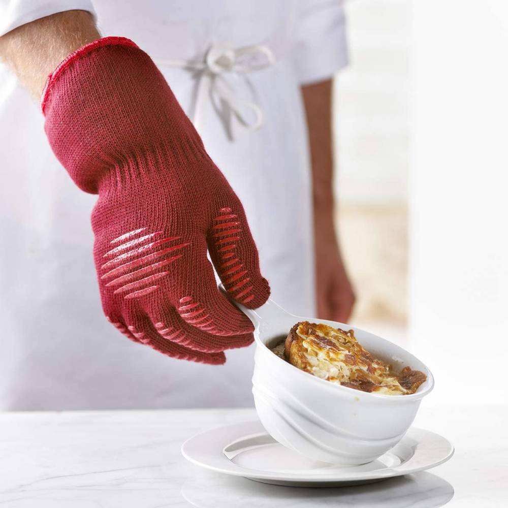 Double-Sided Kitchen and Grill Glove. Keep your hand protected from the heat as you cook. Perfect for the oven and grill, this glove is made of fire-resistant aramid fibers and provide increased dexterity. It features a silicone anti-slip grip on both side for a left- or right-hand use. Includes one glove. An essential for cooks. Anti-slip silicone grip. Heat and flame-resistant aramid fibers up to 482 degrees F. Material: Aramid, silicone. Hand wash only. Visit Our Store Contact Us Trudeau Maison Double-Sided Kitchen/Grill Glove 1/Pkg-Red Double-Sided Kitchen and Grill Glove. Keep your hand protected from the heat as you cook. Perfect for the oven and grill, this glove is made of fire-resistant aramid fibers and provide increased dexterity. It features a silicone anti-slip grip on both side for a left- or right-hand use. Includes one glove An essential for cooks Anti-slip silicone grip Heat and flame-resistant aramid fibers up to 482 degrees F Material: Aramid, silicone Hand wash only