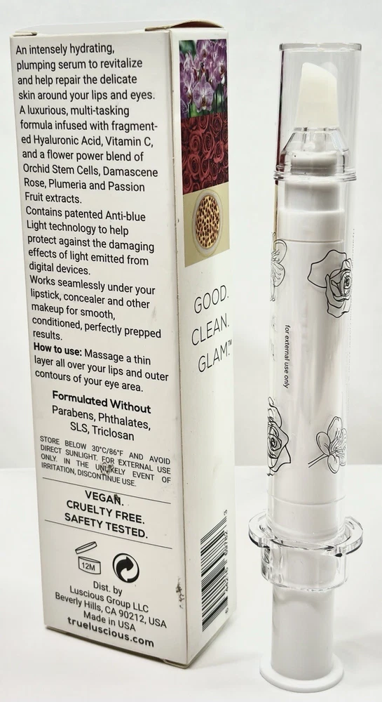 True & Luscious Flowerdose plumping lip and eye serum. Full size. New in box, never used. 0.5fl oz 14ml. An intensely hydrating, anti-aging serum that visibly plumps and revives your lips and under-eye area. This antioxidant-dense formula is infused with moisture-boosting Hyaluronic Acid and potent botanical actives including Orchid Stem Cells, Rose, Passion Fruit, and Plumeria extracts to help visibly reduce fine lines, restore elasticity, heal stressed skin and protect the moisture barrier. This multi-use wonder serum can be used as a protective primer under lipstick/concealer and as an addition to your skincare routine as a hydration accelerator. Developed with pro-makeup artists and tested all skin types, including sensitive skin. INGREDIENTS: Orchis Maculata (Orchid) Flower Water, Propanediol, Water, Butylene Glycol, Passiflora Incarnata (Passion) Fruit Extract, Plumeria Rubra Flower Extract, Helianthus Annuus (Sunflower) Sprout Extract, Malus Domestica Fruit Cell Culture Extract, Caesalpinia Spinosa Fruit Pod Extract/Caesalpinia Fruit Extract, Maltodextrin, Glycerin, Rosa Gallica Flower Extract, Rosa Damascena Flower Oil, Swertia Chirata Extract, Lavandula Angustifolia (Lavender) Flower Extract, Caesalpinia Spinosa Fruit Pod Extract, Hedychium Spicatum Extract, Orchis Maculata Flower Extract, Sodium Carbomer, Hydroxypropyl Methylcellulose, Sodium Hyluronate, Hydroxyethylcellulose, Caprylic/Capric Triglyceride, Panthenol, Ascorbic Acid, Xanthan Gum, Mentha Arvensis Leaf Oil, Phenoxyethanol, Caprylyl Glycol, Ethylhexylglycerin, Hexylene Glycol