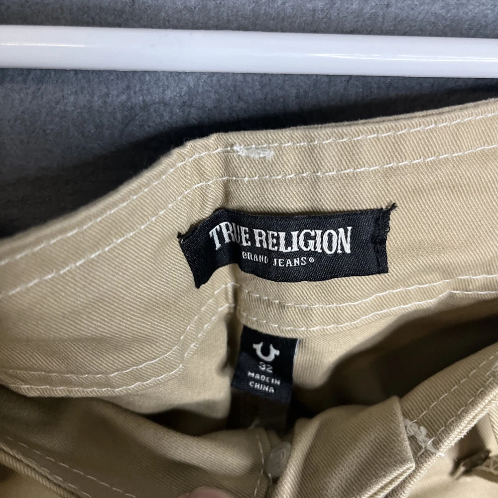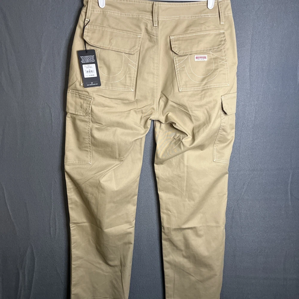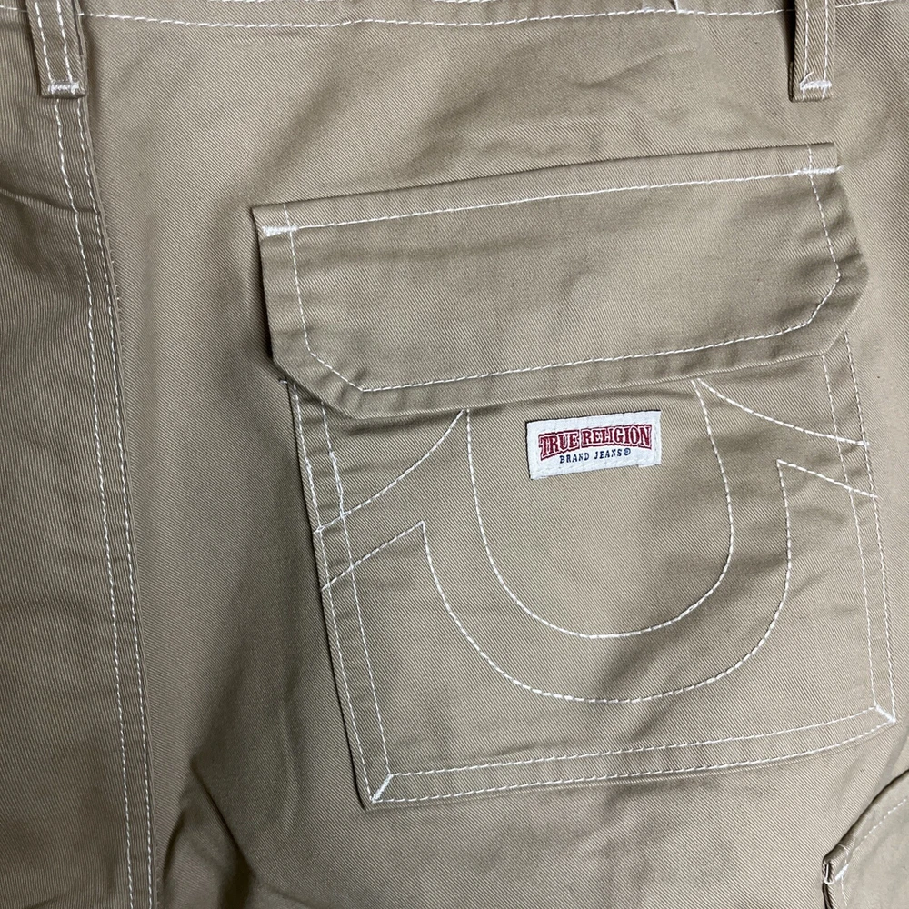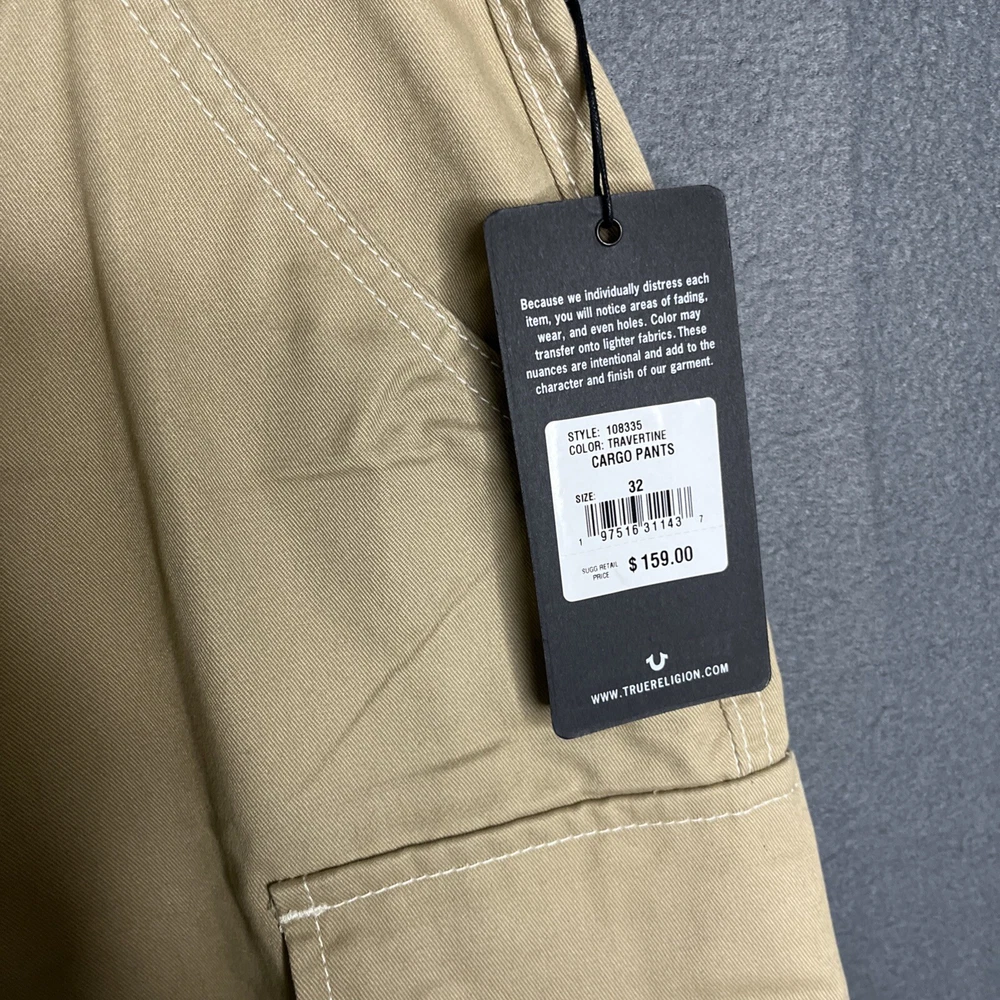 These True Religion cargo pants for men in size 32 are designed in a classic baggy style with flap pockets. The pants are tan in color and feature a canvas fabric type with a polyester blend material. They have a pleated front, button and zipper accents, and a logo detail. Ideal for travel, casual wear, or workwear, these pants offer comfort, easy care, and ample pockets for a versatile and stylish look.