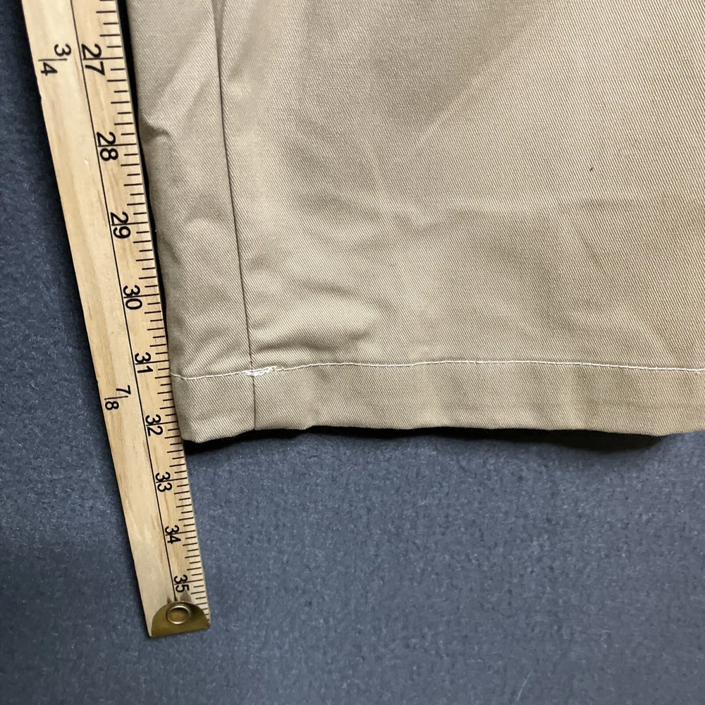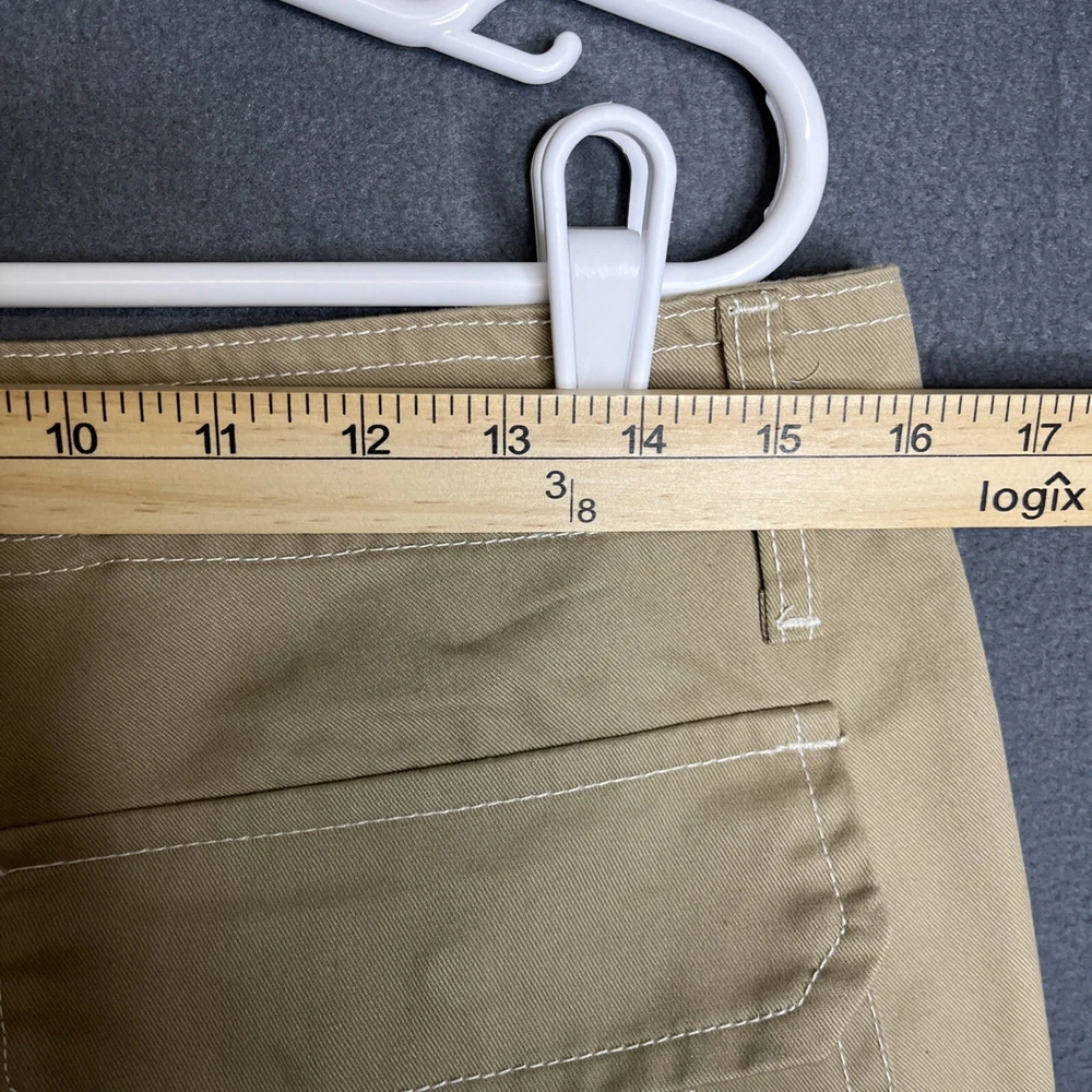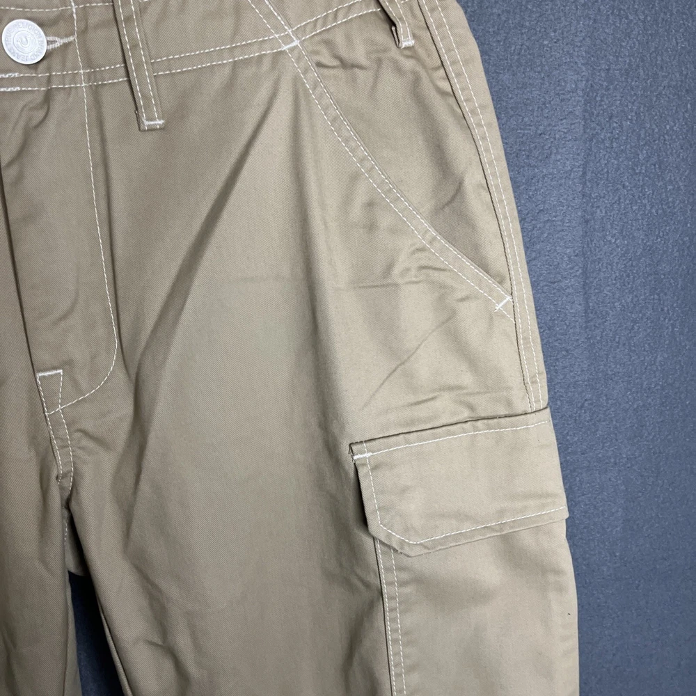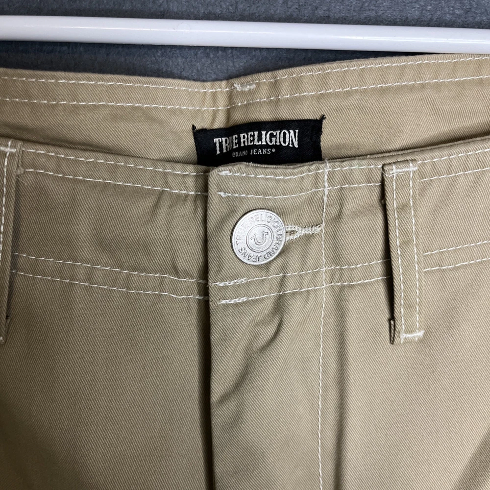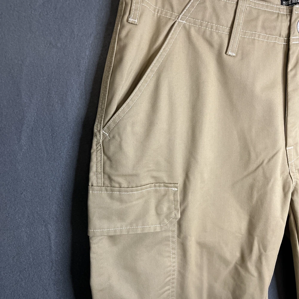 These True Religion cargo pants for men in size 32 are designed in a classic baggy style with flap pockets. The pants are tan in color and feature a canvas fabric type with a polyester blend material. They have a pleated front, button and zipper accents, and a logo detail. Ideal for travel, casual wear, or workwear, these pants offer comfort, easy care, and ample pockets for a versatile and stylish look.