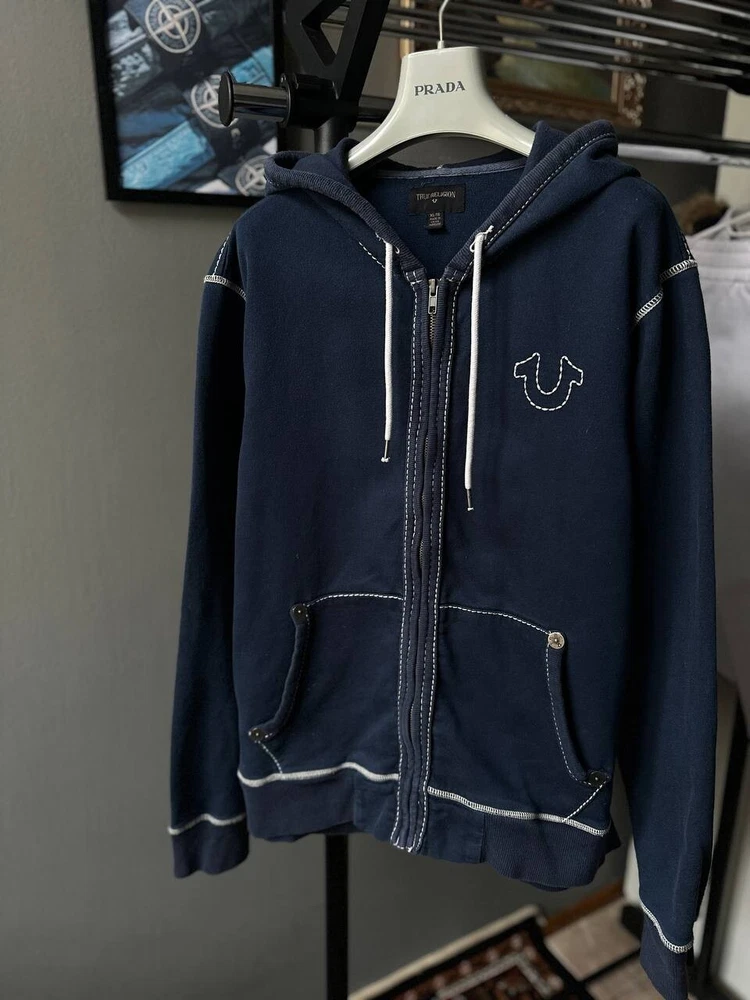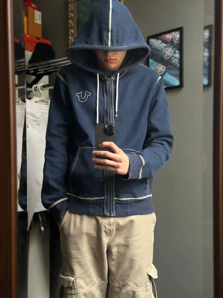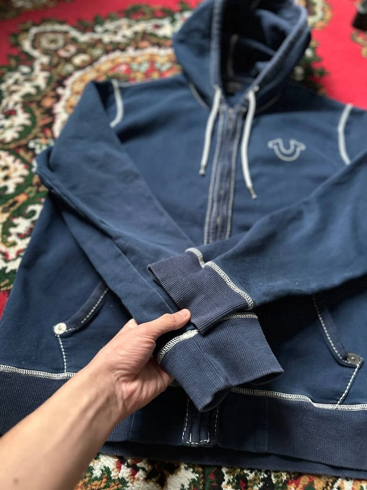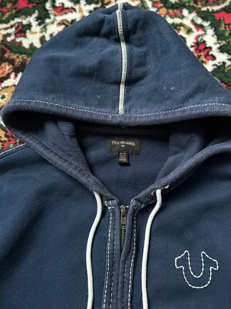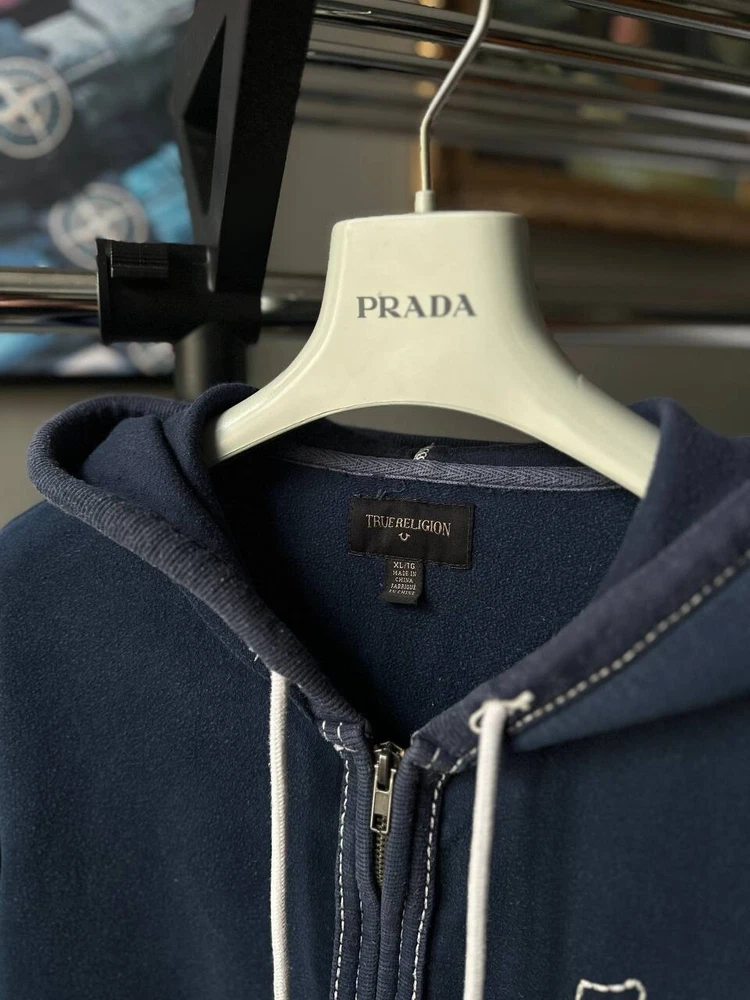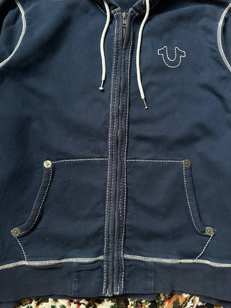 This True Religion hoodie is a must-have for any fashion-forward man. The vintage Y2K style and faded blue color make it a unique addition to your wardrobe. The full zip closure and crew neck design provide comfort and versatility, while the long sleeves and hood keep you warm during colder seasons. Made with high-quality cotton canvas material, this hoodie is both lightweight and durable. The oversized fit and multiple pockets make it perfect for any activity, whether it's walking, cycling, or playing basketball. The hoodie also features a zipper and logo accent, adding a touch of style to your outfit. Don't miss out on this one-of-a-kind piece.