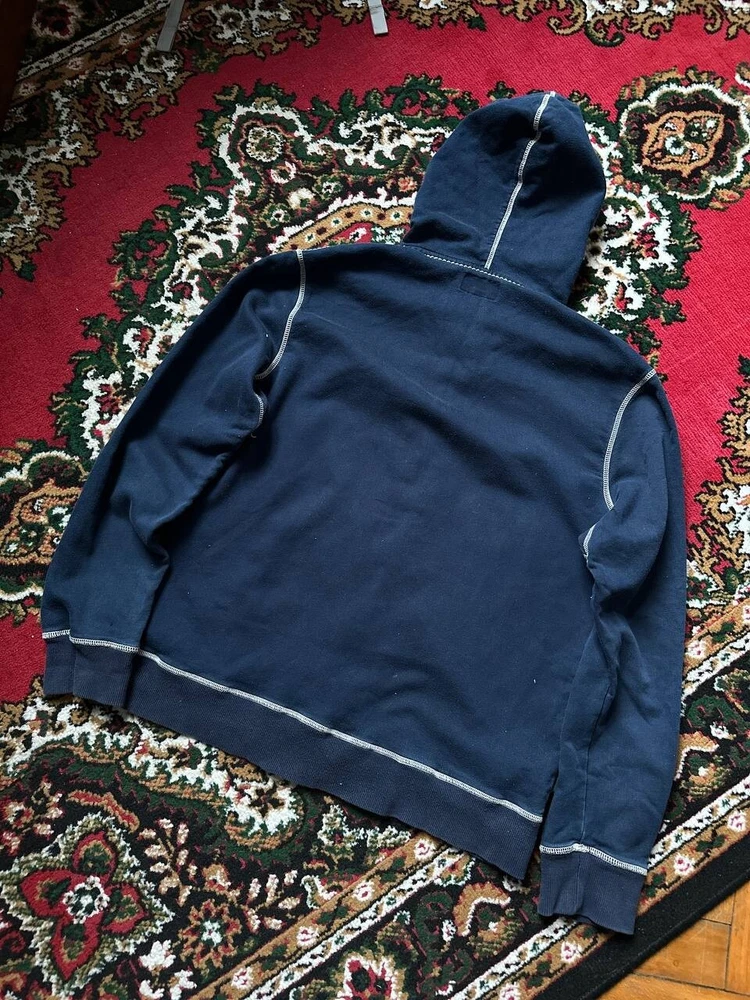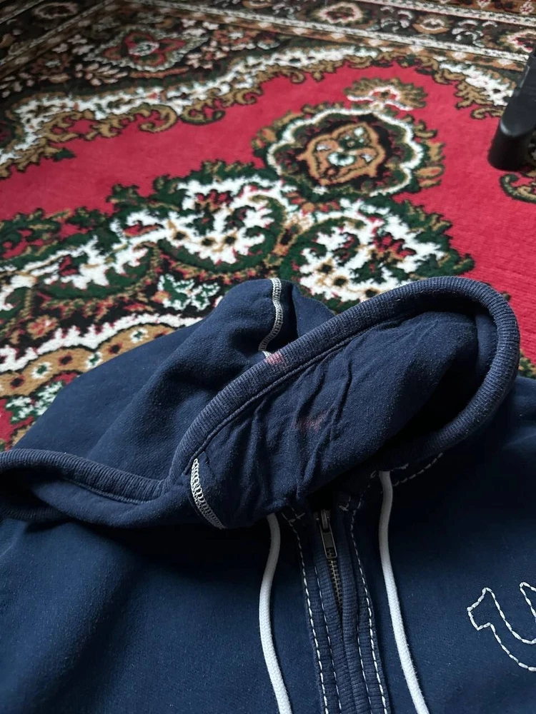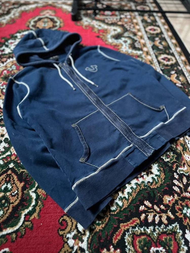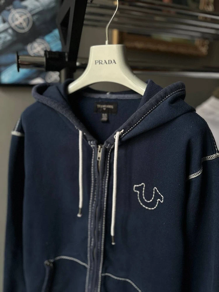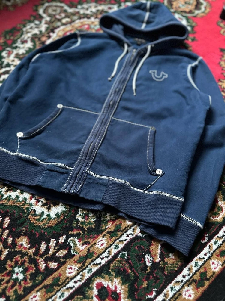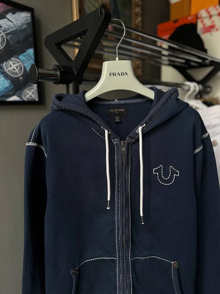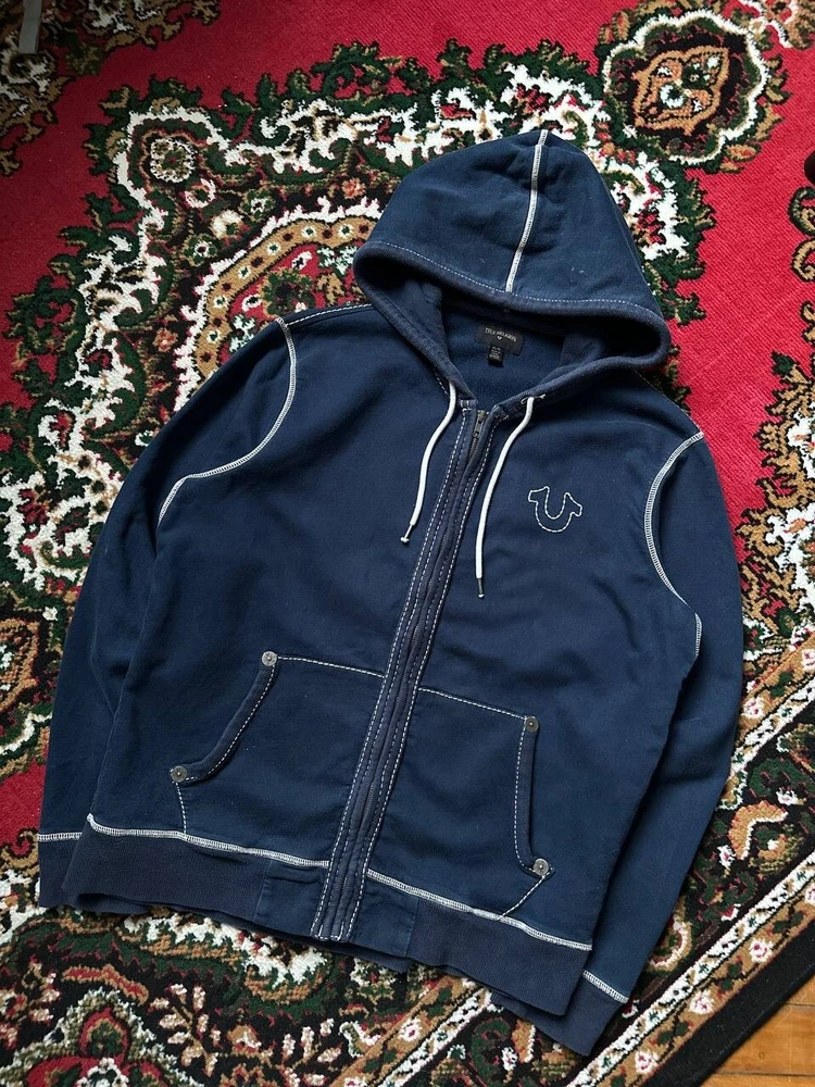 This True Religion hoodie is a must-have for any fashion-forward man. The vintage Y2K style and faded blue color make it a unique addition to your wardrobe. The full zip closure and crew neck design provide comfort and versatility, while the long sleeves and hood keep you warm during colder seasons. Made with high-quality cotton canvas material, this hoodie is both lightweight and durable. The oversized fit and multiple pockets make it perfect for any activity, whether it's walking, cycling, or playing basketball. The hoodie also features a zipper and logo accent, adding a touch of style to your outfit. Don't miss out on this one-of-a-kind piece.