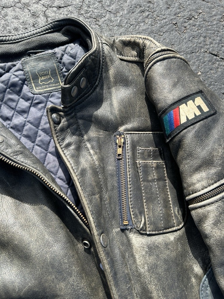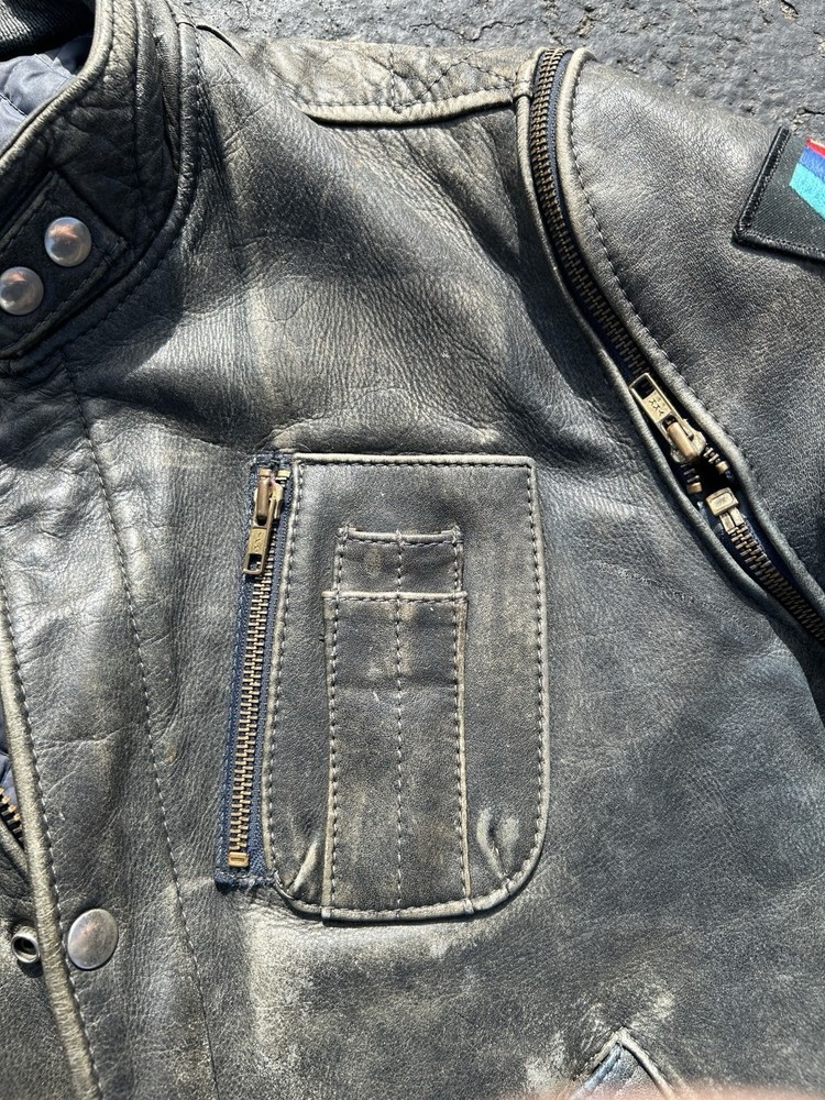 In the late 1970s Lamborghini entered into an agreement with BMW to build a production racing car, but ultimately after disputes with the Italian manufacturer BMW was forced to produce the car themselves. The result was sold to the public, from 1978 until 1981, as the BMW M1. It was the first mid-engine BMW automobile to be mass-produced. This jacket, made by German leather producer Hein Gericke, aligns with the time period German manufacturer BMW produced the M1. My guess is this was the leather sports jacket made to accompany the purchase of an M1. One of the rarest pieces of BMW history in existence, and one I’ll greatly struggle to part with. The patina is delightful, lovely coloring up and down the sleeves. A truly special piece. The arms fully unzip and disassemble, allowing you to modify it however you see fit.
