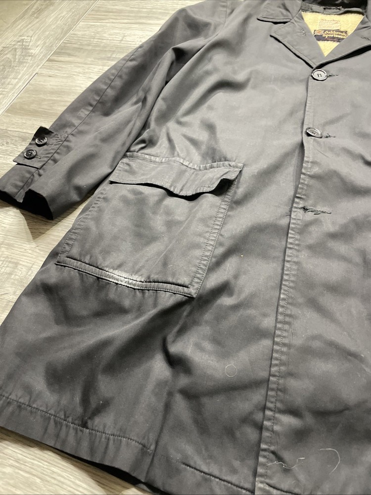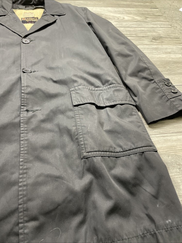 Please refer to pictures fir details measurements and flaws The True Vintage Oakbrook Sportswear Pea Coat is a stylish and classic piece from the 1960s, featuring a sherlon lining for added warmth. This XL button-down jacket in black is perfect for men looking for a vintage touch in their outerwear collection. With its unique style, this coat combines retro charm with modern functionality, making it a versatile and timeless addition to any wardrobe
