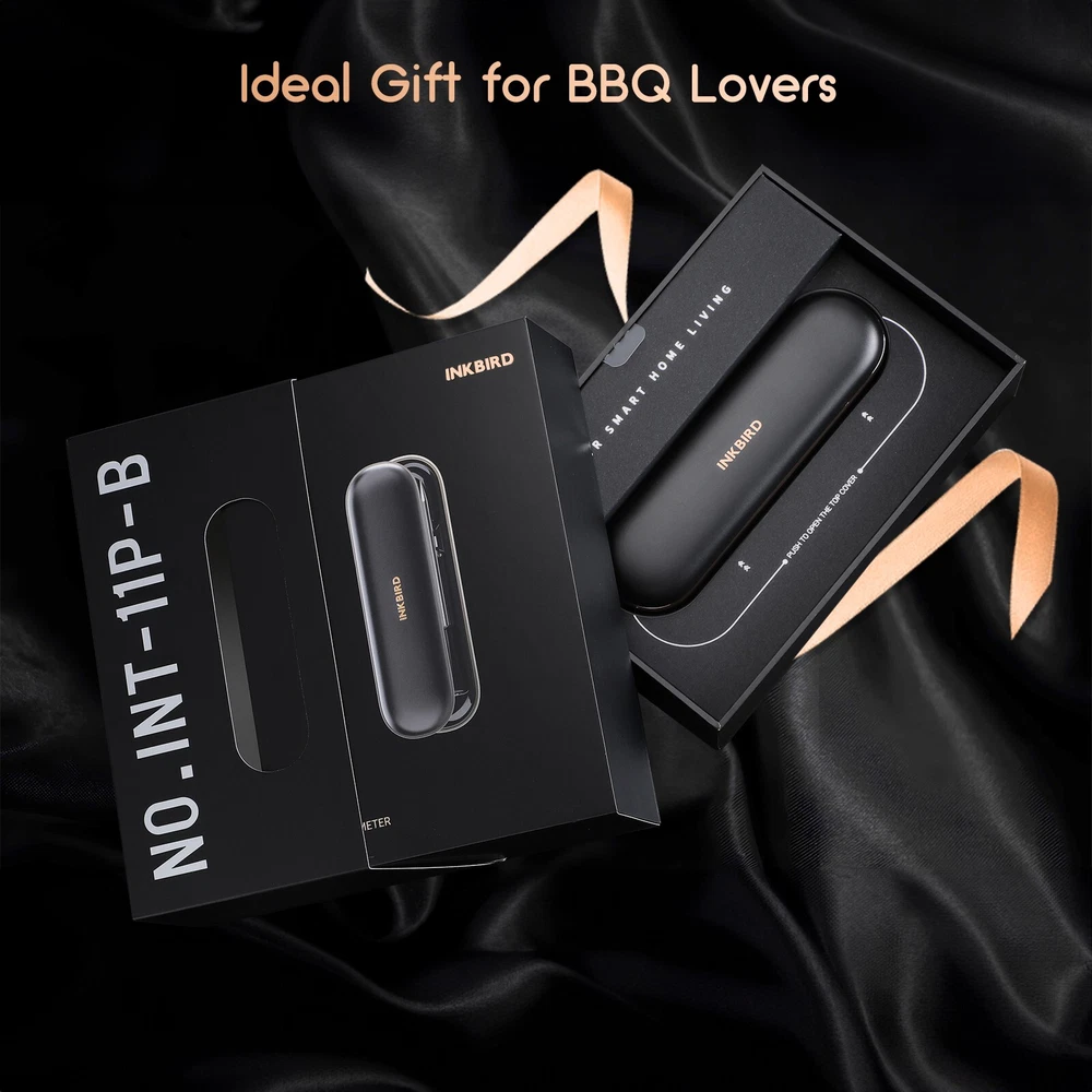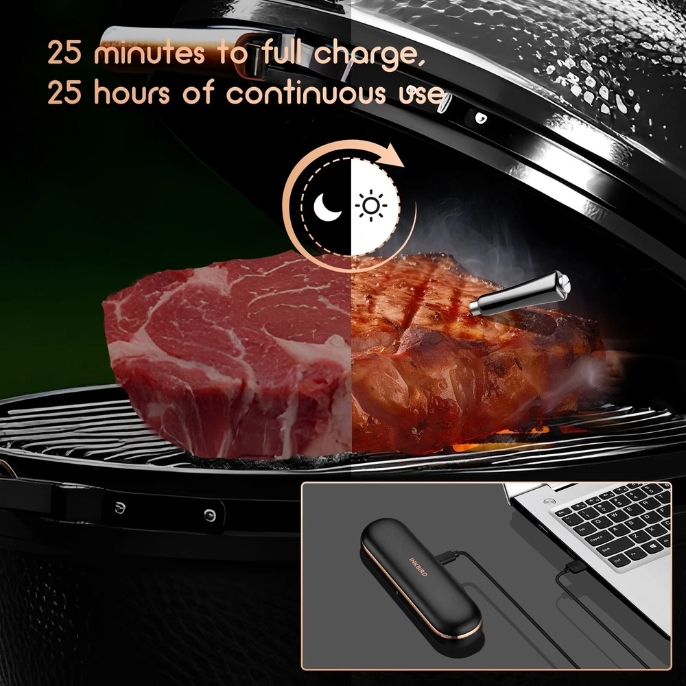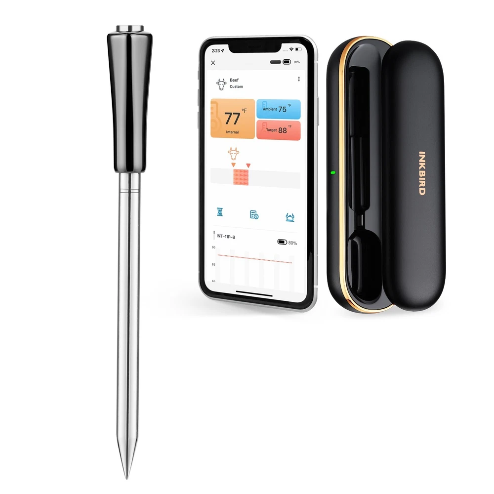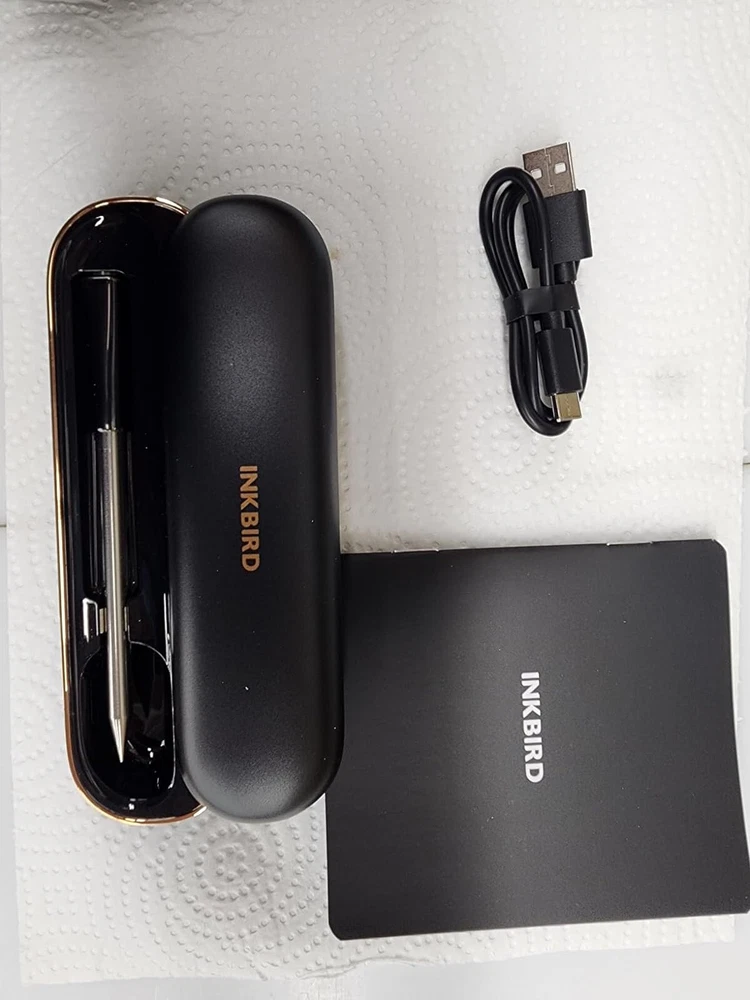 [Charge for 5 mins, Cook for 5 hrs] The grill thermometer dock has a built-in 500mAh lithium battery and can fully charge the probe in just 25 minutes. the wireless thermometer can be used continuously for 25 hours, even in high-temperature environments, making it particularly suitable for overnight cook. This thermometer for cooking is versatile and ideal for use in grills, smokers, ovens, frying pans. (Remember to insert it deep enough and beyond the safe cooking line every time you grill.) [Wireless Meat Probe & Bluetooth 5.1 Connection] This wireless meat thermometer frees you from tangled wires and liberalizes your operation. The advanced Bluetooth 5.1 technology enables you to remotely control and monitor cooking progress at any time over 300ft long distance. Moreover, this meat thermometer can locally store 30 minutes of offline data and automatically synchronize with the App after a Bluetooth connection without lost data. [2-In-1 Temperature Probe] Two temperature sensors at both ends allow the probe to get oven and food temperatures simultaneously. It supports a food temperature range of -10~100℃/14~212℉ and an ambient temperature range of 0~300℃/32~572℉, with a measurement accuracy of ±1℃/±1.8℉. Precise temperature control makes every cut of meat you grill perfectly to your taste, making every meal of daily life a celebration. (Remember to insert it deep enough and beyond the safe cooking line every time you grill.) Package Contents Charging Case*1 Wireless Probe*1 USB-C Charging Cable*1 User Manual*1 You can create, monitor, and optimize the cooking progress through the INKBIRD app, making cooking smarter and simpler. The human-centered App has a preset USDA recommended meat taste list that contains 26 types of meat with custom taste preferences and cooking time and features multiple alarm functions like target temperature alarm, target temperature pre-alarm, high/low-temperature alarm, and count-up/down timer to prevent overcooking and undercooking. [IP67 Waterproof Rating & High-Quality Material ] The food-grade stainless steel probe is rust-resistant and corrosion-resistant and will not affect the original taste of food. The zirconia ceramic handle has high resistance to wear and heat and can withstand a high-temperature environment for a long time. Moreover, the probe has an IP67 high waterproof rating, making it easier to clean and dishwasher safe. ******************************************************************************** *Model: INT-11P-B *Connection Method: BLE 5.1 *Bluetooth Connection Distance: 300ft/91m (without obstacles, for reference only) *Probe Waterproof Rating: IP67 (dishwasher safe) *Sensor Number: 2 sensors of the probe for measuring food temperature and ambient temperature *Probe Measurement Accuracy: ±1℃/±1.8℉ *Temperature Measurement Range: *Food Temperature:-10~100℃/14~212℉ *Ambient Temperature:0~300℃/32~572℉ *Probe Battery Life: 25 hours at high temperature; 7 days at room temperature *Probe Charging Time: 25 minutes for full charge *Probe Response Time: about 3 seconds *Probe Calibration: ±7℃/±12℉ [Charge for 5 mins, Cook for 5 hrs] The grill thermometer dock has a built-in 500mAh lithium battery and can fully charge the probe in just 25 minutes. the wireless thermometer can be used continuously for 25 hours, even in high-temperature environments, making it particularly suitable for overnight cook. This thermometer for cooking is versatile and ideal for use in grills, smokers, ovens, frying pans. (Remember to insert it deep enough and beyond the safe cooking line every time you grill.) *********************************************************************** ****************************************************************** [Wireless Meat Probe & Bluetooth 5.1 Connection] This wireless meat thermometer frees you from tangled wires and liberalizes your operation. The advanced Bluetooth 5.1 technology enables you to remotely control and monitor cooking progress at any time over 300ft long distance. Moreover, this meat thermometer can locally store 30 minutes of offline data and automatically synchronize with the App after a Bluetooth connection without lost data. ======================================================== [2-In-1 Temperature Probe] Two temperature sensors at both ends allow the probe to get oven and food temperatures simultaneously. It supports a food temperature range of -10~100℃/14~212℉ and an ambient temperature range of 0~300℃/32~572℉, with a measurement accuracy of ±1℃/±1.8℉. Precise temperature control makes every cut of meat you grill perfectly to your taste, making every meal of daily life a celebration. (Remember to insert it deep enough and beyond the safe cooking line every time you grill.) Package Contents Charging Case*1 Wireless Probe*1 USB-C Charging Cable*1 User Manual*1 You can create, monitor, and optimize the cooking progress through the INKBIRD app, making cooking smarter and simpler. The human-centered App has a preset USDA recommended meat taste list that contains 26 types of meat with custom taste preferences and cooking time and features multiple alarm functions like target temperature alarm, target temperature pre-alarm, high/low-temperature alarm, and count-up/down timer to prevent overcooking and undercooking. [IP67 Waterproof Rating & High-Quality Material ] The food-grade stainless steel probe is rust-resistant and corrosion-resistant and will not affect the original taste of food. The zirconia ceramic handle has high resistance to wear and heat and can withstand a high-temperature environment for a long time. Moreover, the probe has an IP67 high waterproof rating, making it easier to clean and dishwasher safe. ********************************************************************** ******************************************************************************** Model: INT-11P-B Connection Method: BLE 5.1 Bluetooth Connection Distance: 300ft/91m (without obstacle
