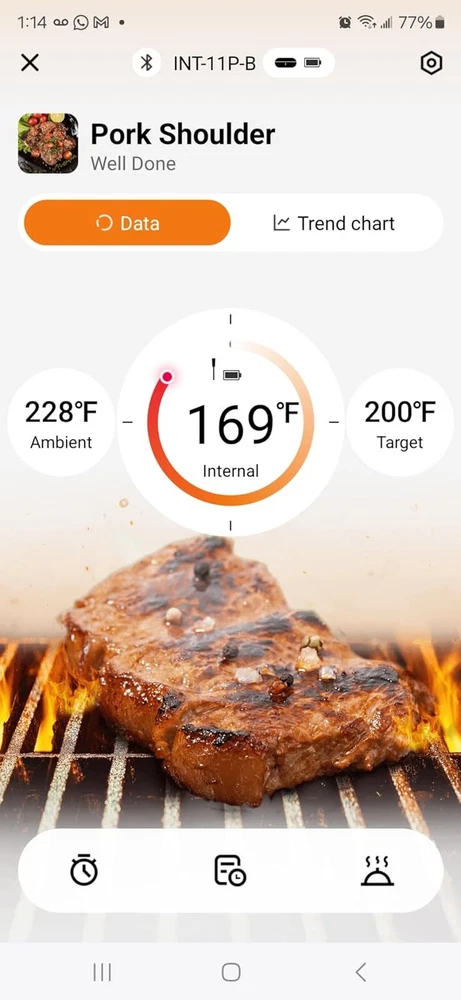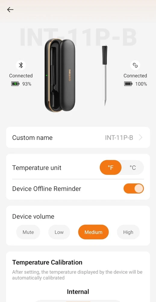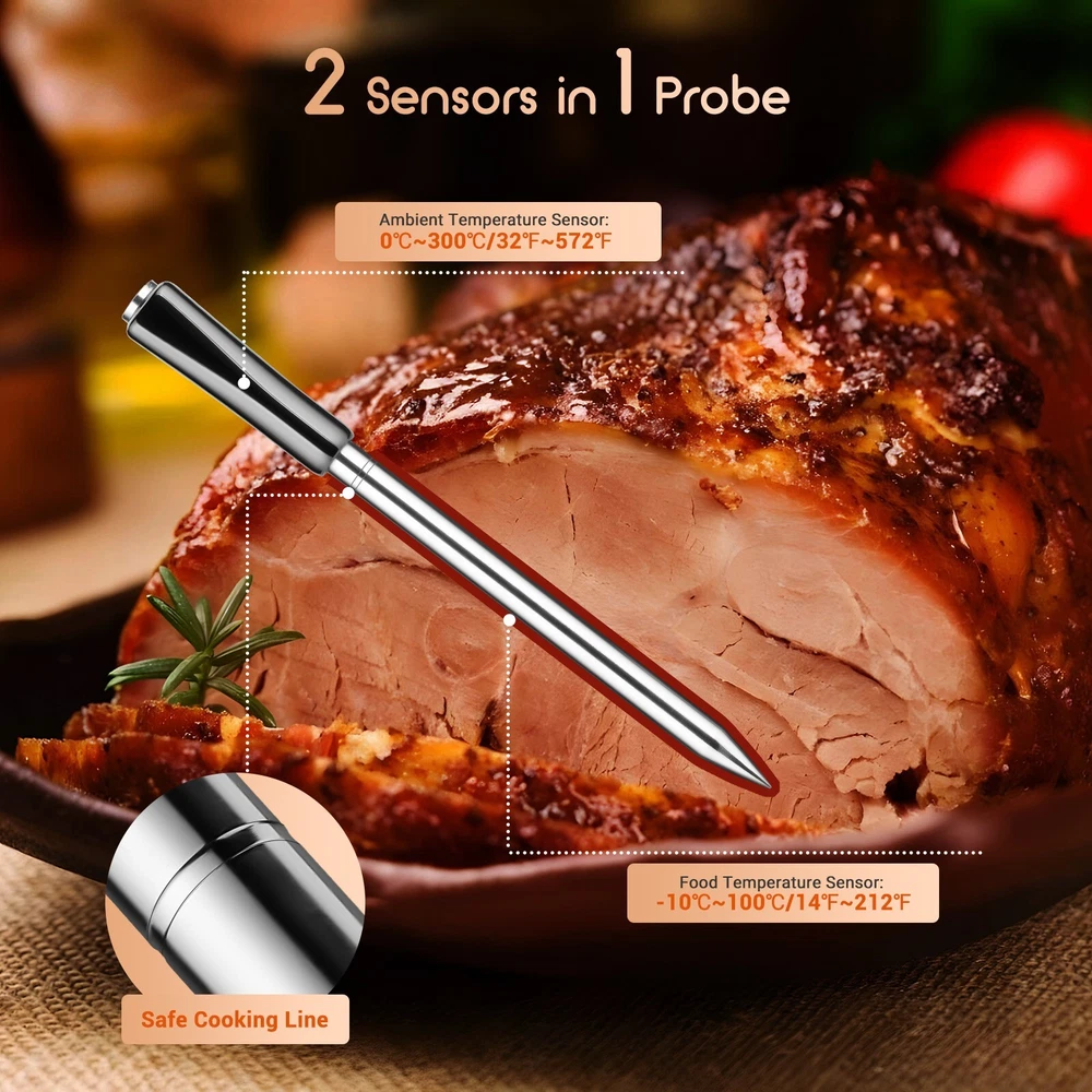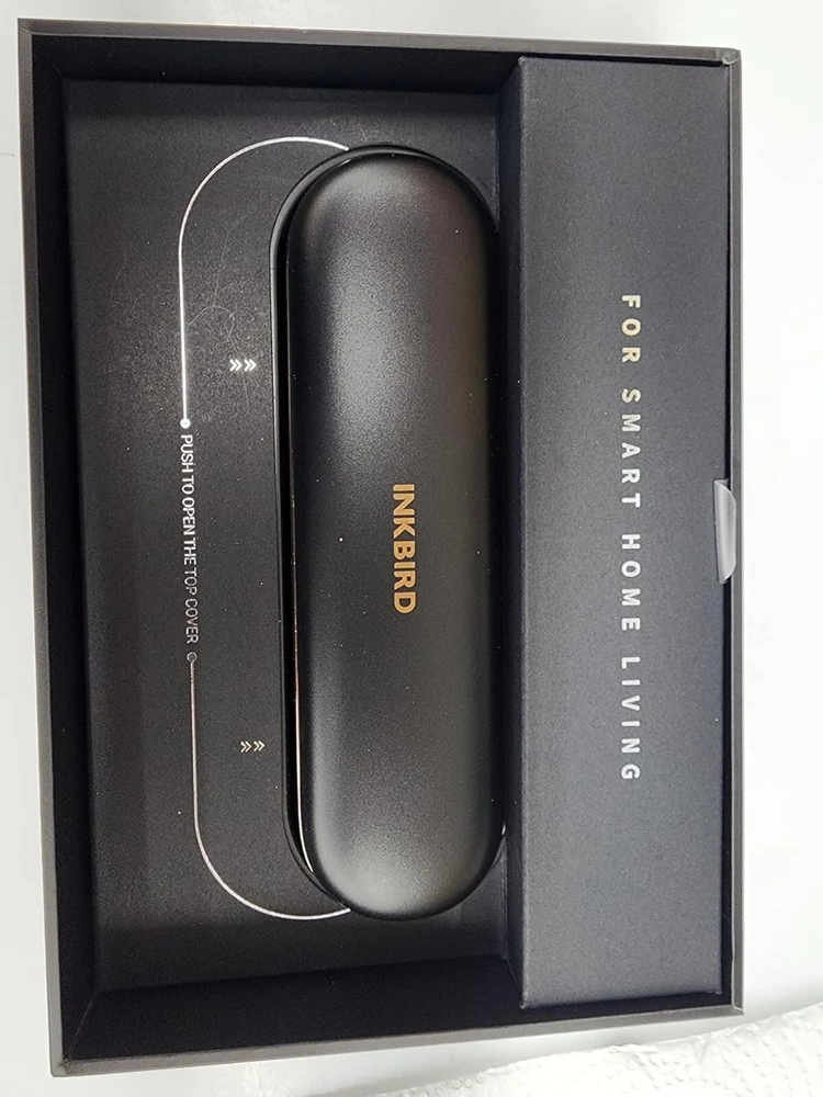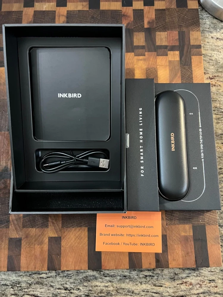 [Charge for 5 mins, Cook for 5 hrs] The grill thermometer dock has a built-in 500mAh lithium battery and can fully charge the probe in just 25 minutes. the wireless thermometer can be used continuously for 25 hours, even in high-temperature environments, making it particularly suitable for overnight cook. This thermometer for cooking is versatile and ideal for use in grills, smokers, ovens, frying pans. (Remember to insert it deep enough and beyond the safe cooking line every time you grill.) [Wireless Meat Probe & Bluetooth 5.1 Connection] This wireless meat thermometer frees you from tangled wires and liberalizes your operation. The advanced Bluetooth 5.1 technology enables you to remotely control and monitor cooking progress at any time over 300ft long distance. Moreover, this meat thermometer can locally store 30 minutes of offline data and automatically synchronize with the App after a Bluetooth connection without lost data. [2-In-1 Temperature Probe] Two temperature sensors at both ends allow the probe to get oven and food temperatures simultaneously. It supports a food temperature range of -10~100℃/14~212℉ and an ambient temperature range of 0~300℃/32~572℉, with a measurement accuracy of ±1℃/±1.8℉. Precise temperature control makes every cut of meat you grill perfectly to your taste, making every meal of daily life a celebration. (Remember to insert it deep enough and beyond the safe cooking line every time you grill.) Package Contents Charging Case*1 Wireless Probe*1 USB-C Charging Cable*1 User Manual*1 You can create, monitor, and optimize the cooking progress through the INKBIRD app, making cooking smarter and simpler. The human-centered App has a preset USDA recommended meat taste list that contains 26 types of meat with custom taste preferences and cooking time and features multiple alarm functions like target temperature alarm, target temperature pre-alarm, high/low-temperature alarm, and count-up/down timer to prevent overcooking and undercooking. [IP67 Waterproof Rating & High-Quality Material ] The food-grade stainless steel probe is rust-resistant and corrosion-resistant and will not affect the original taste of food. The zirconia ceramic handle has high resistance to wear and heat and can withstand a high-temperature environment for a long time. Moreover, the probe has an IP67 high waterproof rating, making it easier to clean and dishwasher safe. ******************************************************************************** *Model: INT-11P-B *Connection Method: BLE 5.1 *Bluetooth Connection Distance: 300ft/91m (without obstacles, for reference only) *Probe Waterproof Rating: IP67 (dishwasher safe) *Sensor Number: 2 sensors of the probe for measuring food temperature and ambient temperature *Probe Measurement Accuracy: ±1℃/±1.8℉ *Temperature Measurement Range: *Food Temperature:-10~100℃/14~212℉ *Ambient Temperature:0~300℃/32~572℉ *Probe Battery Life: 25 hours at high temperature; 7 days at room temperature *Probe Charging Time: 25 minutes for full charge *Probe Response Time: about 3 seconds *Probe Calibration: ±7℃/±12℉ [Charge for 5 mins, Cook for 5 hrs] The grill thermometer dock has a built-in 500mAh lithium battery and can fully charge the probe in just 25 minutes. the wireless thermometer can be used continuously for 25 hours, even in high-temperature environments, making it particularly suitable for overnight cook. This thermometer for cooking is versatile and ideal for use in grills, smokers, ovens, frying pans. (Remember to insert it deep enough and beyond the safe cooking line every time you grill.) *********************************************************************** ****************************************************************** [Wireless Meat Probe & Bluetooth 5.1 Connection] This wireless meat thermometer frees you from tangled wires and liberalizes your operation. The advanced Bluetooth 5.1 technology enables you to remotely control and monitor cooking progress at any time over 300ft long distance. Moreover, this meat thermometer can locally store 30 minutes of offline data and automatically synchronize with the App after a Bluetooth connection without lost data. ======================================================== [2-In-1 Temperature Probe] Two temperature sensors at both ends allow the probe to get oven and food temperatures simultaneously. It supports a food temperature range of -10~100℃/14~212℉ and an ambient temperature range of 0~300℃/32~572℉, with a measurement accuracy of ±1℃/±1.8℉. Precise temperature control makes every cut of meat you grill perfectly to your taste, making every meal of daily life a celebration. (Remember to insert it deep enough and beyond the safe cooking line every time you grill.) Package Contents Charging Case*1 Wireless Probe*1 USB-C Charging Cable*1 User Manual*1 You can create, monitor, and optimize the cooking progress through the INKBIRD app, making cooking smarter and simpler. The human-centered App has a preset USDA recommended meat taste list that contains 26 types of meat with custom taste preferences and cooking time and features multiple alarm functions like target temperature alarm, target temperature pre-alarm, high/low-temperature alarm, and count-up/down timer to prevent overcooking and undercooking. [IP67 Waterproof Rating & High-Quality Material ] The food-grade stainless steel probe is rust-resistant and corrosion-resistant and will not affect the original taste of food. The zirconia ceramic handle has high resistance to wear and heat and can withstand a high-temperature environment for a long time. Moreover, the probe has an IP67 high waterproof rating, making it easier to clean and dishwasher safe. ********************************************************************** ******************************************************************************** Model: INT-11P-B Connection Method: BLE 5.1 Bluetooth Connection Distance: 300ft/91m (without obstacle