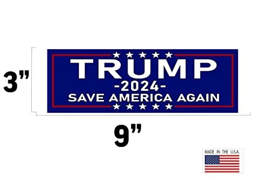 Return Policy Fast Delivery Trusted seller Trump 2024 Save America Again Presidential Election Bumper Sticker Car Decal Conservative Republican USA MAGA Blue 9x3 inch Product Description Donald Trump President 2024 MAGA Bumper Sticker Great Large 9x3 Inch Sticker Car Decal Bumper Sticker Magnet Perfect For Car Truck SUV Boat RV Wall Window Laptop or just about any other Place you can stick it. Indoor or Outdoor Use Made With High Quality Vinyl To Last Gift Idea For Any Republican Conservative Trump Supporter Proudly Made In The USA Shipping Returns Payment Shipping Shipping is FREE to all addresses other than APO/PO boxes in the lower 48 states. All our stock ships from US-based warehouses. Shipped via USPS or UPS (depending on location and package weight) Unless stated otherwise, all orders will ship within 24-72 hours of your payment being processed. Check our feedback to see the great reviews of FAST shipping we offer. Returns Seller does not accept returns Payment We currently accept payment via eBay managed payments only. Once payment is cleared, we will dispatch your shipment within 1-3 business days. Please refer to the "Shipping" tab for more information regarding shipping speed to your destination.