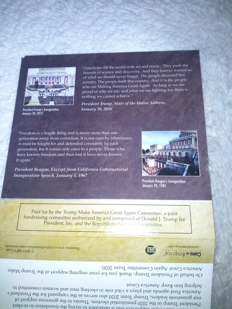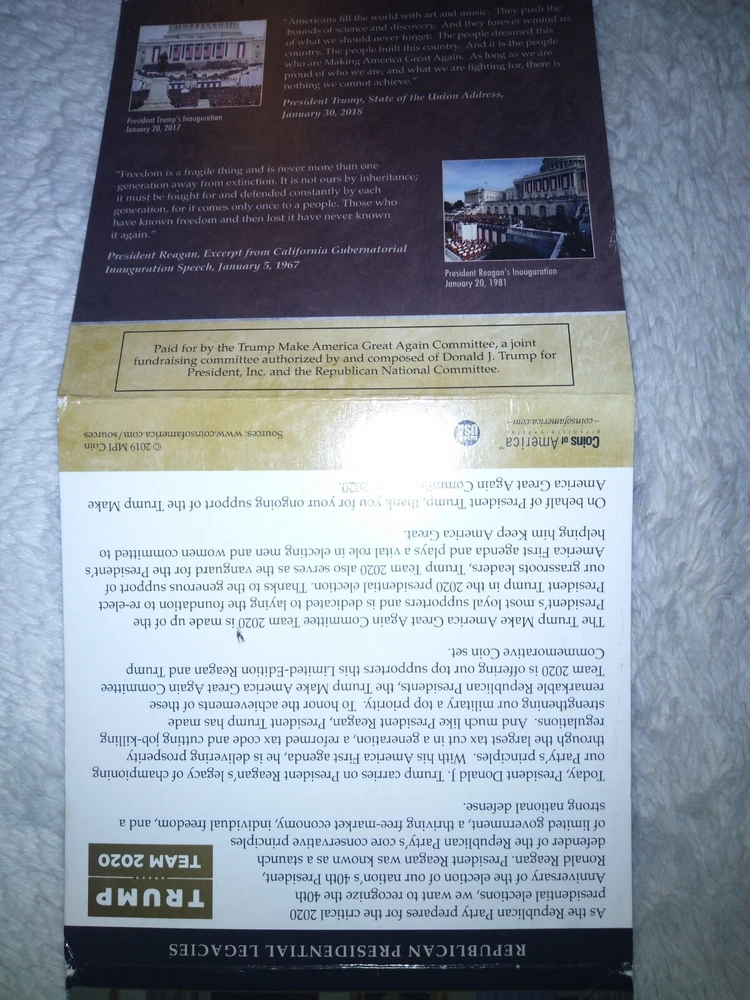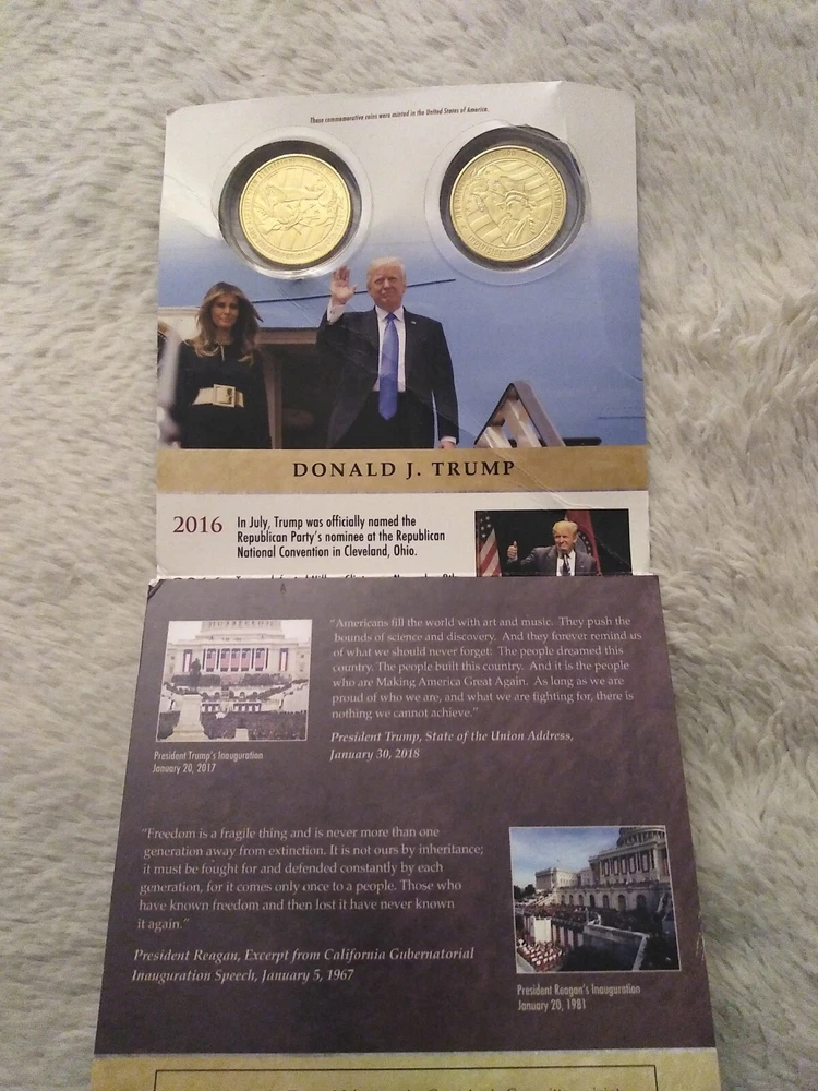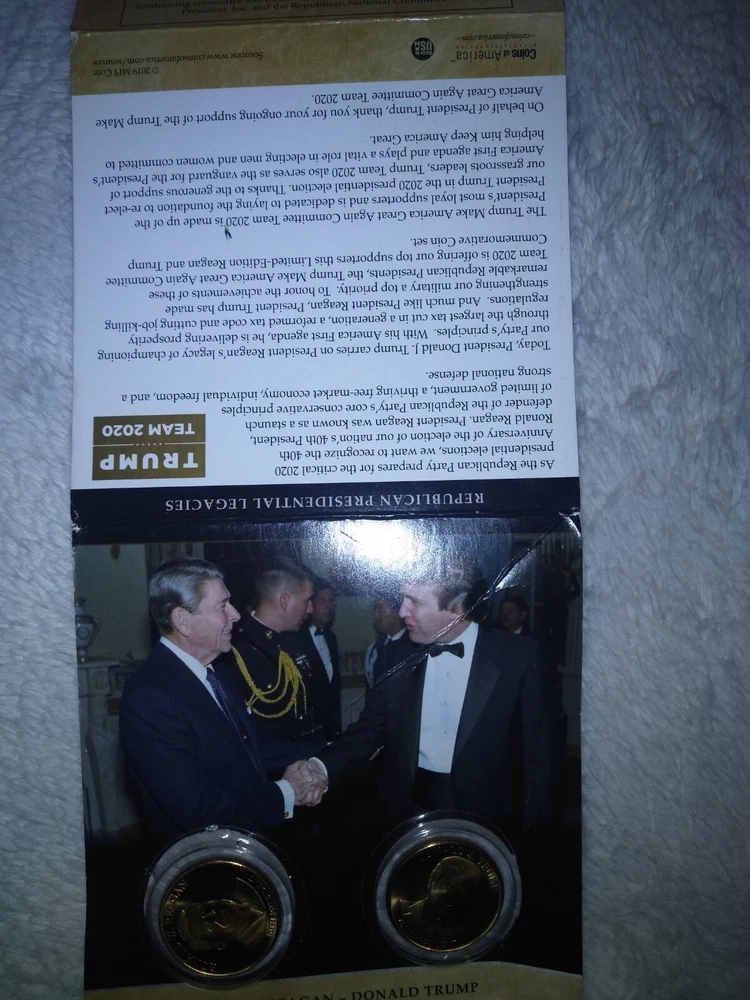 This commemorative coin features the faces of Donald Trump and Ronald Reagan, making it a must-have for any political enthusiast. The coin is a unique piece of historical memorabilia that captures the essence of American politics. It is a great addition to any collection, whether you are a fan of the Republican Party or simply appreciate the art of politics. The coin is a rare find and is perfect for those who love to collect political items. It is a tangible representation of the 2020 presidential campaign and the themes that defined it. The coin is a great way to remember the election and the impact it had on American politics. Add it to your collection today and own a piece of history.