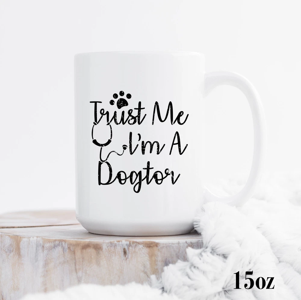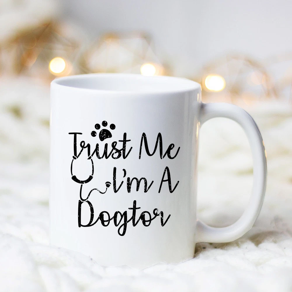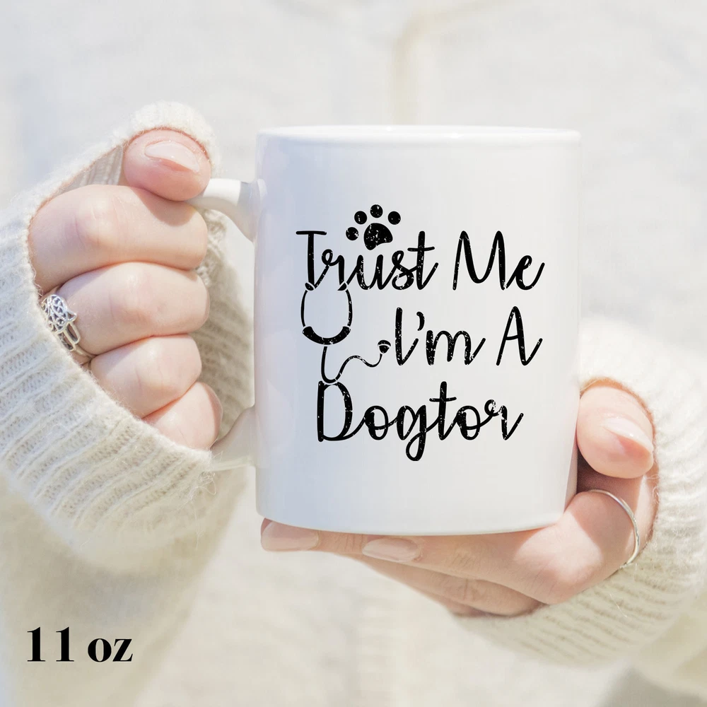 Trust Me I'm A Dogtor Vet Mug Veterinarian Gift Gift For Vet Vet Tech Mug Vet Product Details.. This high quality 11oz. ceramic white mug has a premium hard coat that provides crisp and vibrant color reproduction sure to last for years. Perfect for all hot & cold beverages. The highest quality printing possible is used. It will never fade no matter how many times you wash it. Material: 100% Ceramic. Print both sides. Dishwasher and Microwave Safe. High Gloss + Premium White Finish. Printed in the U.S.A. Personalized & Custom. We support personalized and custom mug to add custom, when placing an order, you can add notes to the "order note" in shipping address section. Also you can contact us directly via message. Shipping Info. Ready to ship in 1 to 2 business days, All products are made-to-order and proudly printed in the United States. Shipped by USPS and DHL, You will receive your order in 5-7 days. Replace & Refund. All products are defective during shipping broken, chipped will be replaced free of charge. You are not satisfied with the product, we will refund 100% money to you. If any other issues arise, please do not hesitate to message, we would be more than happy to assist you.