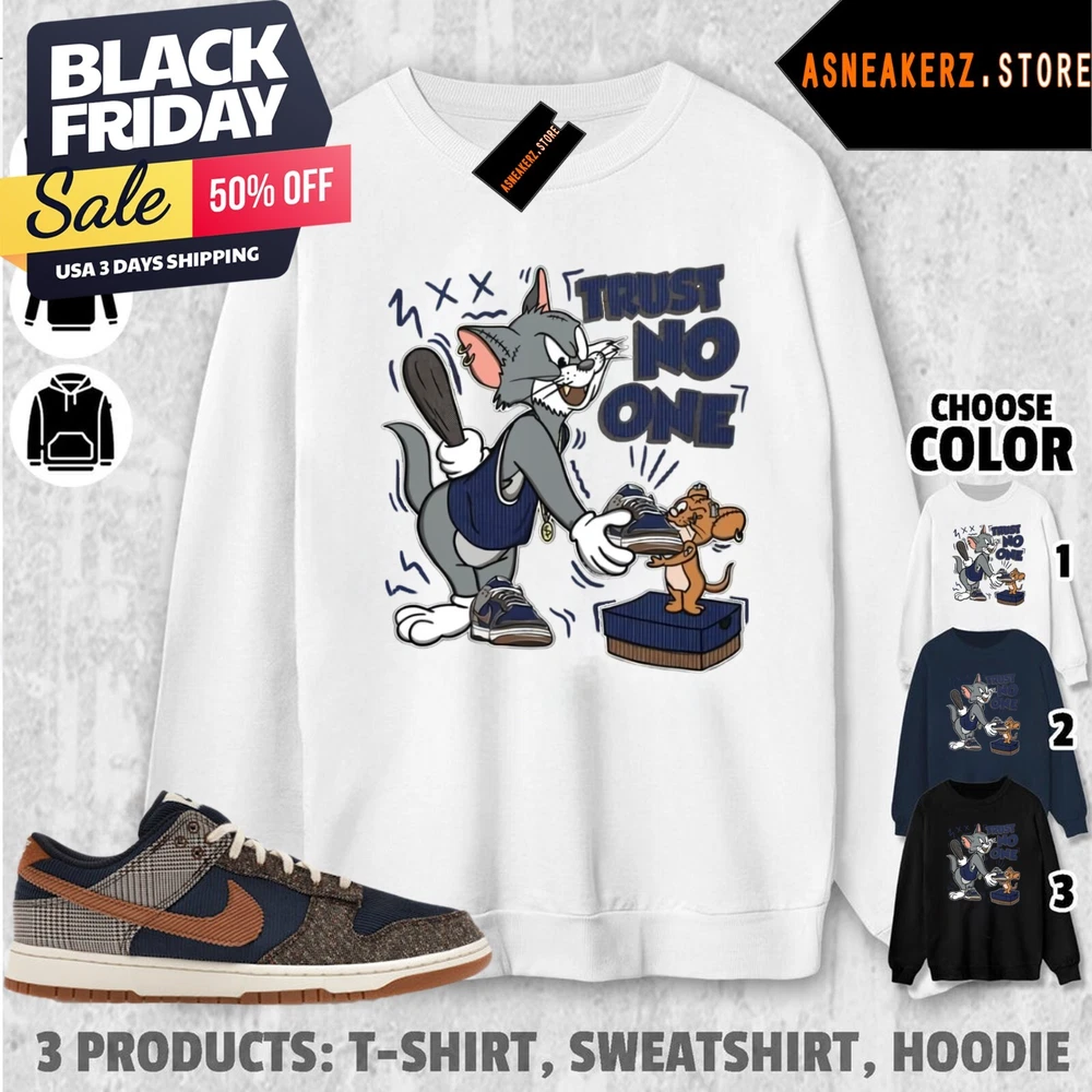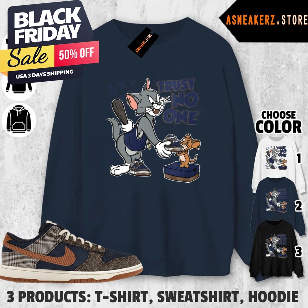 Brand: ASneakerZ.Store Country/Region of Manufacture: United States Vintage: Yes Style: Sneakerhead Performance/Activity: Basketball, Sneakerhead Season: Fall, Spring, Winter Garment Care: Machine Washable Size Type: Regular Size: Choose Your Size Personalize: Yes Features: Sneaker Matching Outfits, Sneaker Matching Tee, Match Sneaker Theme: Dunk Low Tweed Mid Night Navy Corduroy, Dunk Tweed Mid Night Navy Corduroy, Low Tweed Mid Night Navy Corduroy, Tweed Mid Night Navy Corduroy, Tweed Mid Night Navy Corduroy Dunk Sleeve Length: Long Sleeve Material: Polyester Character: Trust No One Cat And Mouse, Tom And Jerry, Sneakerhead, Jordan Type: Sweatshirt Fit: Regular Department: Unisex Adults Color: Multicolor Pattern: Solid