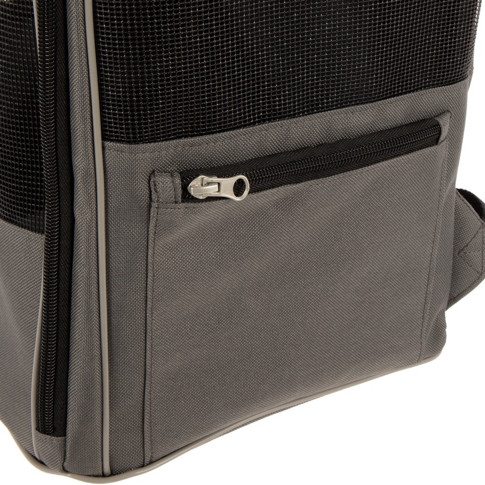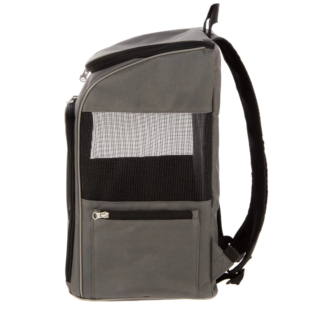 TrustyPup® Medium Gray Cat and Dog Travel Pet Backpack will have you transporting your pet in style and comfort. A removable, washable plush liner cradles your pet, while the stability board provides a stable surface to stand on. Coated mesh panels supply ample airflow and give your pet a lookout window while out and about. Locking zippers prevents your pet from pawing the zipper open. A zippered storage pocket can conveniently carry pet travel accessories. Great for hikes, running errands, travel, and going about town. Ideal for smaller cats and dogs weighing 16 lb (7 kg) or less. Medium Backpack: Meant for standing pets that measure up to 9.5" (24 cm) from the floor to the top of their back and 16" (42 cm) from base of tail to front of chest, and weighing at most 16 lbs (7 kg); round up weight and measurements, do not exceed capacity limits for pet's safety Convenient Storage: Zippered storage pocket holds pet and pet parent accessories such as a phone, keys, collapsible bowls, treats, waste bags, leash, important pet travel documents, etc. Optimal Airflow: Coated mesh panels stand up to claws and offer ventilation for your pet as well as a convenient window to look in on your pet without opening the carrier Comfort: Luxurious faux lambswool liner offers a cushy surface for your pet to lounge on; wide adjustable backpack straps for pet parent comfort Features: Locking zippers help to ensure pet does not claw open the carrier; stability board gives soft-sided carrier a solid base for pets