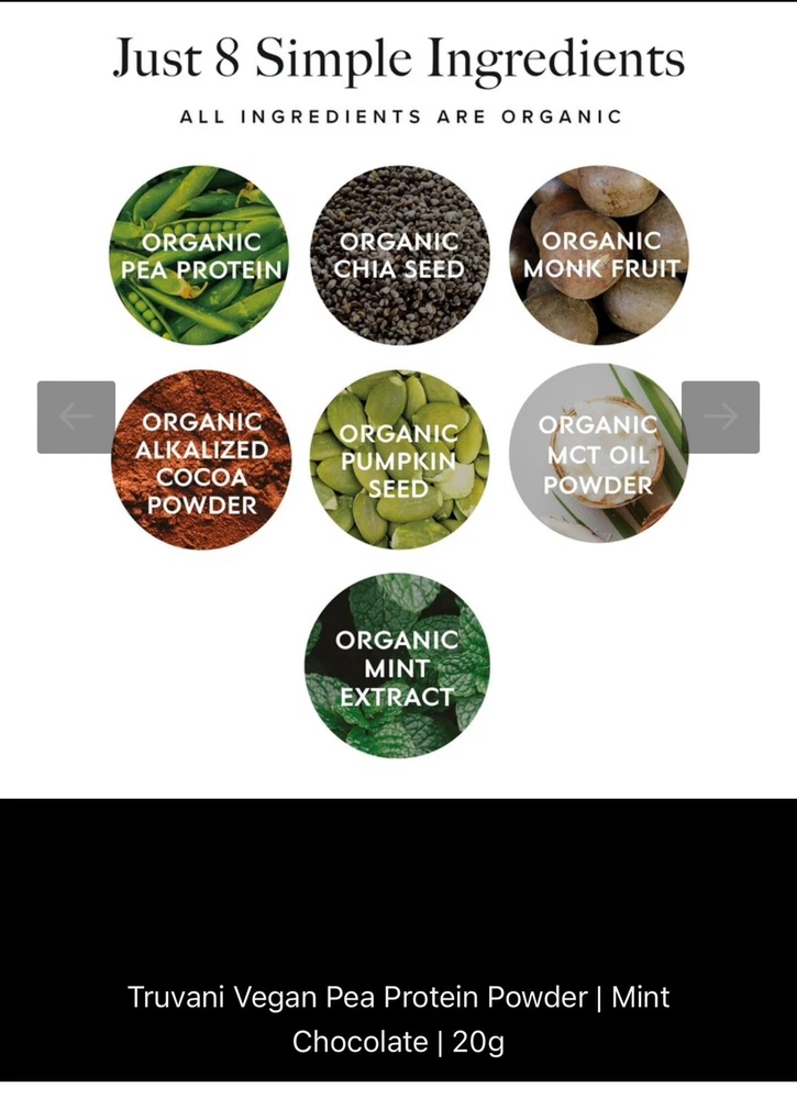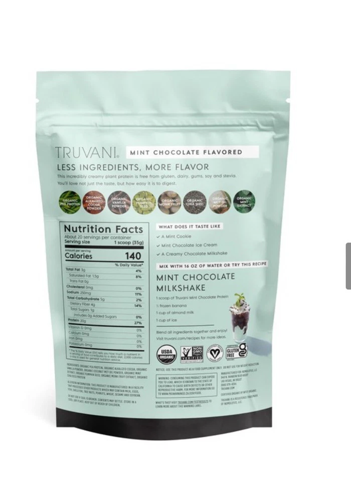 Truvani Vegan Pea Protein Powder | Mint Chocolate | 20g Organic Plant Based. Premium, Hand-Selected Ingredients: Elevate your health with Truvani plant-protein powder, crafted with premium ingredients to support a clean and vibrant lifestyle. Indulge guilt-free in a variety of decadent flavors, all made with vegan ingredients. Truvani is ideal for those with dietary restrictions or sensitivities, promoting digestive wellness. Clean Formula, Free of Additives & Fillers: Experience pure nutrition with Truvani plant-based protein powder, free from artificial sweeteners, useless additives, and weird fillers. Our formula excludes soy, wheat, dairy, gluten, and stevia, ensuring a clean and wholesome blend. Enjoy the sweetness of organic monk fruit without added sugars. Certified USDA Organic: Trust in the integrity of our plant-based vegan protein powder, certified USDA Organic, non-GMO, and vegan-friendly. Our straightforward label and simple ingredients ensure transparency and quality. Protein sourced from all organic pea, pumpkin seed, and chia seed. Delicious Vegan Protein Shake: Elevate your daily routine with a delicious protein boost from Truvani plant protein powder. Our smooth blend delivers rich flavors without a chalky or grainy texture, making every sip enjoyable. Each serving has 120-140 calories to help you hit your fitness goals.