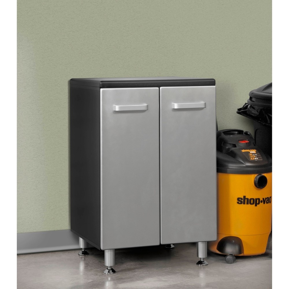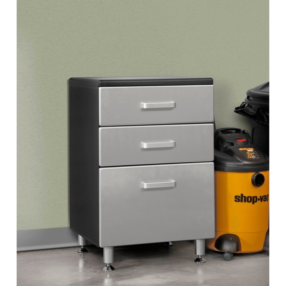The Tuff Stor Garage Storage Cabinet combines versatility, durability, and attractive design to create a clean and organized storage system. With two sturdy shelves measuring 22 inches wide by 19 inches deep you will be able to store almost everything, even larger items. One of the shelves is removable or adjustable. Since many garage floors are not totally level, each item comes with four attractive aluminum extruded and adjustable feet that elevate and allow you to level your system and keep it safe from water and road grime. The oversized, industrial aluminum door pulls are both sturdy and easily accessed. The doors are painted with an attractive silver, metallic finish. The three drawers feature metal ball bearing full extension slides and a solid medium density fiber board Free Shipping Over $49.99* Details Tuff Stor Model 24206 Garage Storage Cabinet with Two Doors and Three Drawers Product Description: The Tuff Stor Garage Storage Cabinet combines versatility, durability, and attractive design to create a clean and organized storage system. With two sturdy shelves measuring 22 inches wide by 19 inches deep you will be able to store almost everything, even larger items. One of the shelves is removable or adjustable. Since many garage floors are not totally level, each item comes with four attractive aluminum extruded and adjustable feet that elevate and allow you to level your system and keep it safe from water and road grime. The oversized, industrial aluminum door pulls are both sturdy and easily accessed. The doors are painted with an attractive silver, metallic finish. The three drawers feature metal ball bearing full extension slides and a solid medium density fiber board botttom.