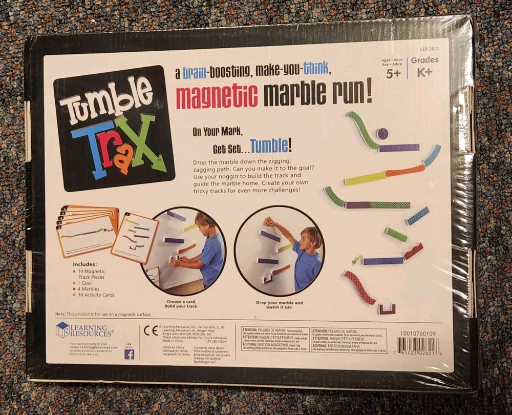 This Learning Resources Tumble Trax Magnetic Marble Run set includes 29 pieces designed to boost brain function through STEM learning. With a focus on developing engineering skills, children aged 5 and up can explore the world of magnetism while constructing exciting marble run tracks. The set is brand new and sealed in its original packaging.