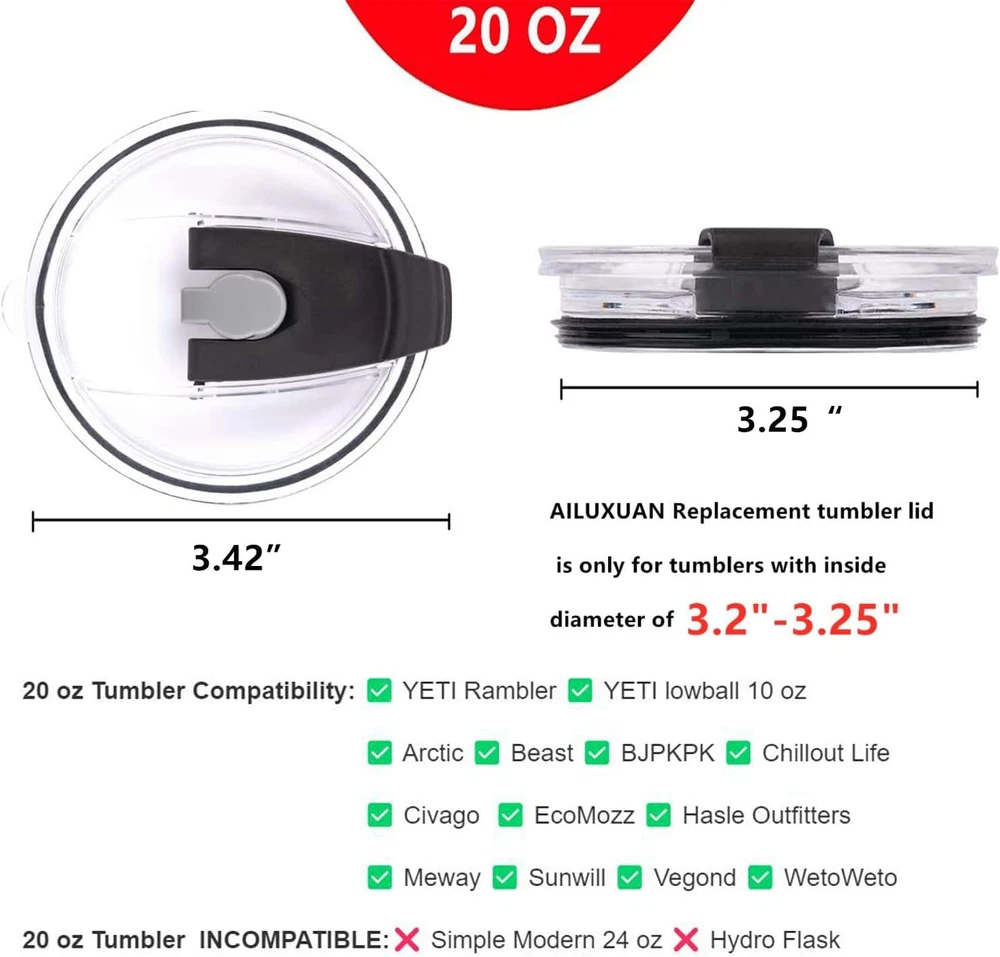 Store New Arrivals Add to Favorite View Feedback Contact Tumbler Lid for 20 Oz,2 Replacement Lids for 20Oz Stainless Steel Tumbler Travel Cup Yeti,Ozark Trails and More Cooler Cup, Flip-Top Splash Proof (Black, 20 OZ) (2) Description Item model number lids-Y02 Closure Type Flip Top Style Modern Is Microwaveable No Number of Pieces 2 Part Number lids-Y02 Color Black Material Plastic Country of Origin China Is Dishwasher Safe Yes Item Weight 0.08 Kilograms Shape Round Batteries Required? No Package Dimensions 6.65 x 3.86 x 1.85 inches Included Components 2pcs 20OZ Replacement Lids SPILL-PROOF: Spill proof tumbler lid designed with a unique vacuum sealed technology that's airtight keeps your drink insulated longer; No more worry about spill especially when carry a hot beverage in the bag or driving.(Lid is Not fit for RTIC Tumbler) EASY TO OPEN AND CLOSE : 20 OZ tumber lids flip-top mechanism allows you open and close the the slid tag easily which also can keep your drink insulated longer.Designed with an air hole on top of slider according to airflow ergonomics.Easy to clean 20 oz TUMBLER COMPATIBILITY: 20 oz replacement lids fit for tumbler with a mouth diameter of 3.07-3.23 inches.Such as fit for yeti rambler, Atlin, Koodee,Beast, Juro, SUNWILL, Umite Chef tumbler(Note!! It is NOT for RTIC Tumbler,Simple Modern 24 oz ) PREMIUM MATERIAL:20 OZ Replacement Lid is Made of crystal clear plastic, lid can be in touch with the drinks directly.Easy to clean, dishwasher safe.These premium spill proof lids also designed to be a straw stainless steel straight straw and bent straws WHAT YOU WILL GET:Including 2* Black spill proof and splash resistant tumbler lids, 20 oz.The replacement tumbler lids passed seal test during production process, but still can't ensure compatible with all cups, About 1% cup is incompatible Product Description Tumbler Lids Spillproof 20 Oz,2 Replacement Lids for 20 oz YETI Rambler, ,BPA Free & Straw Friendly,Spill-proof Lids,Covers for 20 Ounce Tumbler Cup Trendy and modern design: New Design:The top adds a vent that can insert a straw, also balance the internal and external pressure, more convenient and easier to open. Very Practical Function:Splash Resistant Yeti tumbler lids has a silicone gasket lining the edge to prevent splashing and major spillage while turning over the tumbler, and keep your drink insulated longer. The 20 oz replacement lid is fit for tumblers with a mouth inches diameter of 3.3 inches . Such as yeti rambler, Atlin, Beast, Juro, SUNWILL, Umite Chef tumbler( Please Note!! This replacement lid is not for RTIC tumbler ).Before Purchasing,please refer to the picture detail size. Why Choose AILUXUAN replacement Tumbler lids? 100% safe material, Made of food-grade transparent crystal, safe and durable Sliding lid design for easy opening/closing This tumbler lid will not hit you nose when you drink The hole in the top of the lid allows direct drinking or use with a straw Keep drinks clean and reduce splashes Dishwasher safe Features: Contoured sip hole allows for directsipping or for use with a straw. The sliding closure is made from New crystal clearplastic, which helps reducing spill and splashing. Color: crystal clear. Material: AS crystal clearplastic. Warm Tip: Please carefully confirm the inner diameter of the cupbefore ordering to ensure a perfect fit. Widely Application: COMPATIBLE (✓)Fit for : 20 oz tumbler lid fit for yeti rambler, Atlin, Beast, SUNWILL,Juro, Umite Chef tumbler. In addition and 12 oz coffee mug. INCOMPATIBLE (✗)Not Fit for : RTIC tumbler.It's hard to enumerate all sizes of cups individuatly, so pleasemeasure your cup caliber carefully before purchasing. ABOUT US We offer the best prices around on high quality products. Our E-store includes media such as books, movies, music and games while offering electronics, toys, sporting apparel, clothing, tools, general home, garden items and more. SHIPPING We are always working hard to ensure your package arrives as soon as possible. Please understand that some factors like weather, high postal traffic, and the performance of shipping companies are outside of our control. We offer free shipping to the lower 48 states and ship within 2 business days of payment, usually sooner. We do not accept P.O. Boxes. Please provide a physical address. For shipping outside of the continental USA, we only use eBay's Global Shipping Program.The item is shipped to KY and then sent to the rest of the world. International customers are responsible for all duties and taxes. Continue to check out in order to calculate costs for shipping the item to your country. Messages regarding eBay's Global Shipping Program MUST be directed at eBay EXCLUSIVELY. RETURNS We offer a 30-Day Return Policy on items which you are not completely satisfied with. You have the option for a full-refund or an exchange of the item. No returns are available on items shipped outside of the USA. PAYMENT We accept PayPal. CONTACT US This page content is yet to come Please ad us to your favorite seller and visit again later Thank You CUSTOMER SATISFACTION We try our very best to make sure every customer is completely satisfied. If there's a problem, message us! We're happy to help. WE ACCEPT Copyright © 2021 AutoDS. | All Rights Reserved