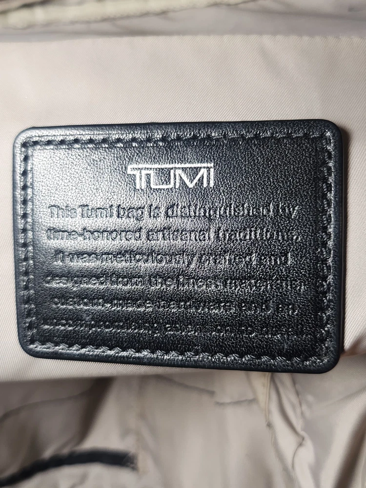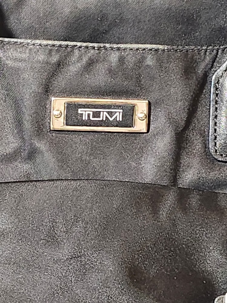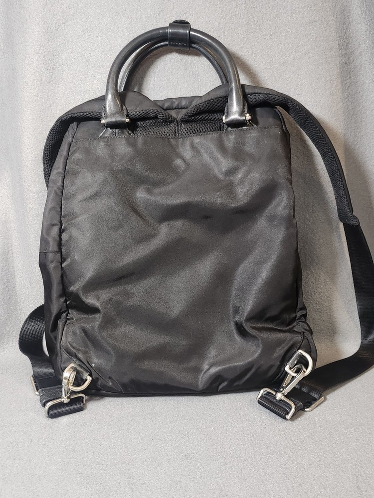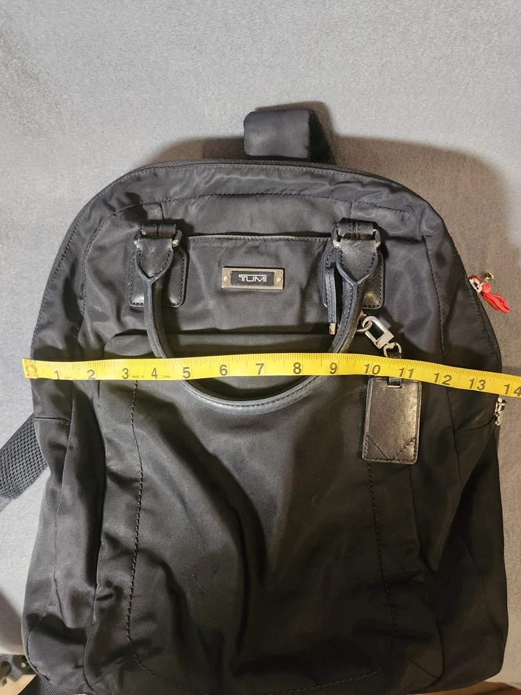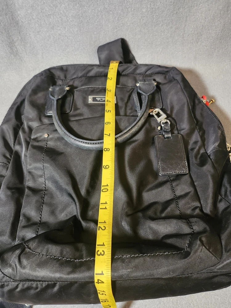 High quality black nylon Tumi 2 way backpack. Plenty of room in the spacious compartment for storing all essentials. Zippered interior and exterior pockets. Can be carried by strap or used as a backpack with adjustable straps. Nice, sturdy hardware. There are ink stains in the interior (see photos), which are not visible from the outside and do not distract from the overall functionality.