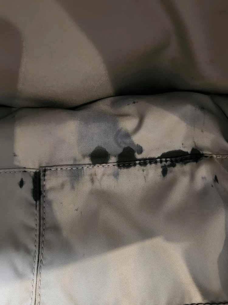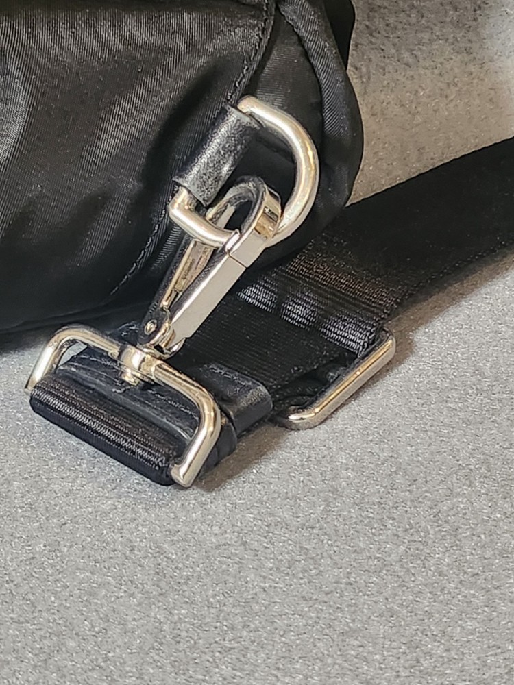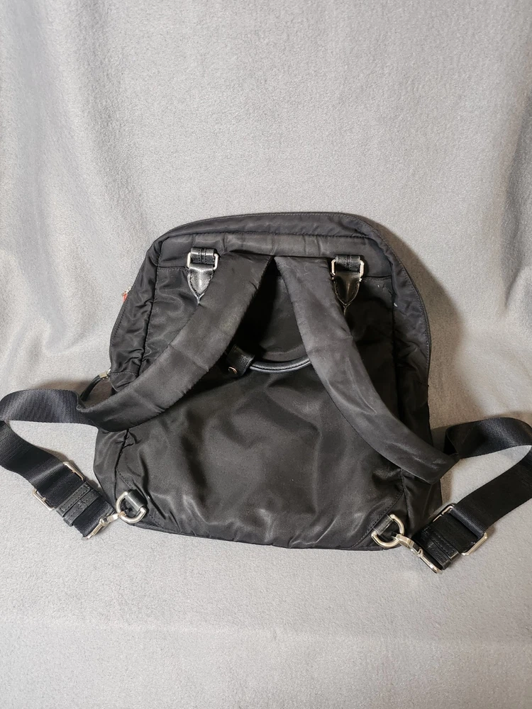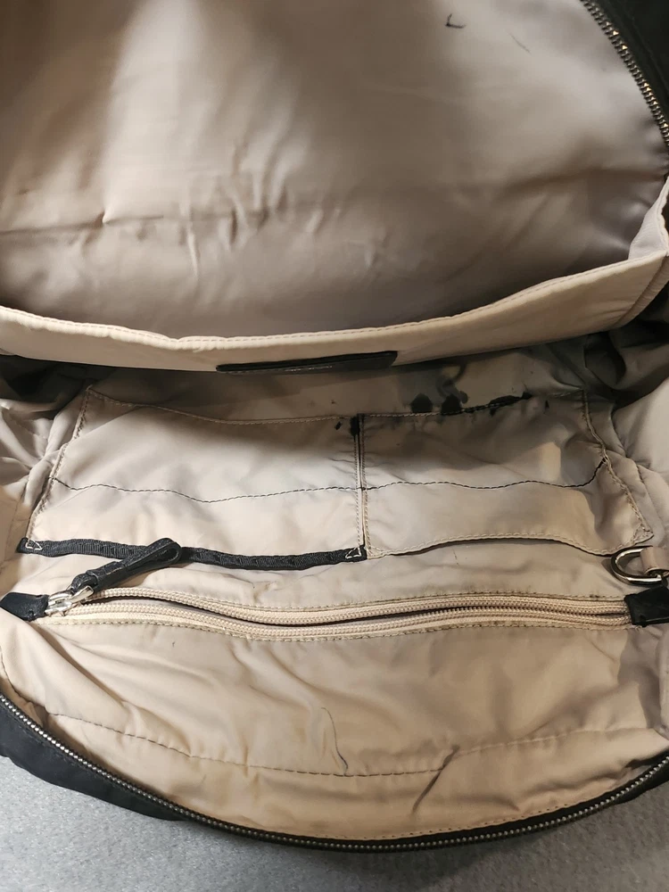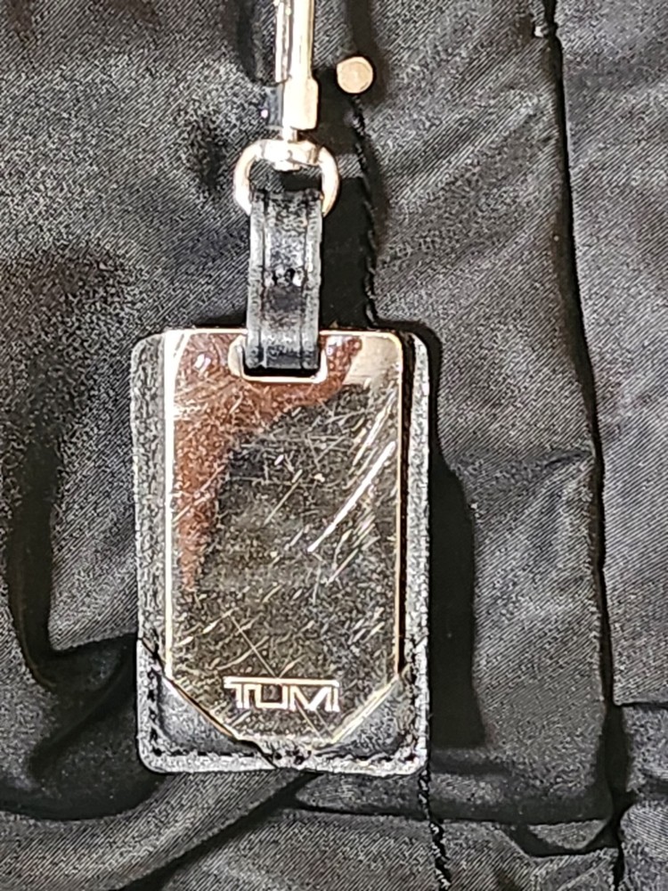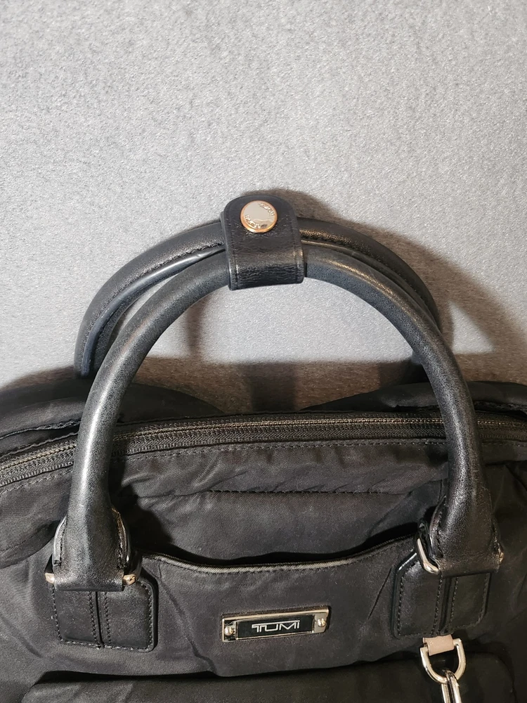High quality black nylon Tumi 2 way backpack. Plenty of room in the spacious compartment for storing all essentials. Zippered interior and exterior pockets. Can be carried by strap or used as a backpack with adjustable straps. Nice, sturdy hardware. There are ink stains in the interior (see photos), which are not visible from the outside and do not distract from the overall functionality.