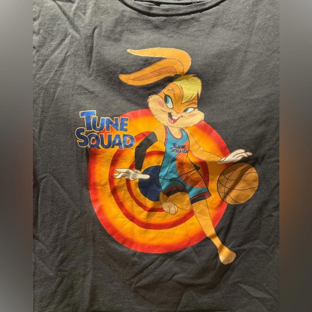 Bring the nostalgia of Space Jam to your wardrobe with this Lola Bunny Tune Squad Crop Top! Featuring a vibrant licensed graphic of Lola Bunny in action, this short-sleeve crop top is perfect for fans of Looney Tunes and retro style. Made from a soft and breathable cotton-polyester blend, it offers comfort and stretch for everyday wear or casual outings. Whether you’re rocking it with high-waisted jeans or athleisure wear, this piece is sure to make a statement. Details: • Color: Black • Crew Neck • Short Sleeve • Licensed Space Jam Graphic featuring Lola Bunny • Material: 60% Cotton, 40% Polyester • Condition: Pre-loved, gently worn Pair this crop top with sneakers for a sporty vibe or layer it with a jacket for a chic, retro look. Perfect for fans of vintage aesthetics and Y2K trends! Measurements: measured flat Sleeve: 5” Length shoulder to hem: 18” Pit to pit: 17”