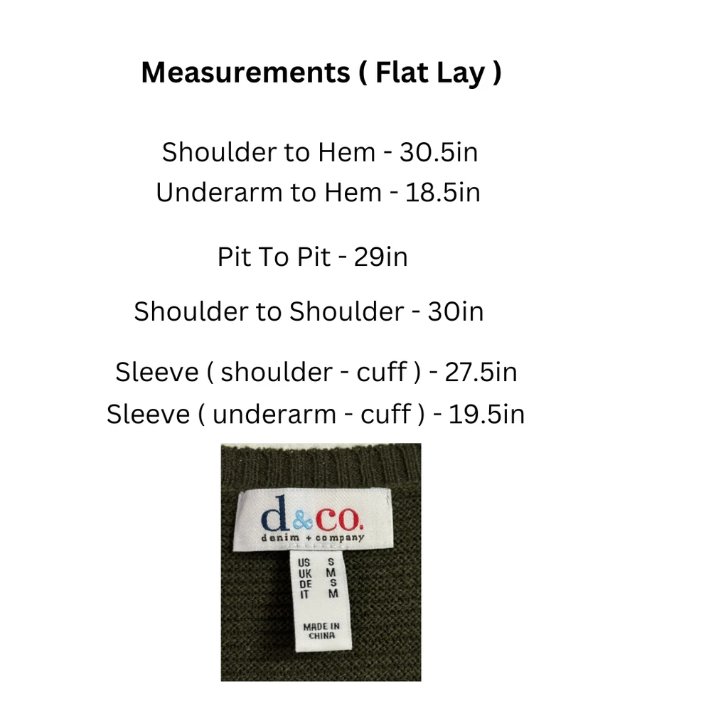 Tunic Women's V-Neck Green Two-Pocket Oversize Relaxed-Fit Sweater. : Brand : D & CO ( Denim & Co ) Condition : Pre-Owned ( No Odors / No Stains ) : Size : S : Measurements : See Picture # 2 Care Instructions : See Picture # 3 : Thank you for your interest. : Shipping : - Sweater will be securely packaged in a cushioned polymailer. - Mailed Within 3 Business Days.