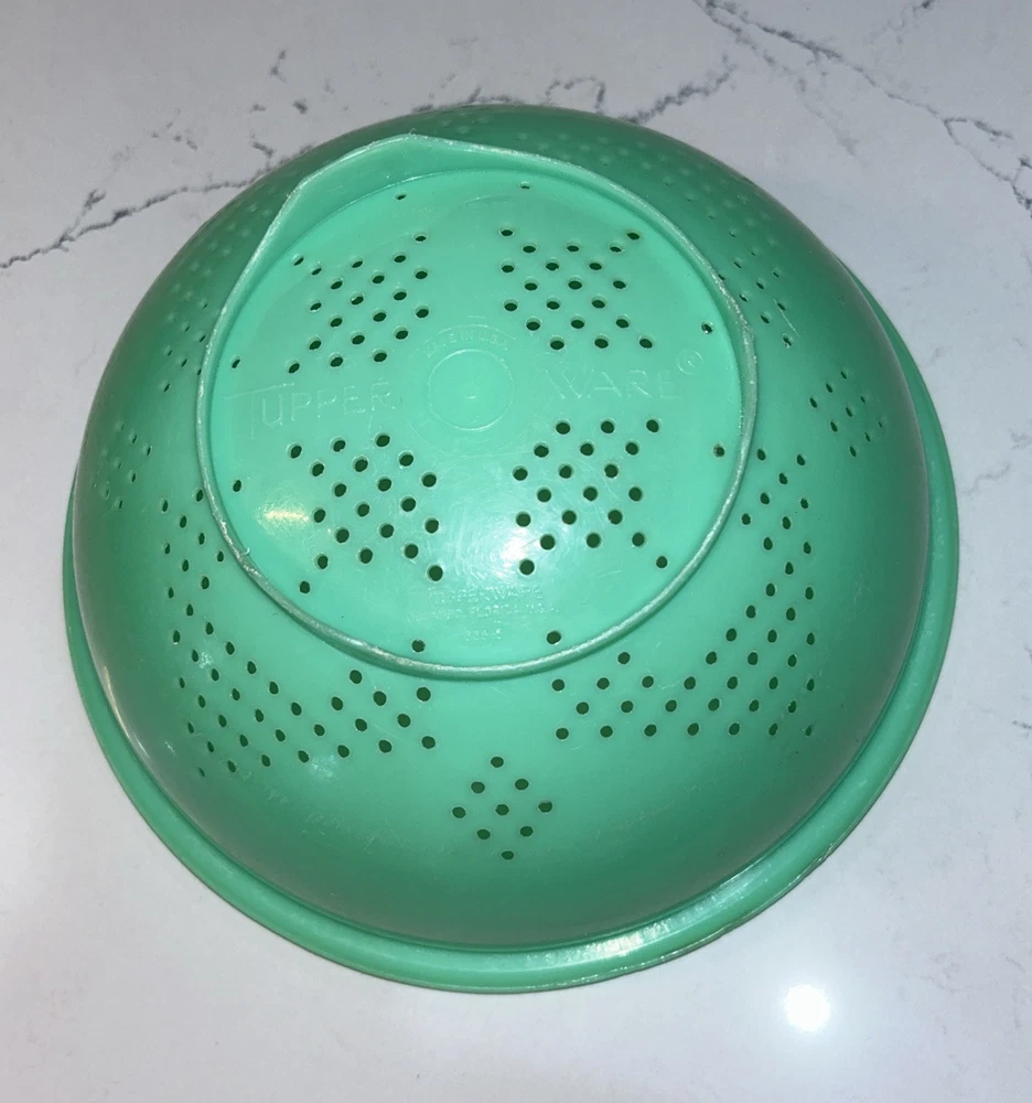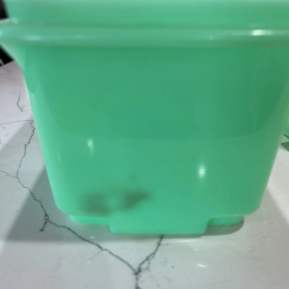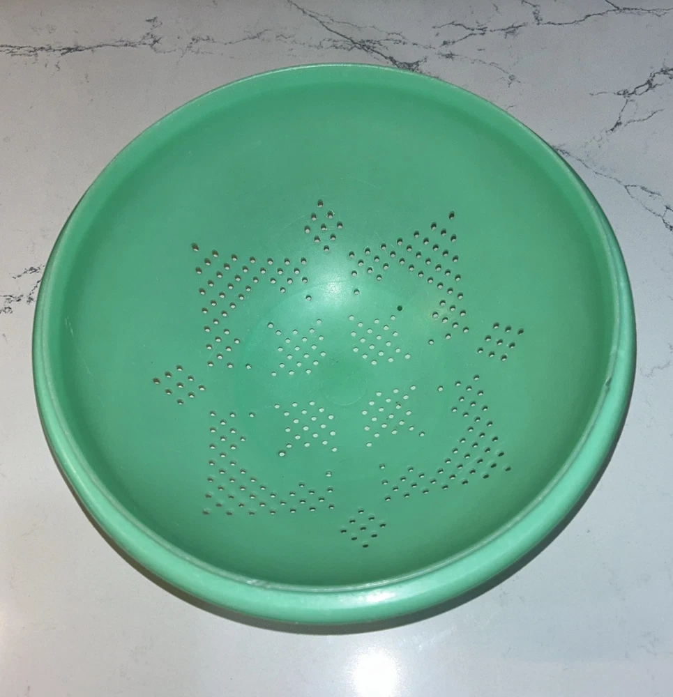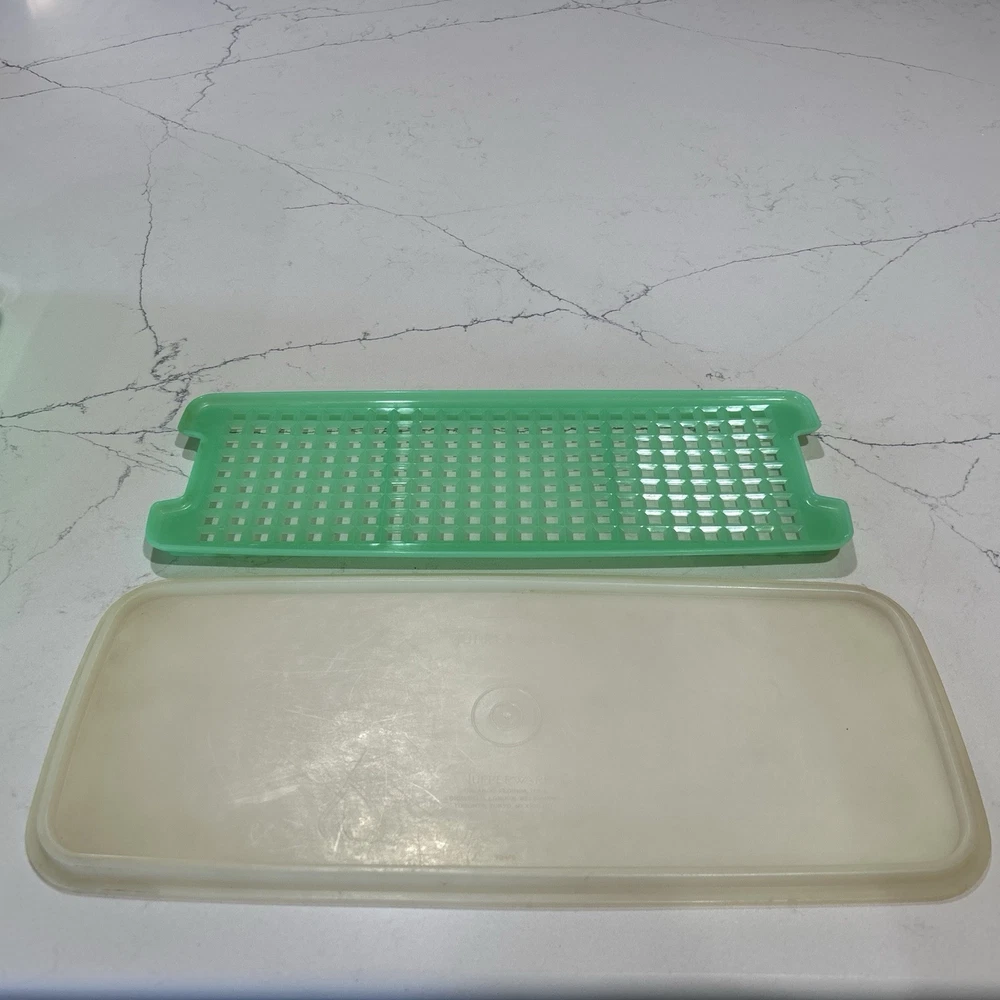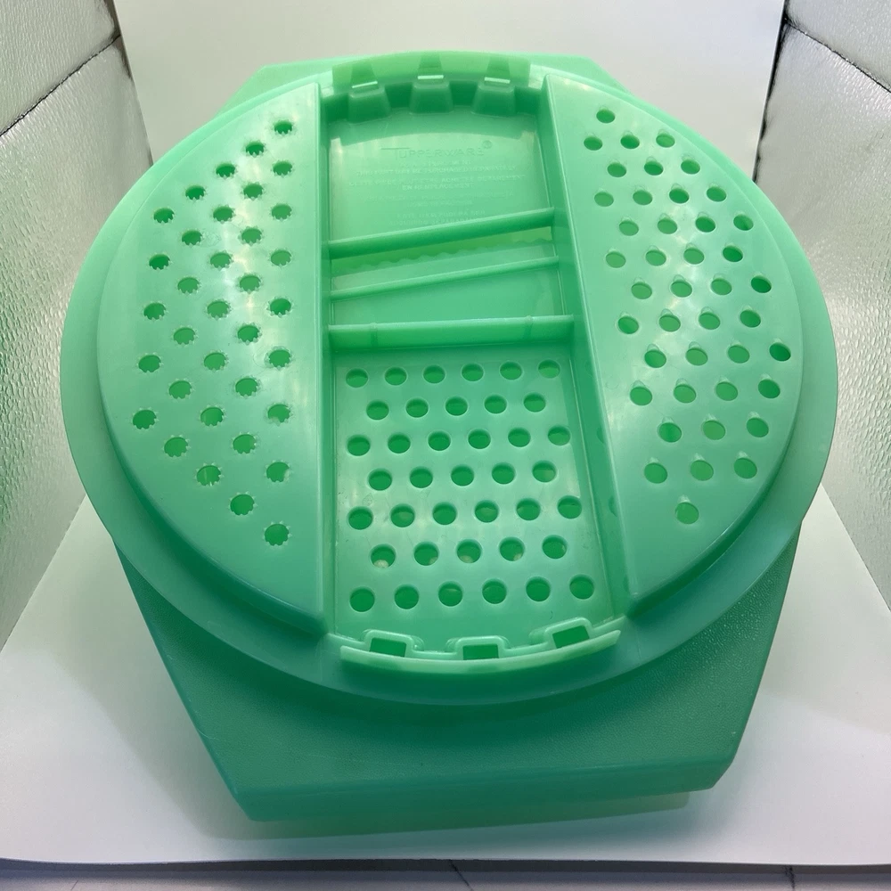 This vintage Tupperware storage container set is a must-have for any kitchen! The set includes 9 items, with a variety of shapes and sizes to fit all your storage needs. The containers are made of durable plastic and feature a solid green color, with a retro/vintage style that adds a touch of charm to your kitchen. The set includes a lettuce crisper, veggie crisper, bread container, grater, and strainer, as well as lids with an airtight seal to keep your food fresh and easy to clean. These containers are an original Tupperware product, made in the United States, and are in excellent condition. Don't miss out on this unique and practical collectible! Please note any imperfections, discoloration, scratches, etc. in the photos. Will provide more photos upon request. Listing 1499