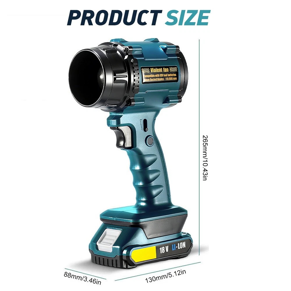 Turbo Blower Cordless Super Power Mini Air Duster For Car Drying Cleaning Fan Product Description Features 70mm Turbo Fan: Storm-Force Performance: A 12-blade, 70mm turbo fan + boost tech creates 60m/s max wind speed and 600–650G thrust, easily tackling dust, leaves, snow, and heavy debris. All-Purpose Utility: Perfect for industrial dust removal (workshops, machines), outdoor leaf/snow clearing (yards, roads, greenhouses), and creative wind effects (photo shoots, cosplay events). Wireless Freedom & Long Battery Life: Runs on a 5-cell 7500mAh battery—12 hours of low-speed runtime or 15 minutes of high-speed blasting. No cords, total mobility. Stepless Speed Adjustment: Smoothly adjust wind speed from 0 to 3300, adapting to gentle airflow (e.g., cooling) or intense blasting (e.g., heavy debris). Lightweight ABS Durability: Built with rugged ABS plastic, it’s lightweight for fatigue-free use yet tough enough for daily heavy-duty tasks. Use Cases Industrial Environments: Blasts dust, slag, and gravel from factory floors, machinery, and workbenches. Outdoor Care: Clears fallen leaves from gardens/roads and snow from cars, pathways, or greenhouse roofs. Creative & Daily Tasks: Generates wind effects for photo studios, cools outdoor spaces, or assists in quick drying. Specifications Voltage: 12V Max Power: ~1200W Rated Power: 500W Thrust (Full Charge): 600–650G Motor Speed: 0–3300/min Max Wind Speed: 60m/s Battery: 5-Cell 18650 Battery Pack Runtime: Low Speed (≈12h) | High Speed (≈15min) Charge Time: 8–14 h Material: ABS Color: Blue Package Contents 1 x Turbo Air Blower 1 x Battery 1 x Data Cable Payment Policy Shipping Policy Returns Policy Contact Us Payment Policy We accept pay ment via PayPal, DebitCard, Visa, MasterCard, Discover etc. Shipping Policy 1. We strive to ship all items within 1-2 business days of receiving payment. 2. Please make sure the correct Ship-To address is entered before checking out. Once the payment is completed, you may not be able to change the shipping address. 3. If there are any issue s with your order, including delayed delivery or loss, please don't hesitate to contact us. Returns Policy 1. We offer a 30-day free return policy for all purchases. 2. Please contact us first to arrange the return details for any items that need to be returned. 3. For any Ex change, Refund or Return, the item must be in its original condition, including the box, packaging, and all the accessories or gifts. Contact Us 1. Customer satisfaction is very important to us and our feedback rating reflects this satisfaction. If you have any question or concern, please contact us via eBay message. 2. We respond to all eBay messages as quickly as possible. There would be time difference, non-working hours or public holidays that have prevented us from making an instant response. Thank you for your patience and understanding. Copyright © 2023 Dianxiaomi