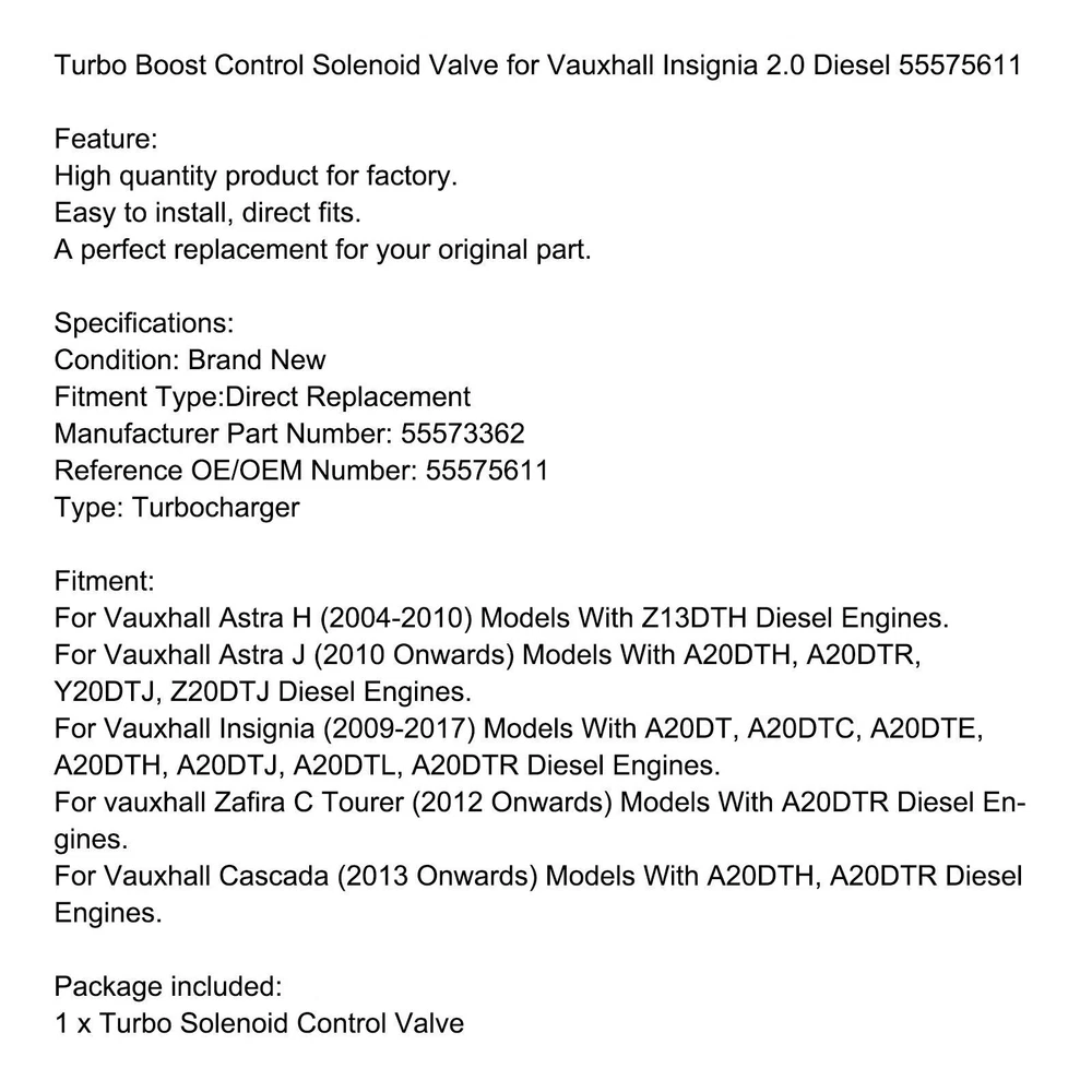 Air Filter Cleaner For Motorcycle Sportster 1200 Custom XL1200C Low XL883L USA 28.13 USD Free shipping 50x Small M5 5mm Motorcycle Fairing Spring Clips Speed Spire Nuts Clip U Nut 16.79 USD Free shipping CNC Adjustable Kickstand Side Stand Fit HONDA CBR 600 1000 RR 600RR 1000RR 35.99 USD Free shipping ABS Anti-Lock Brake Pump Assembly 57110-T2F-L22 for Honda Accord Sport 2.4L 2014 582.79 USD Free shipping 116PCS Allen Screw & washer kit For Sportster XL 883/1200 2004+ Engine Covers 44.69 USD Free shipping 0B5 DL501 Transmission Valve Body For Audi VW Porsche 629.99 USD Free shipping 50cc Cylinder Piston Gasket Kit For Yamaha YW50F YW50FX Zuma 50F 4T 2012-2019 58.7 USD 61.79 USD Free shipping 5% off Pulsing Electrical Coil AM105573 AUC15118 For John Deere 325 335 345 425 445 455 24.92 USD Free shipping Gbox Detent Kit for Porsche Transmission 996 997GT3 Boxster S Fixes 2ND Gear WR 18.99 USD Free shipping Traction Side Tank Pad Gas Knee Grip For Honda CBR1000RR 08-13 CBR600RR 03-06 ⏳ 11.87 USD Free shipping Fuel Return Line Hose Pipe Injector Hose Leak Line Fit BMW 3 5 6 7 X3 X5 X6 48.79 USD Free shipping FUEL PUMP FUSE RELAY fit for Yamaha YZF R1 R6 FZ1 Fazer FZ8-N Naked 5VK-81950-40 28.99 USD Free shipping A Fantastic Shop Send us a message Our Store Seller Profile Feedbacks Save this seller Contact Turbo Boost Control Solenoid Valve for Vauxhall Insignia 2.0 Diesel 55575611 Turbo Boost Control Solenoid Valve for Vauxhall Insignia 2.0 Diesel 55575611 Feature: High quantity product for factory. Easy to install, direct fits. A perfect replacement for your original part. Specifications: Condition: Brand New Fitment Type:Direct Replacement Manufacturer Part Number: 55573362 Reference OE/OEM Number: 55575611 Type: Turbocharger Fitment: For Vauxhall Astra H (2004-2010) Models With Z13DTH Diesel Engines. For Vauxhall Astra J (2010 Onwards) Models With A20DTH, A20DTR, Y20DTJ, Z20DTJ Diesel Engines. For Vauxhall Insignia (2009-2017) Models With A20DT, A20DTC, A20DTE, A20DTH, A20DTJ, A20DTL, A20DTR Diesel Engines. For vauxhall Zafira C Tourer (2012 Onwards) Models With A20DTR Diesel Engines. For Vauxhall Cascada (2013 Onwards) Models With A20DTH, A20DTR Diesel Engines. Package included: 1 x Turbo Solenoid Control Valve About US About Our Items We strive to describe all items accurately and thoroughly, with the utmost care and attention to detail. However, to ensure a mutually satisfactory transaction, we kindly ask for your assistance in thoroughly reviewing the item description and photos, and addressing any questions before placing a bid. Customer Satisfaction We stand behind our commitment with exceptional service, a 100% money-back guarantee, and a dedication to customer satisfaction. I am readily available to address any inquiries or concerns you may have, both before and after your purchase. Our aim is to ensure your shopping experience is enjoyable and that you're delighted with your purchase. Feedback Your feedback is crucial to our business's success. If you're satisfied with your purchase and the service you received, we would greatly appreciate your positive feedback, along with an overall Detailed Selling Rating (DSR) of 5. Please take a moment to leave us positive feedback. Our eBay account is set up to automatically reciprocate positive feedback once yours is received. If you're considering leaving neutral/negative feedback or opening an eBay/PayPal case, we encourage you to reach out to us immediately. We're committed to resolving any issues to the best of our ability. Shipping Parcel will be shipped using Standard shipping method. For security purposes, items will be shipped exclusively to the confirmed address on Paypal. Please ensure your Shipping address is up to date before proceeding with payment. Estimated delivery time within the United States ranges from 3 to 10 business days, depending on your location. Returns We accept returns within 60 days from the date the buyer receives the item. If the item is found to be defective upon receipt, the customer has up to 30 days from the date of receipt to request an exchange for a new item or a refund. For returns due to a change of mind, we accept items in their original selling condition. However, if the package has been opened due to a mistaken order, it does not qualify for our return policy. Please note that the buyer is responsible for covering the cost of return postage. If you encounter any issues, please reach out to us via eBay message, and we'll respond within 24 hours. Turbo Solenoid Valve For Buick Chevrolet Cadillac 55573259 55559239 55574902 16.79 USD Free shipping 3.5" Black High Flow Turbo Intake Elbow For GM 6.6L LML Duramax Diesel 11-16 109.87 USD Free shipping New Turbo Turbocharger for Honda Civic CR-V 1.5L L15B7 2016-2021 49373-07011 US 269.99 USD Free shipping 2PCS Air Duct Seal To Turbocharger 6420940480 6420940580 Fit Mercedes! 13.79 USD Free shipping 2PC TiAL MV-S 38mm Wastegate V-Band Clamp Set Kit with Screws Nuts and Seals YU 32.77 USD Free shipping Charge Pipe C Clip Fit For BMW N54 N55 335i 535i 535xi 335xi 335is 135 UE 11.21 USD Free shipping Electronic Turbocharger Actuator for Jaguar / Land Rover 2.2D 49477-01214 108.99 USD Free shipping Windscreen Washer Motor Pump 8260A008 For Mitsubishi L200 YU 14.79 USD Free shipping NEW Turbo Turbocharger Fit Fiat Viaggio Bravo Ottimo 1.4T-Jet 55235154 807072 US 139.99 USD Free shipping New Turbo Electric Actuator For Audi A6 EA888 Gen3 2.0T 06L145612L 70597387 75.79 USD Free shipping Turbo Boost Solenoid Valve for BMW F01 750I E90 335I E60 535I 11747626350 YU 29.79 USD Free shipping Turbocharger Wastegate Actuator 04E145725CM 49180-18821 for VW Golf Passat 90.99 USD Free shipping
